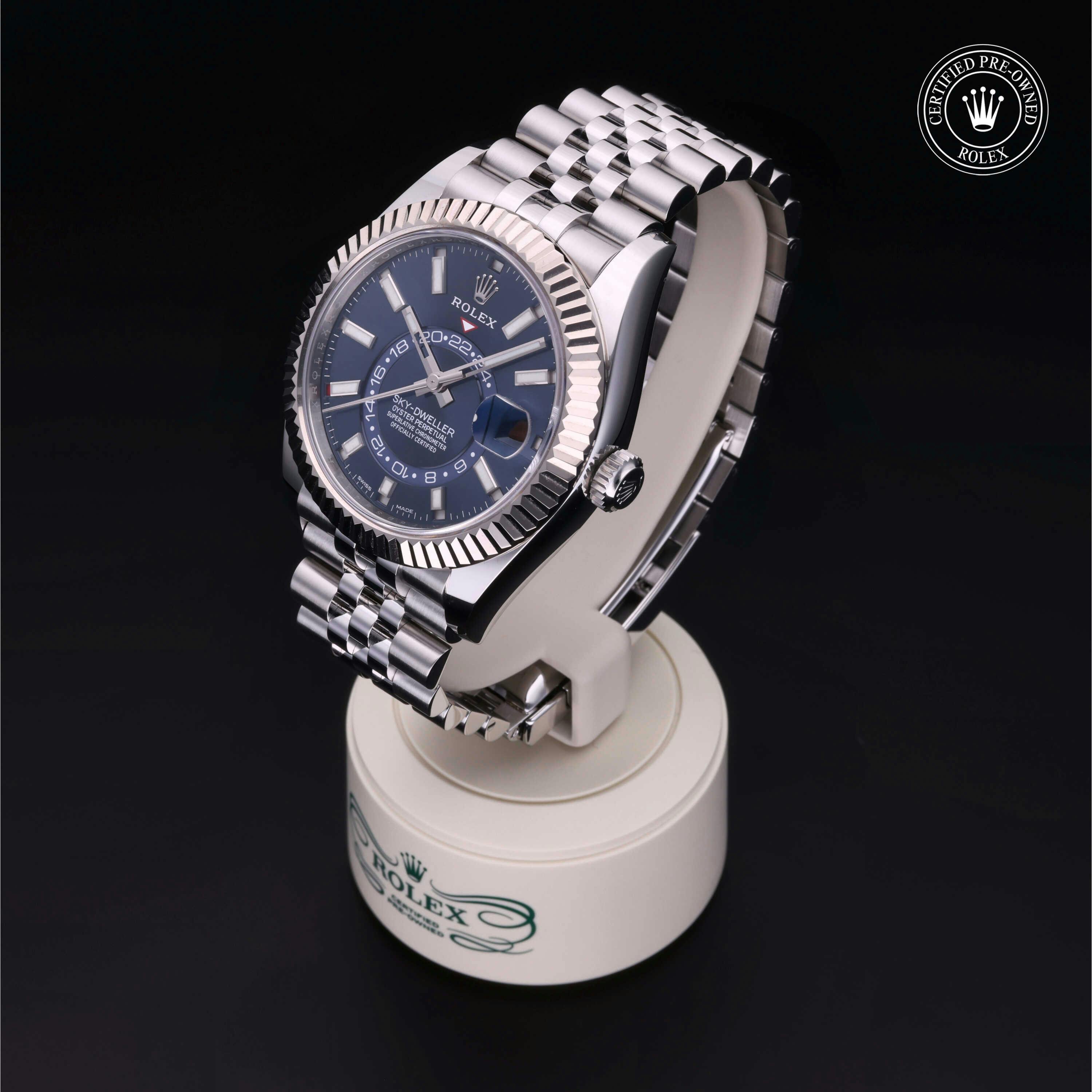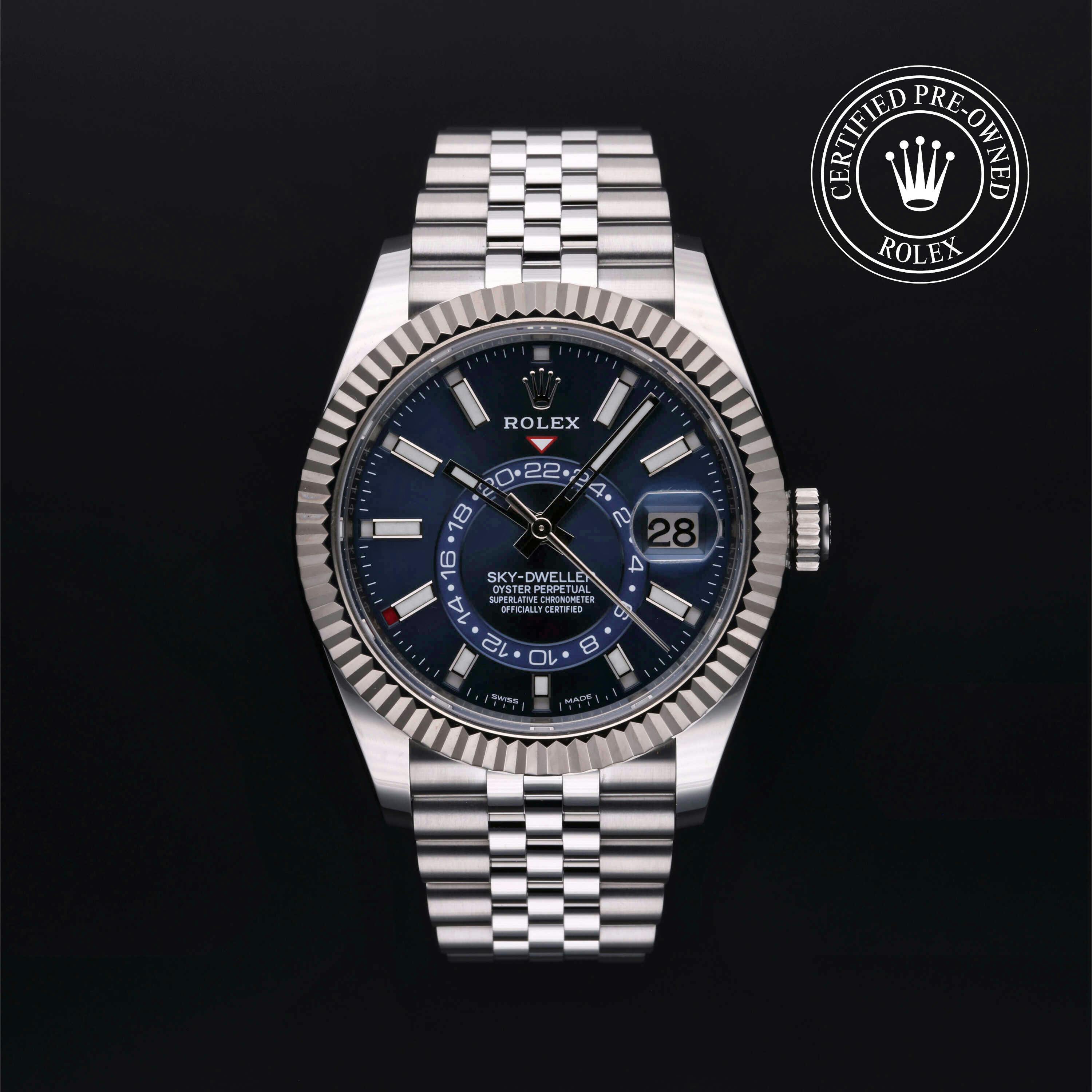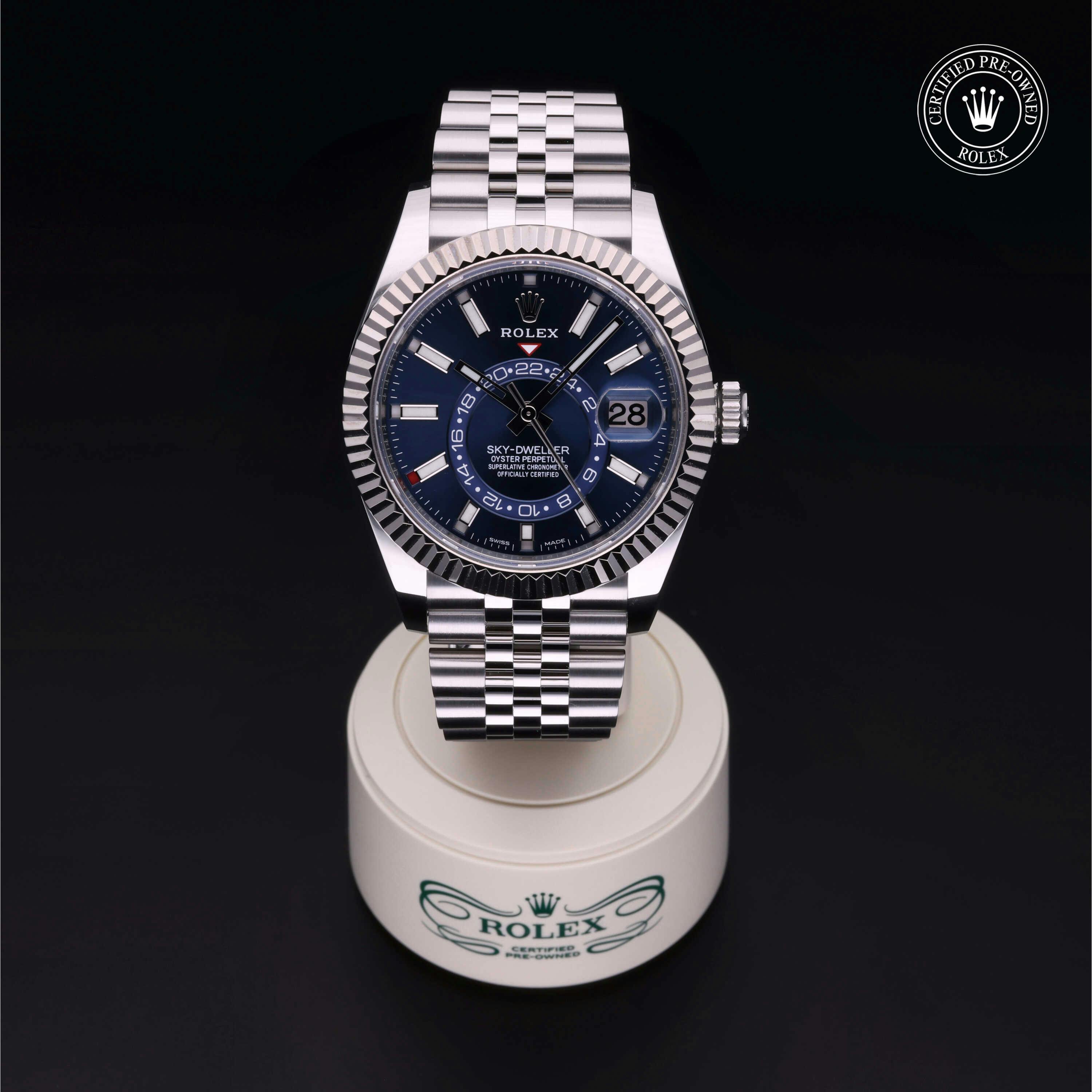 Pre-Owned Rolex Sky-Dweller (326934) self - winding automatic watch, features a 42mm stainless steel case surrounding a blue dial on a strap. Functions include hours, minutes, seconds, date, annual calendar, gmt/world time, month This watch has been serviced and comes with papers. Time remaining on the Manufacturer's service warranty! This watch will be ready to ship in 5-7 days!