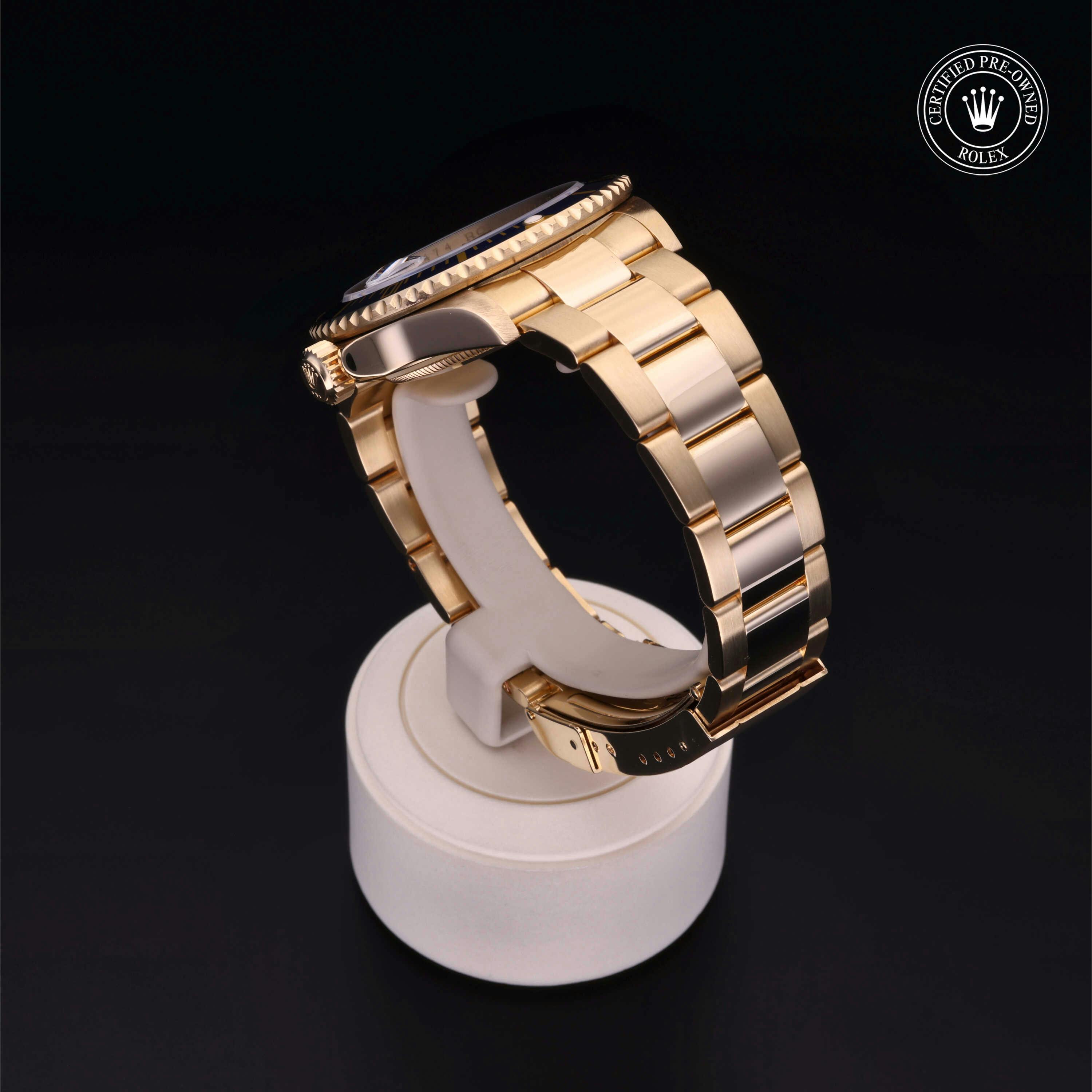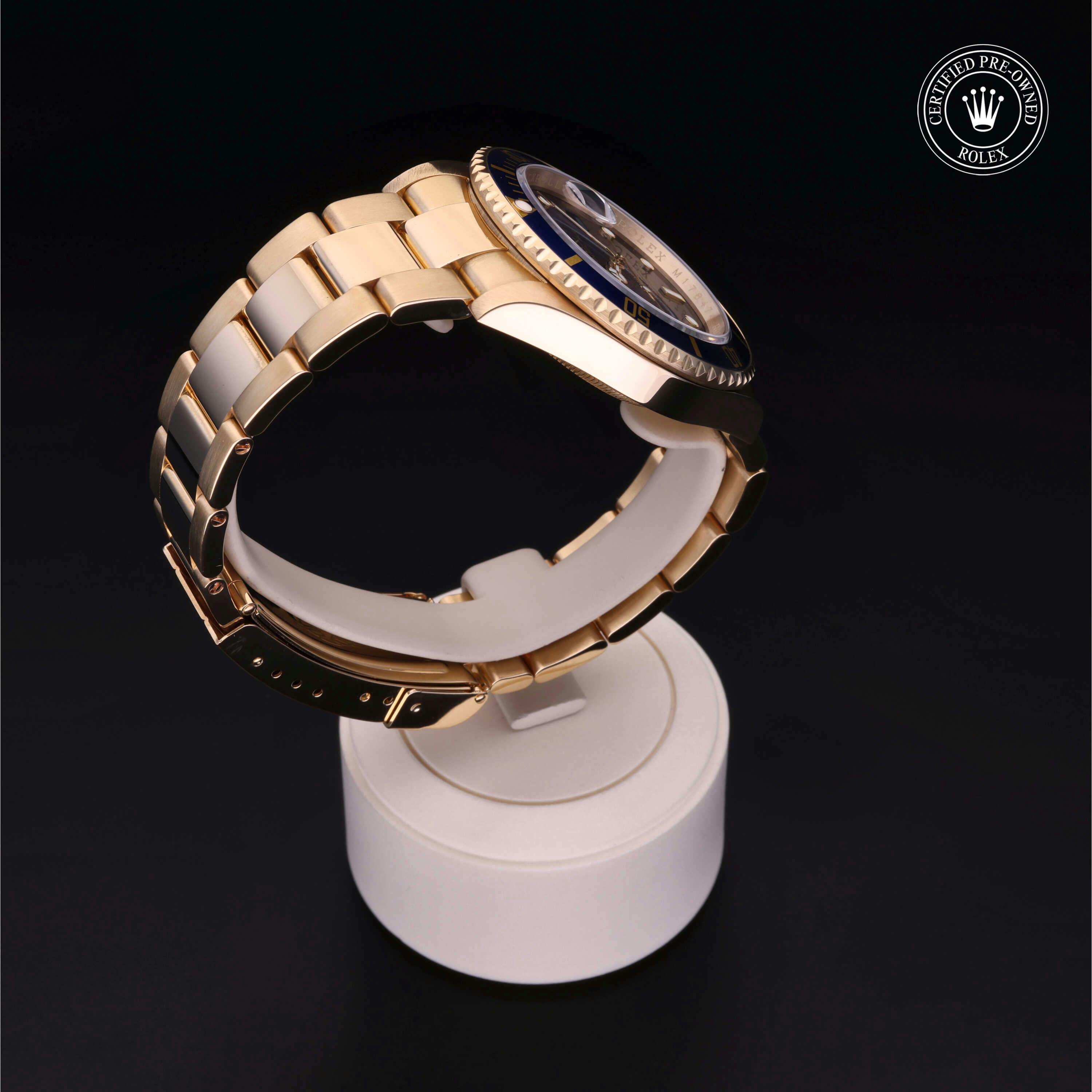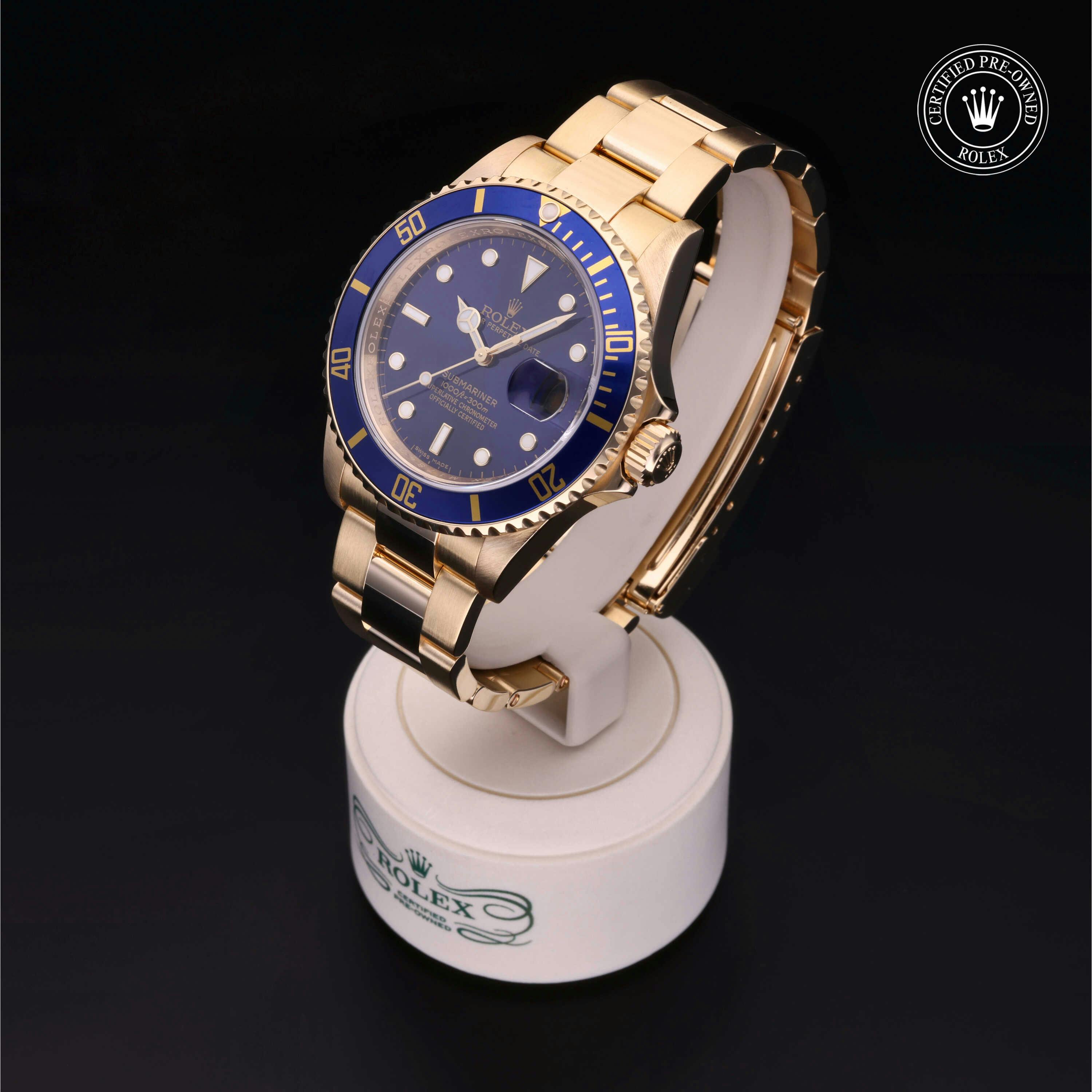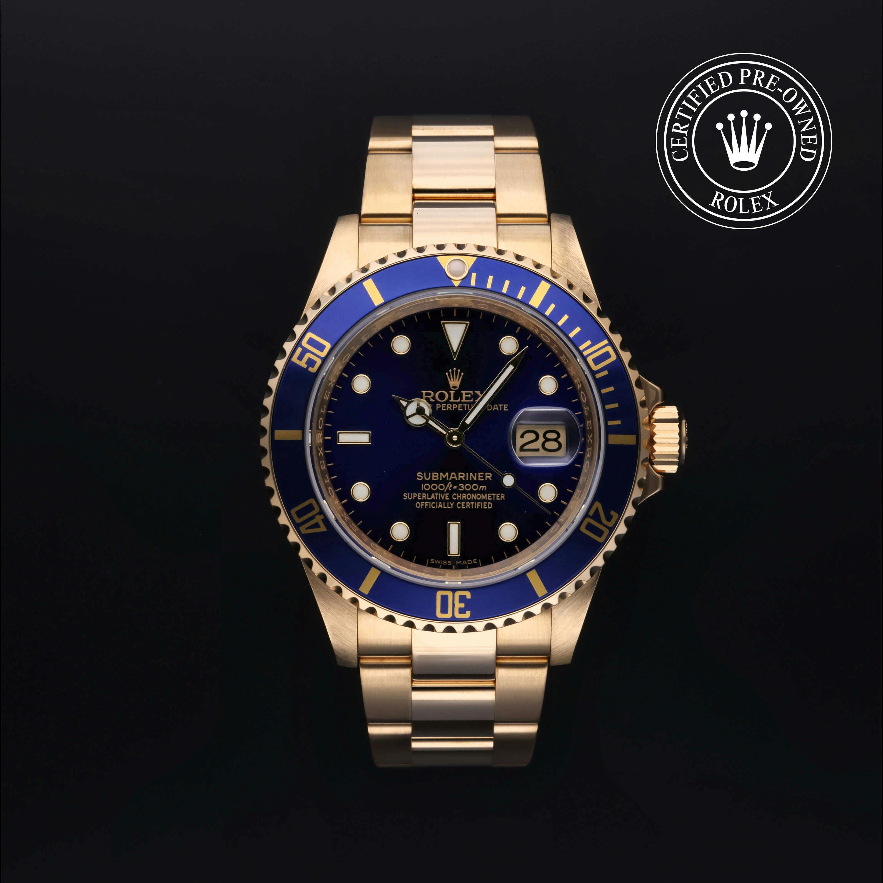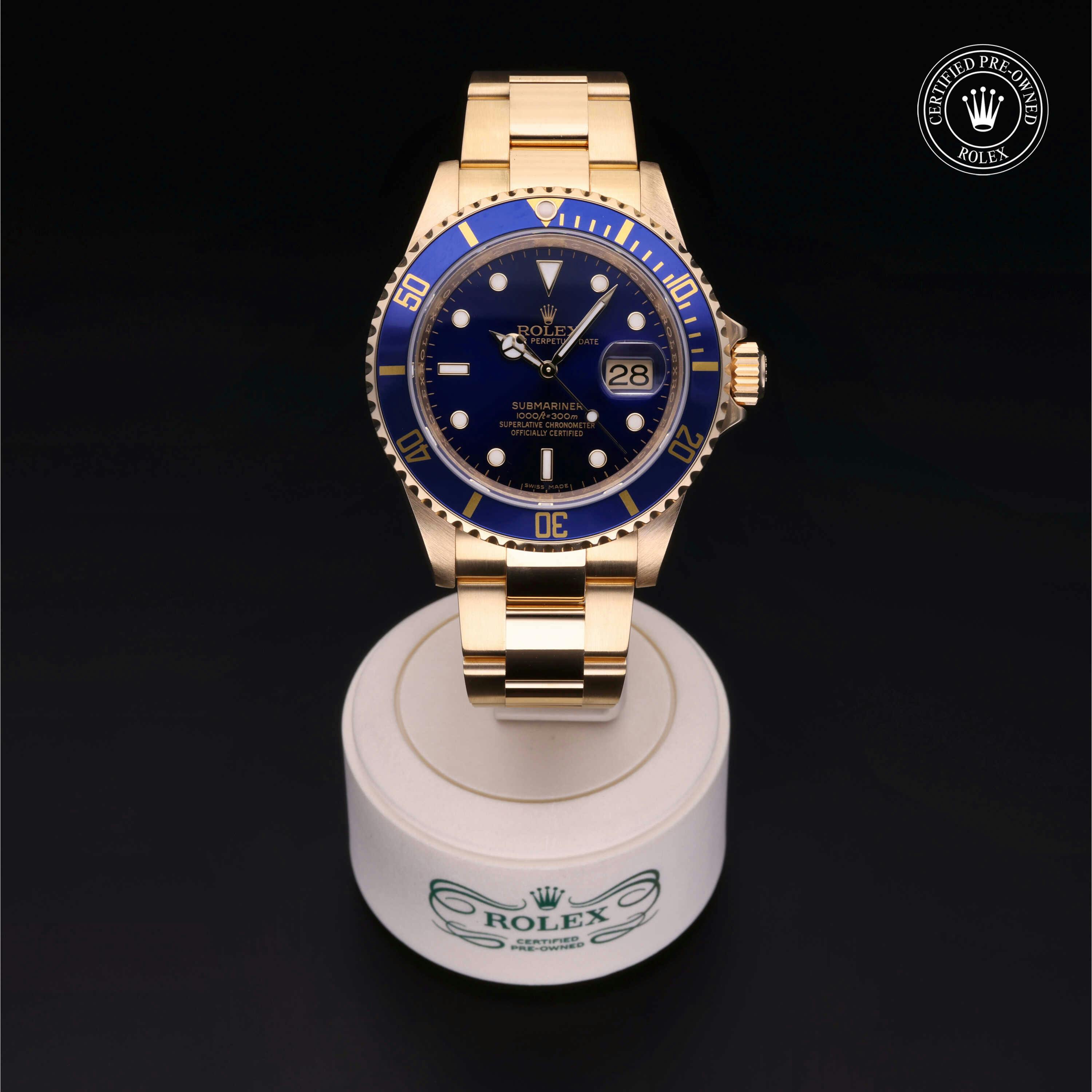 Rolex Certified Pre-Owned Submariner (16618) self - winding automatic watch, features a 40mm 18k yellow gold case with an 18k yellow gold and blue aluminum bezel surrounding a blue dial. Watch is secured on an 18k yellow gold oyster bracelet complete with a folding buckle. Functions include hours, minutes, seconds and date. This watch has received Rolex-authorized service and certified by Rolex. It comes with the original box and papers, and includes a custom Rolex Certified Pre-Owned hang tag, travel pouch and international warranty card.
