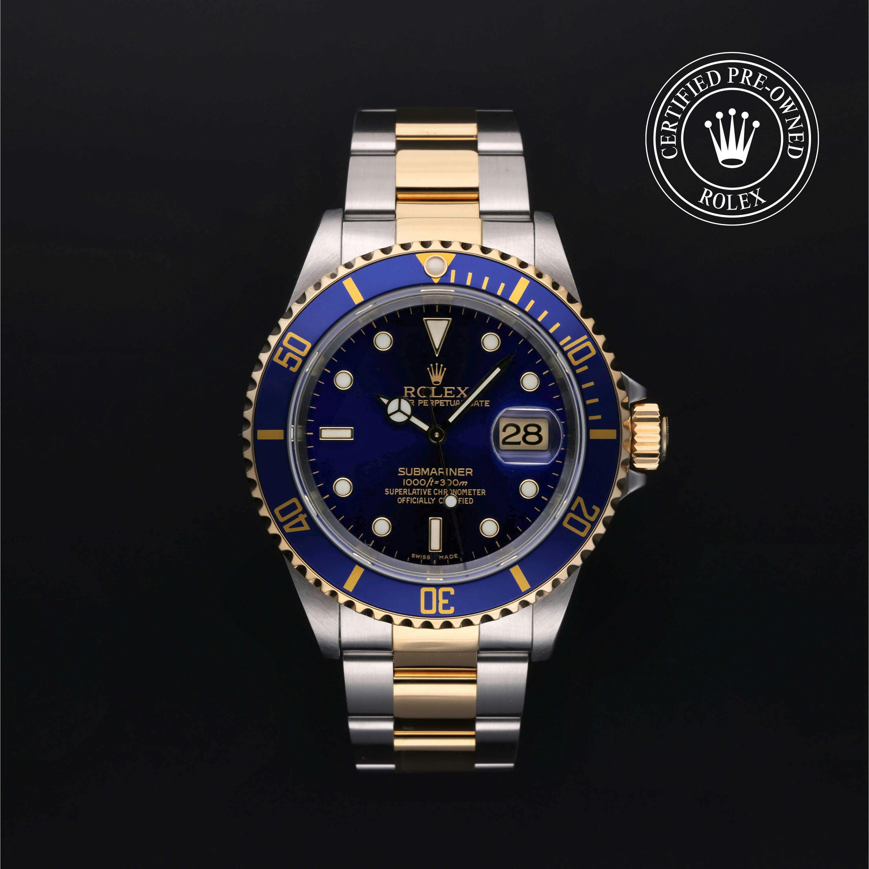 Rolex Certified Pre-Owned Submariner (16613) self - winding automatic watch, features a 40mm stainless steel case with an 18k yellow gold and blue aluminum bezel surrounding a blue dial on a stainless steel and 18k yellow gold oyster bracelet. Functions include hours, minutes, seconds and date. This watch has received Rolex-authorized service and certification. It comes with the original box and papers, and includes a custom Rolex Certified Pre-Owned hang tag, travel pouch and RCPO international warranty card.