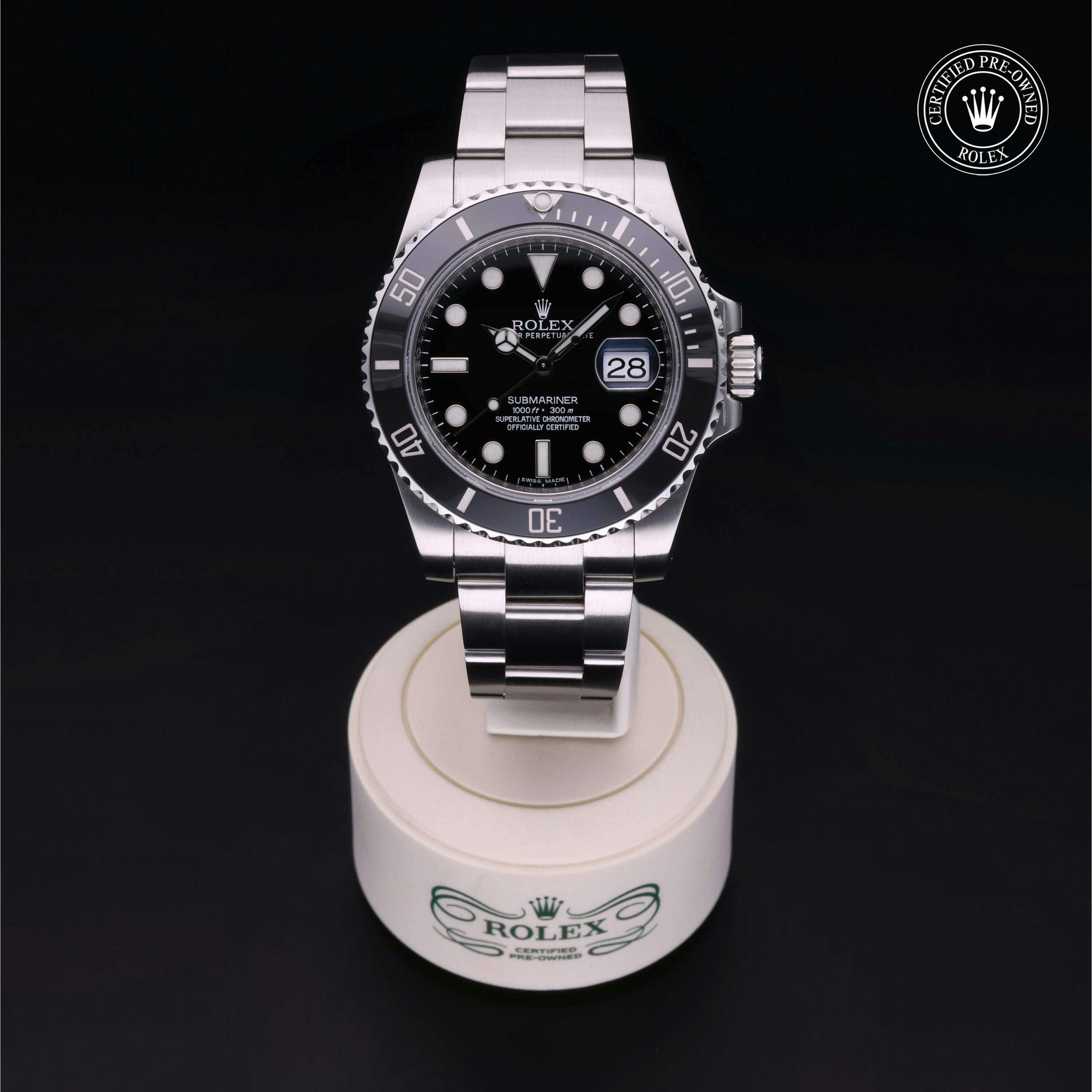 Rolex Certified Pre-Owned Submariner Date (116610LN) self - winding automatic watch, features a 40mm stainless steel case with a stainless steel and black cerachrom bezel surrounding a black dial on a stainless steel oyster bracelet. Functions include hours, minutes, seconds and date. This watch has received Rolex-authorized service and certification. It does not come with the original box or papers, but includes a custom Rolex Certified Pre-Owned hang tag, travel pouch and RCPO international warranty card.