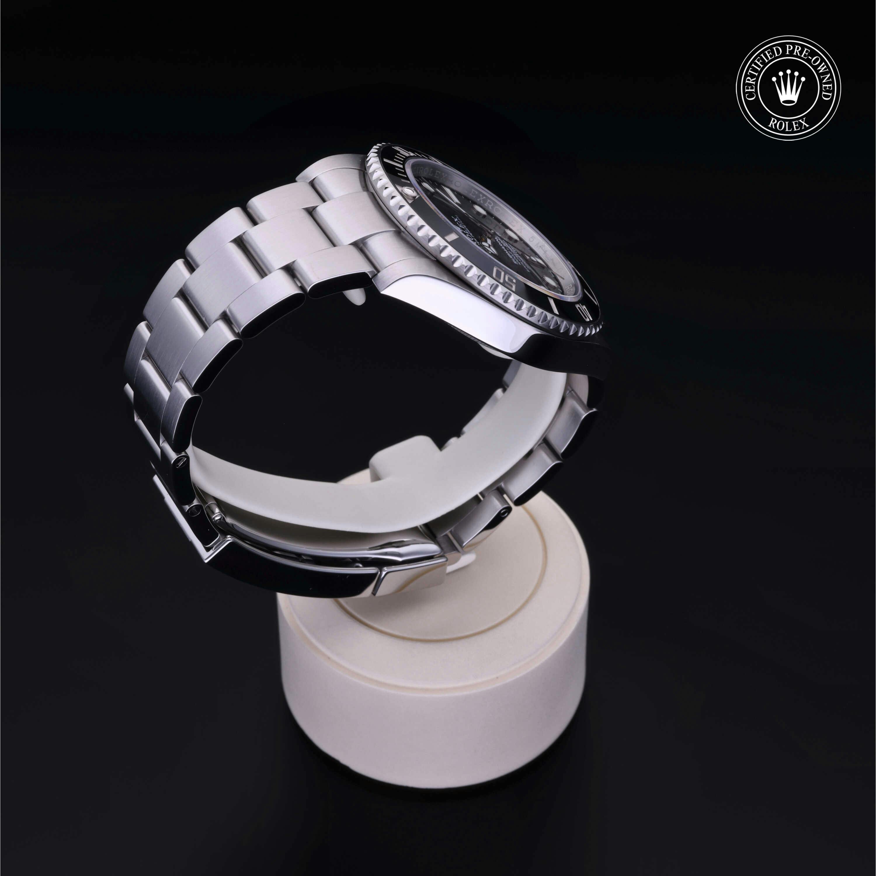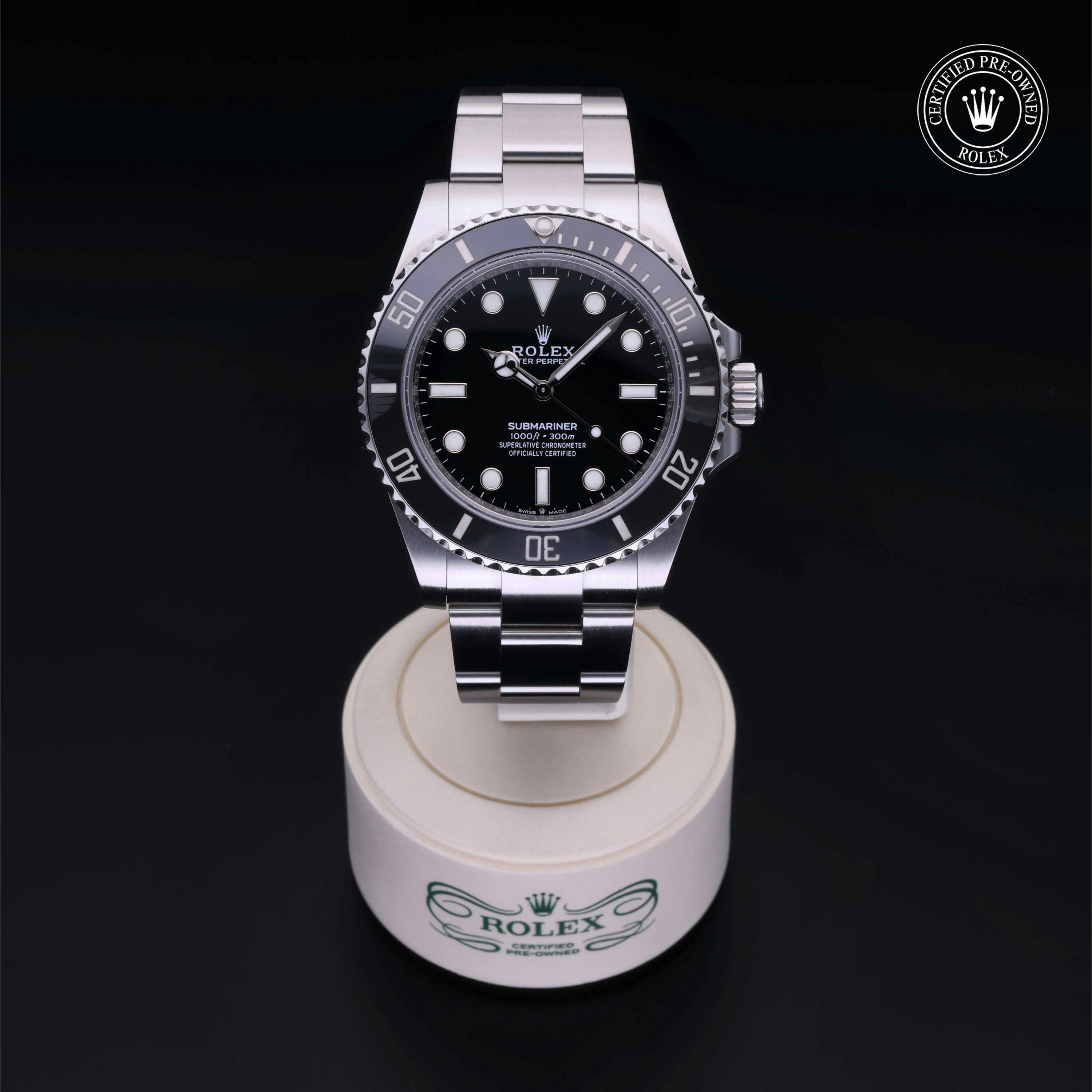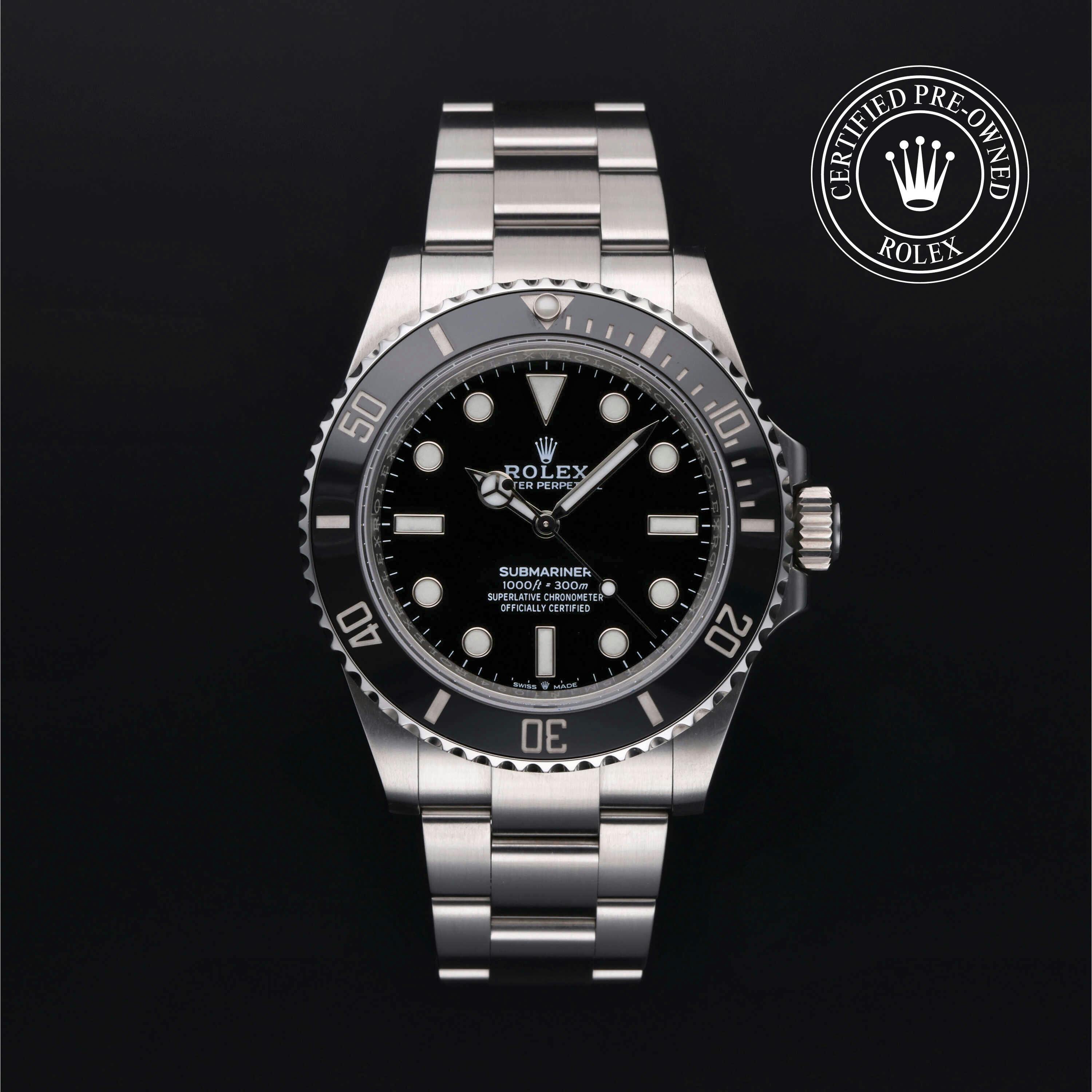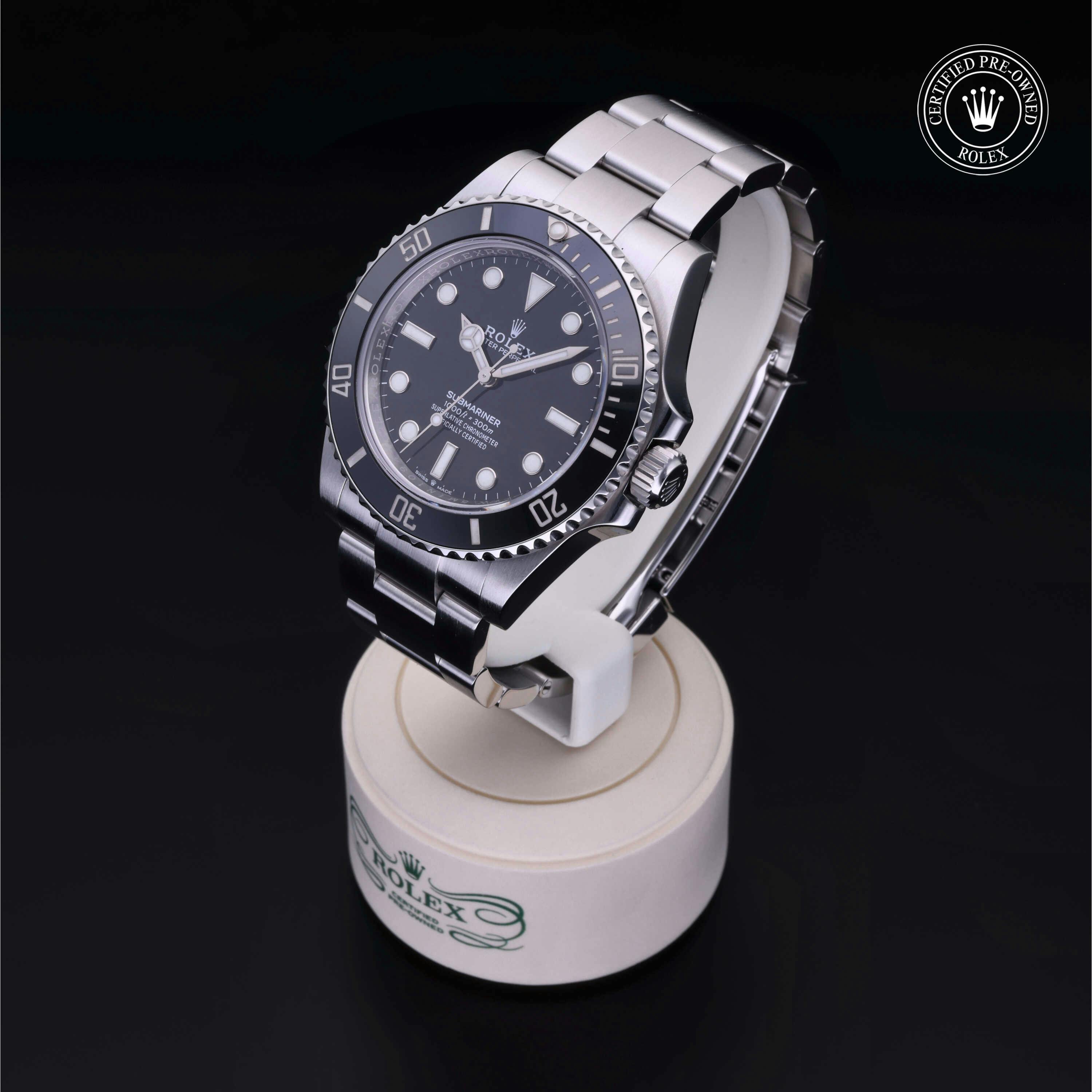 Rolex Certified Pre-Owned Submariner No Date (124060) self - winding automatic watch, features a 41mm stainless steel case with a black cerachrom bezel surrounding a black dial on a stainless steel oyster bracelet. Functions include hours, minutes and seconds. This watch has received Rolex-authorized service and certification. It comes with the original box and papers, and includes a custom Rolex Certified Pre-Owned hang tag, travel pouch and RCPO international warranty card.