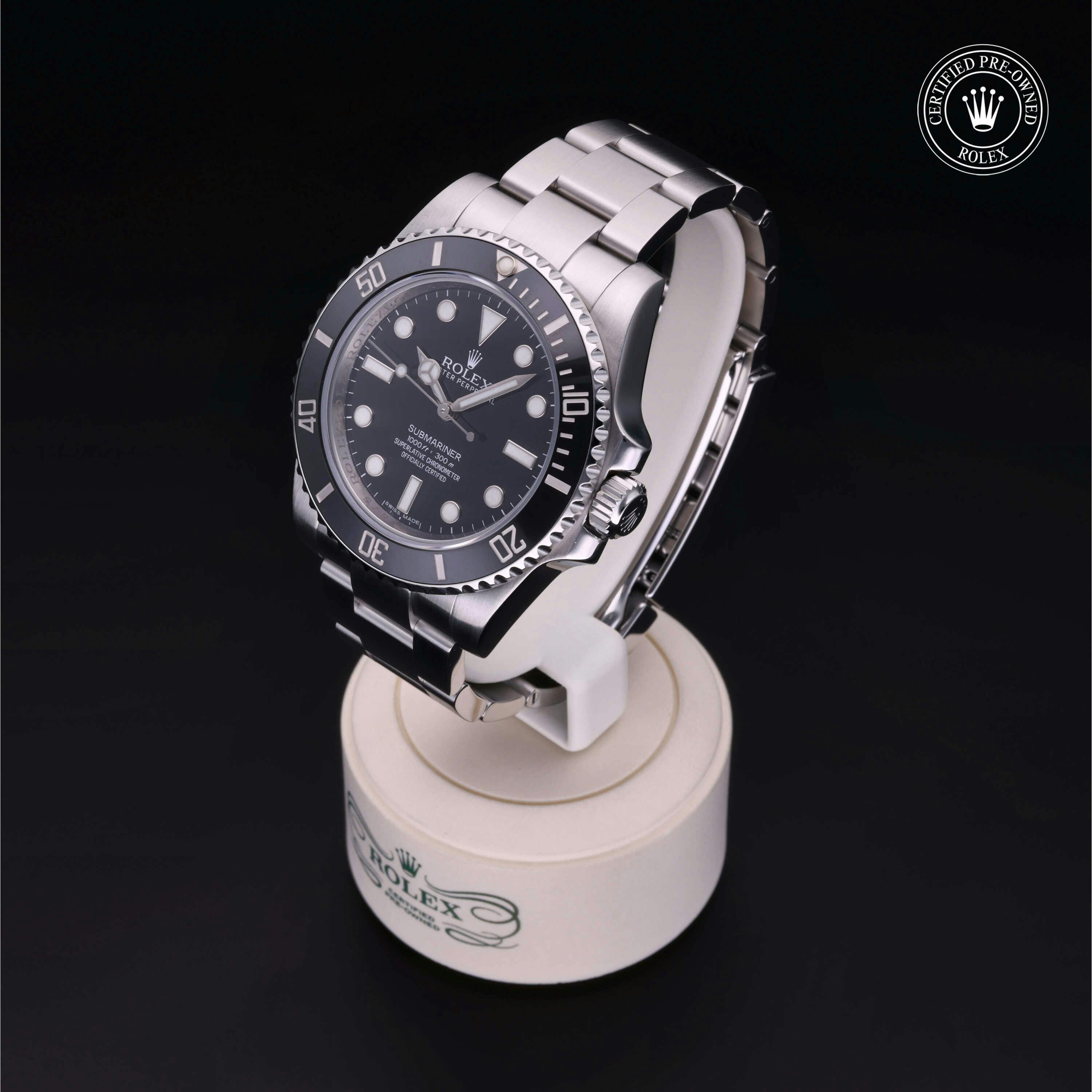 Rolex Certified Pre-Owned Submariner (114060) self - winding automatic watch, features a 40mm stainless steel case with a stainless steel and black cerachrom bezel surrounding a black dial. Watch is secured with a stainless steel oyster bracelet complete with a folding clasp. Functions include hours, minutes and seconds. This watch has been serviced by an authorized Rolex service center and certified by Rolex. It does not come with the original box or papers, but includes a custom Rolex Certified Pre-Owned hang tag, travel pouch and international warranty card.