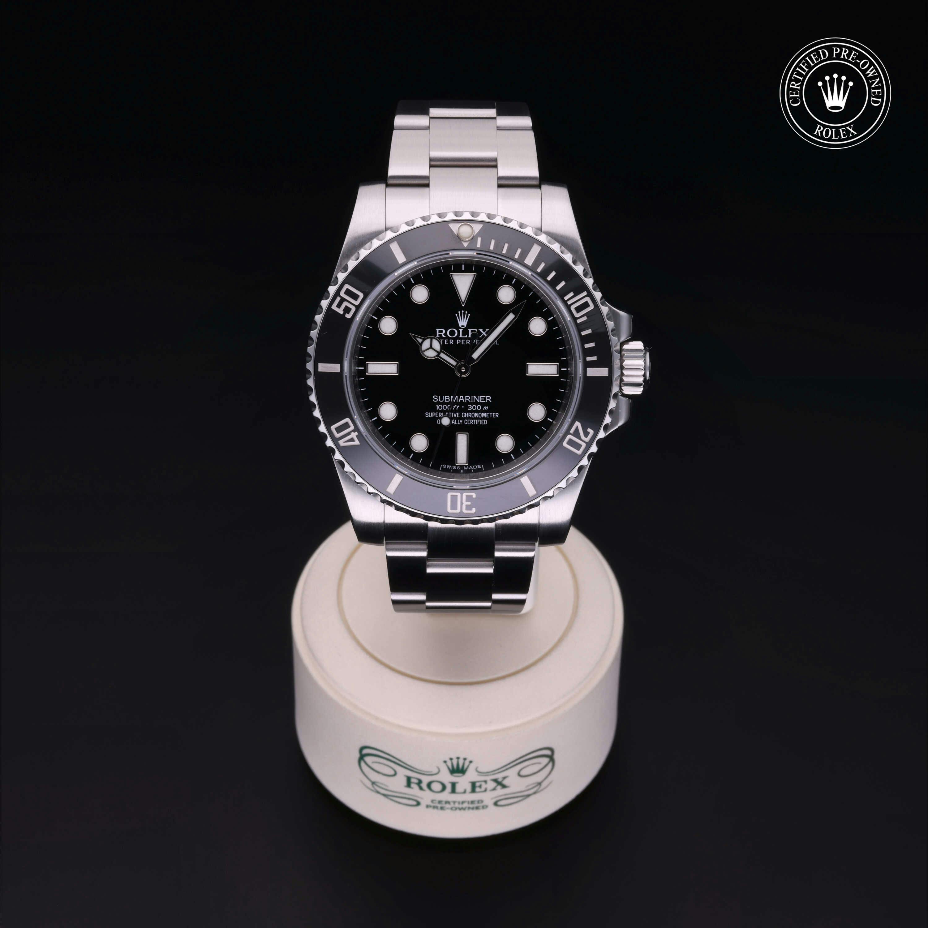 Rolex Certified Pre-Owned Submariner (114060) self - winding automatic watch, features a 40mm stainless steel case with a stainless steel and black cerachrom bezel surrounding a black dial. Watch is secured with a stainless steel oyster bracelet complete with a folding clasp. Functions include hours, minutes and seconds. This watch has been serviced by an authorized Rolex service center and certified by Rolex. It does not come with the original box or papers, but includes a custom Rolex Certified Pre-Owned hang tag, travel pouch and international warranty card.