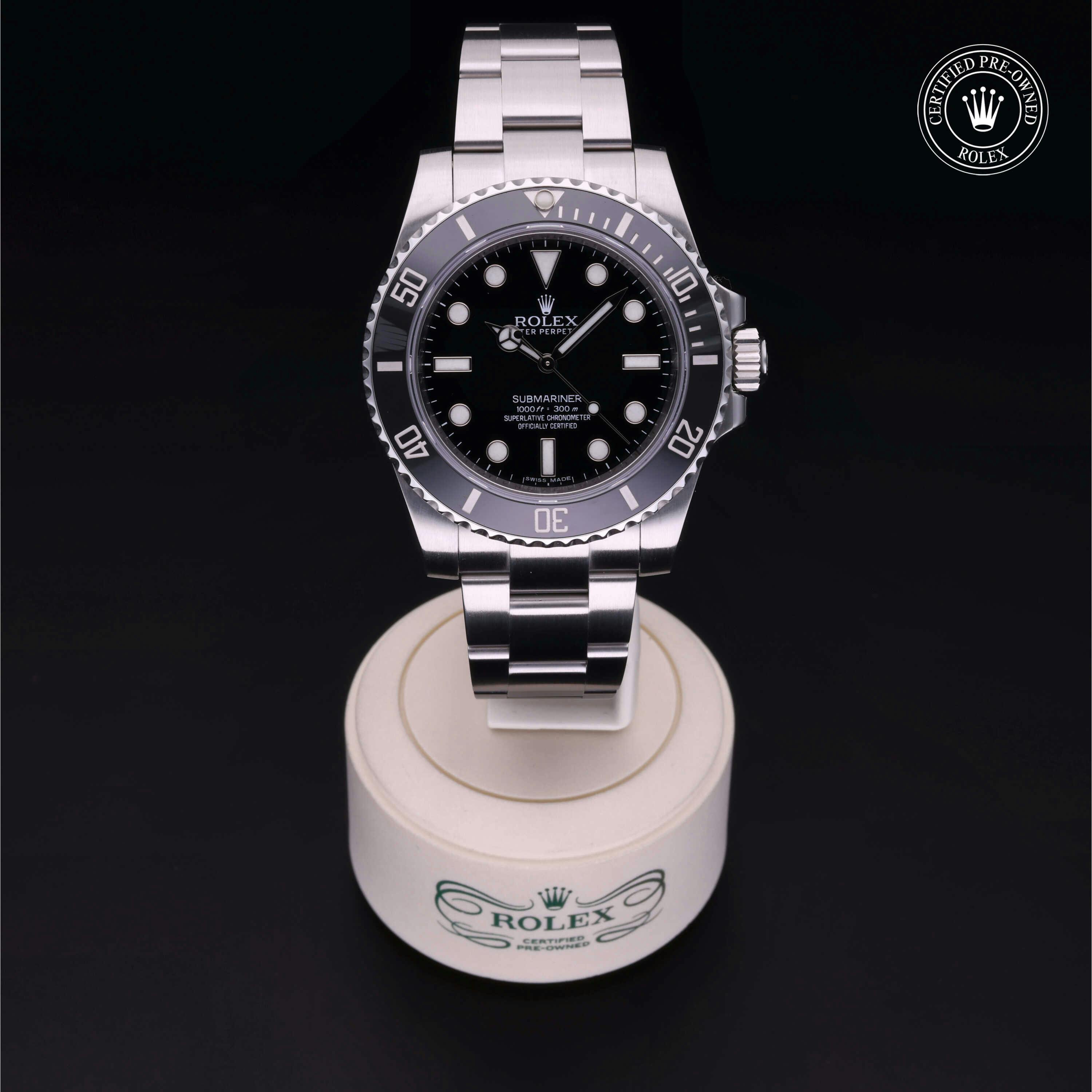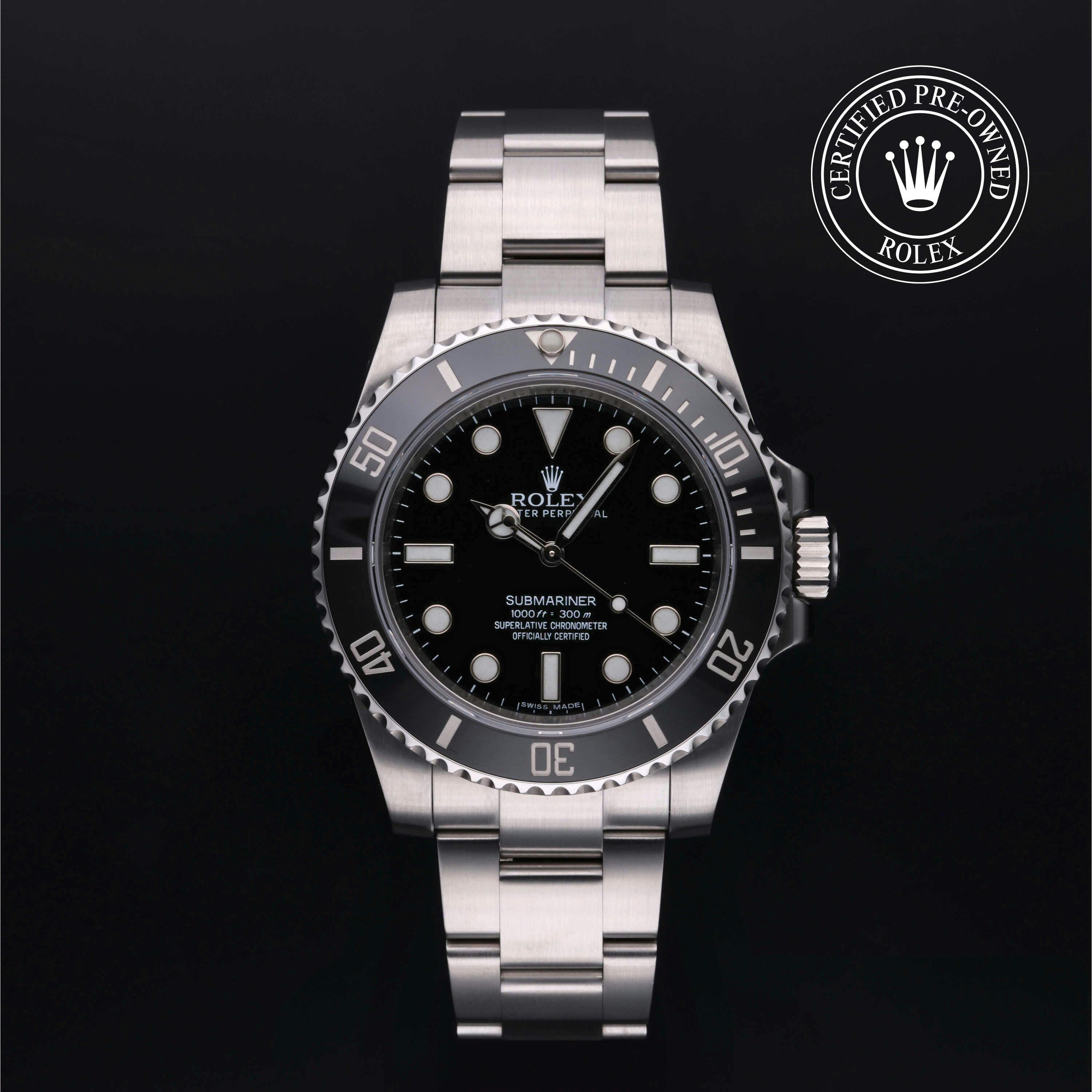 Rolex Certified Pre-Owned Submariner (114060) self - winding automatic watch, features a 40mm stainless steel case with a black cerachrom bezel surrounding a black dial on a stainless steel Oyster bracelet. Functions include hours, minutes and seconds. This watch has received Rolex-authorized service and certification. It does not come with the original box or papers, but includes a custom Rolex Certified Pre-Owned hang tag, travel pouch and RCPO international warranty card.