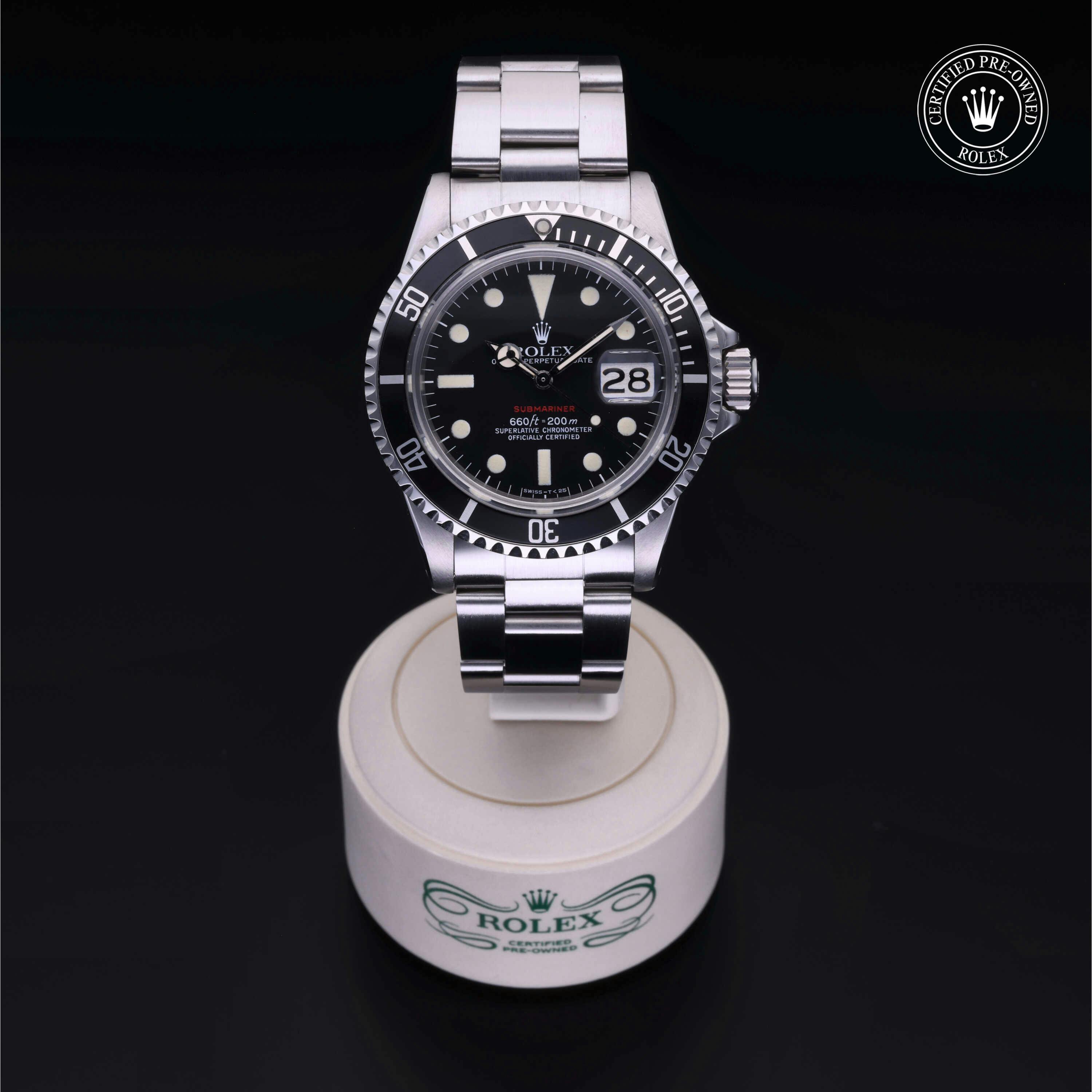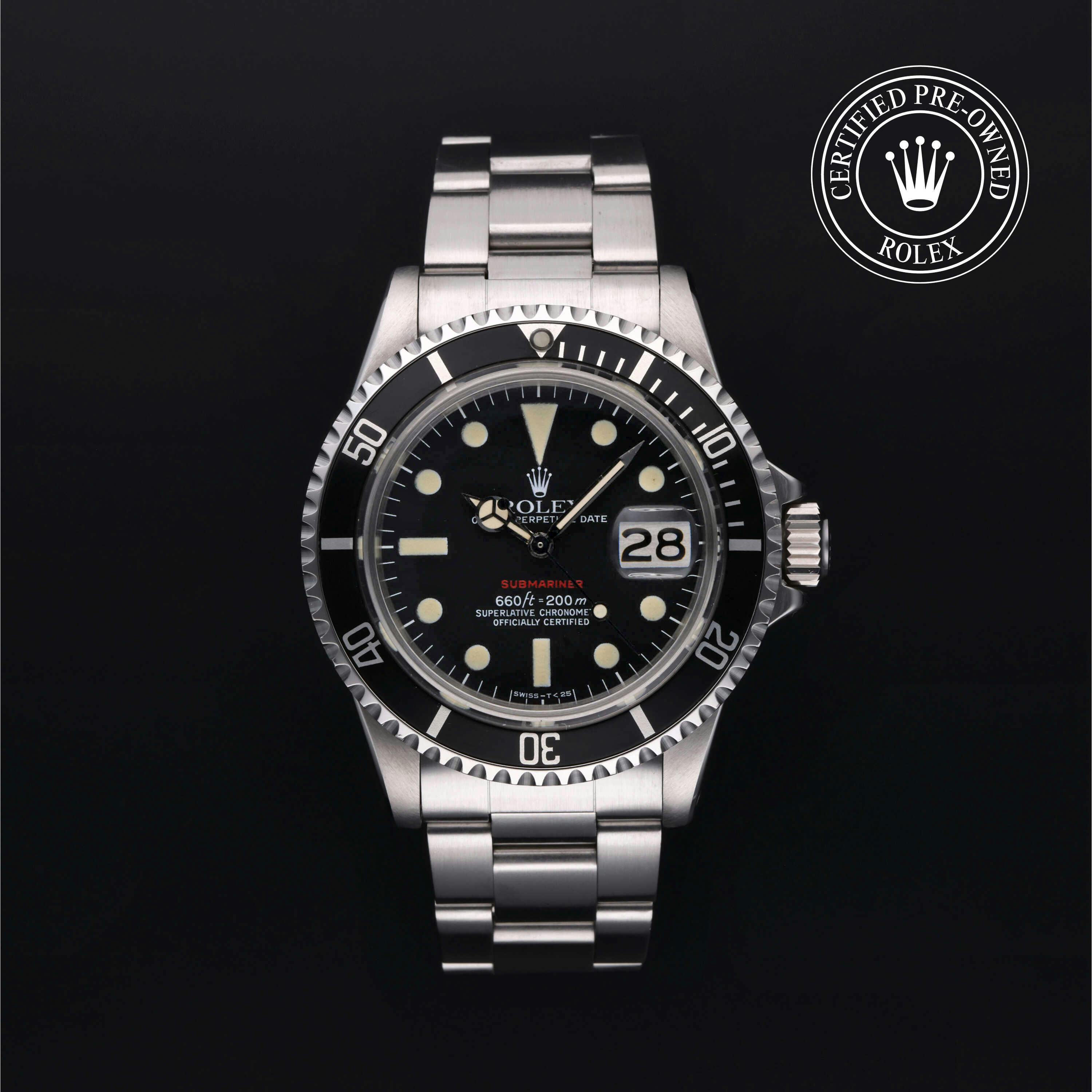 Rolex Certified Pre-Owned Submariner Big Red (1680) self - winding automatic watch, features a 40mm stainless steel case with a black aluminum bezel surrounding a black dial on a stainless steel oyster bracelet. Functions include hours, minutes, seconds and date. This watch has received Rolex-authorized service and certification. It comes with the original papers, and includes a custom Rolex Certified Pre-Owned hang tag, travel pouch and RCPO international warranty card.