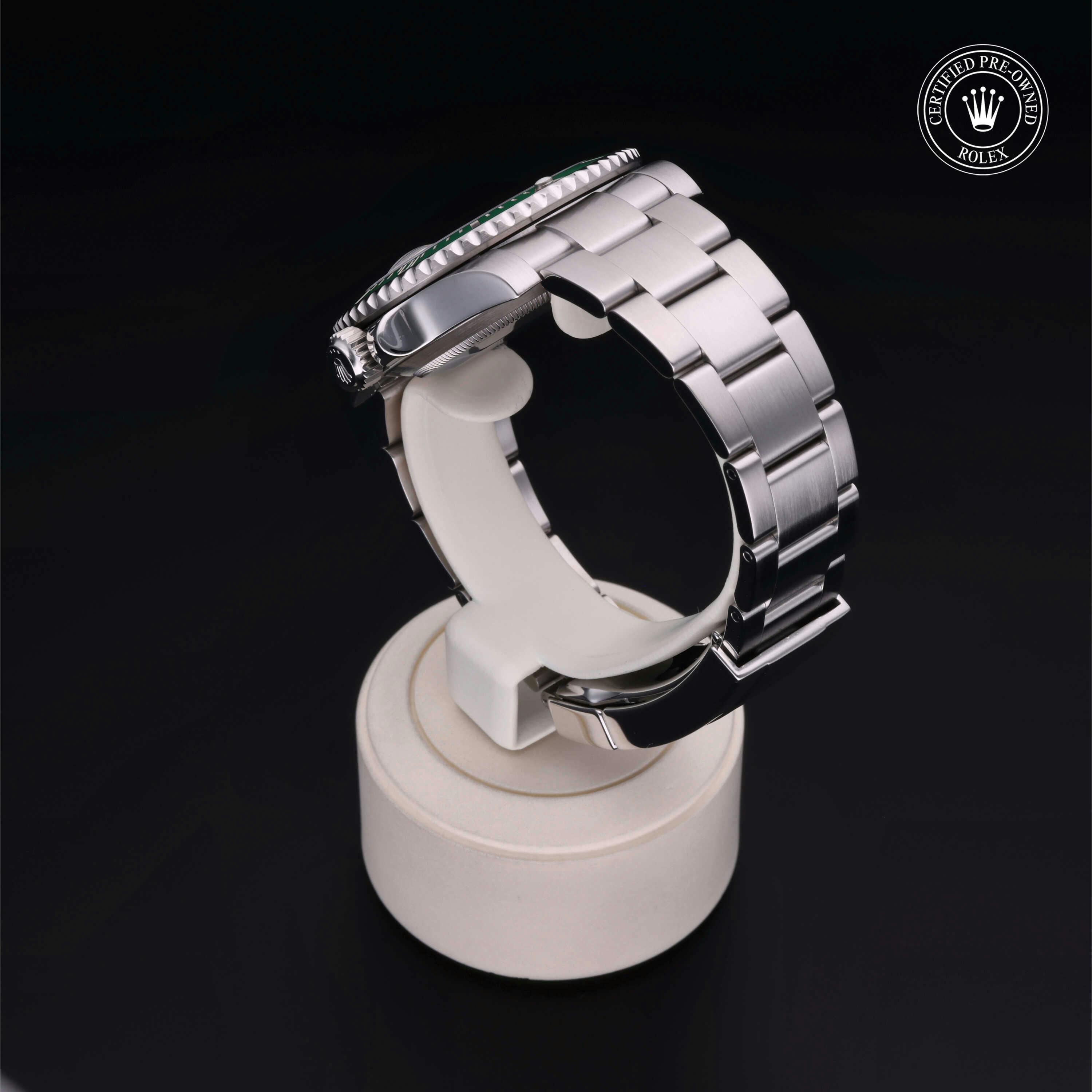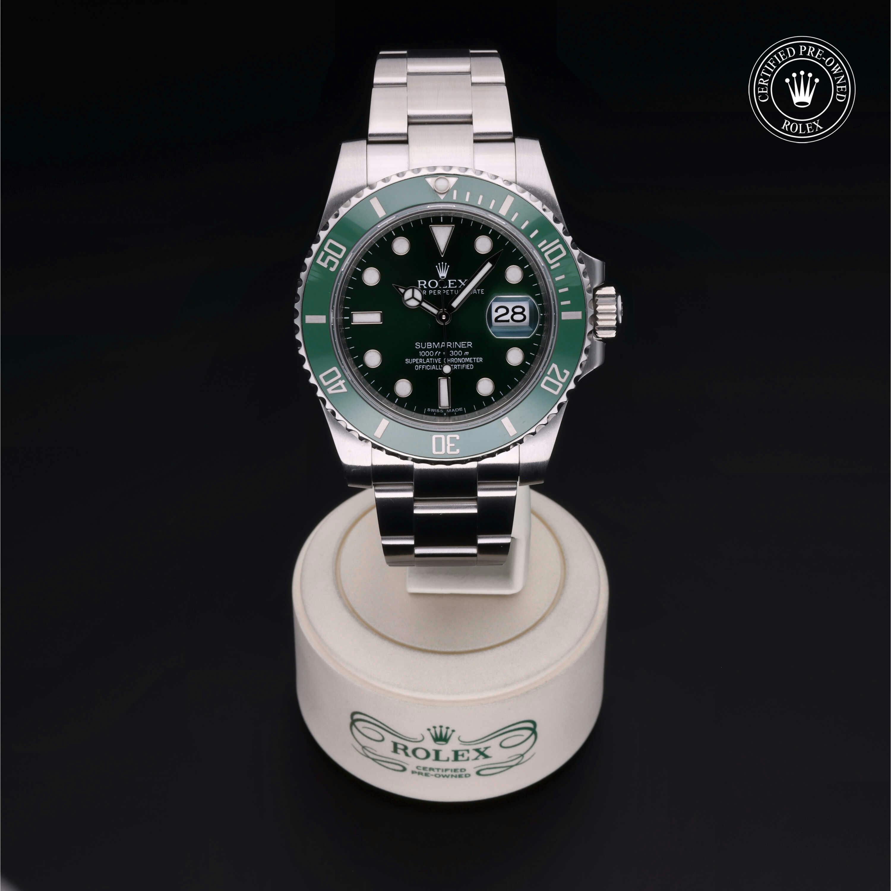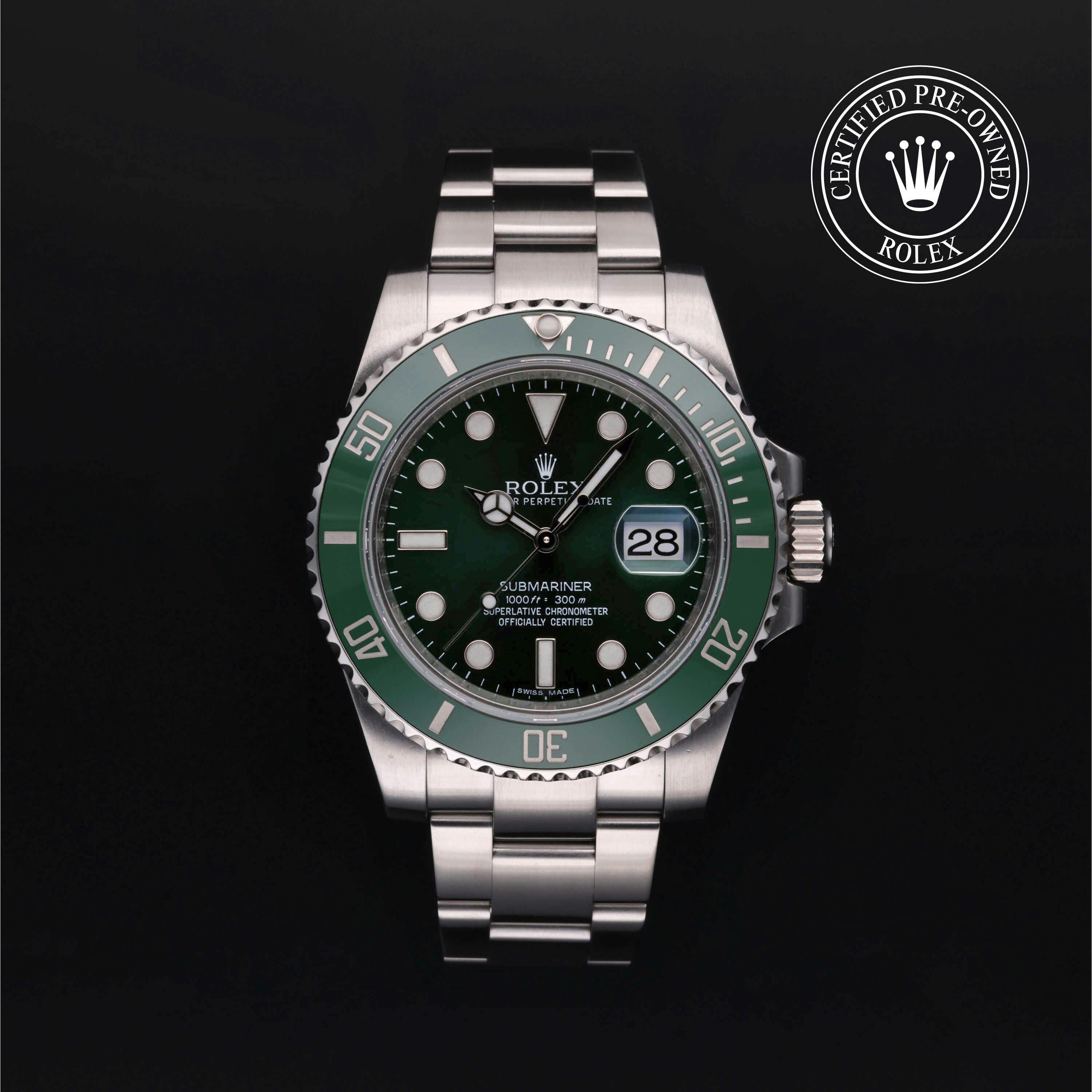 Rolex Certified Pre-Owned Submariner Date (116610LV) self - winding automatic watch, features a 40mm stainless steel case with a green cerachrom bezel surrounding a green dial on a stainless steel oyster bracelet. Functions include hours, minutes, seconds and date. This watch has received Rolex-authorized service and certification. It does not come with the original box or papers, but includes a custom Rolex Certified Pre-Owned hang tag, travel pouch and RCPO international warranty card.