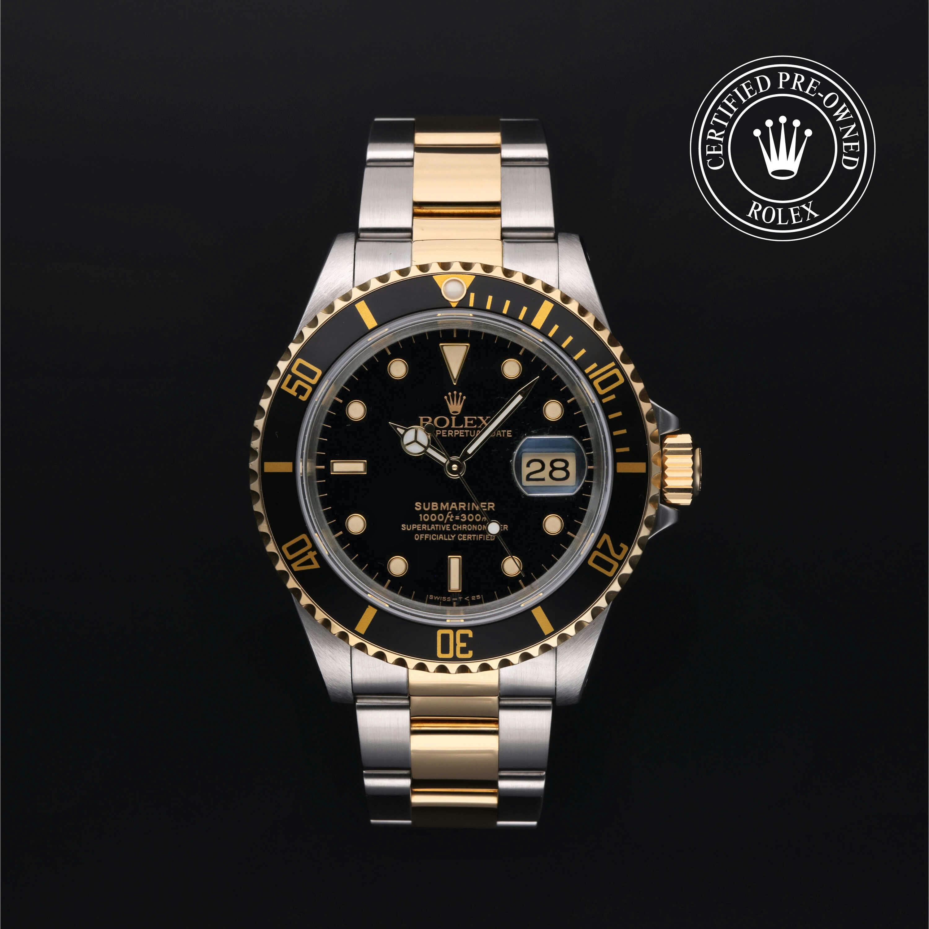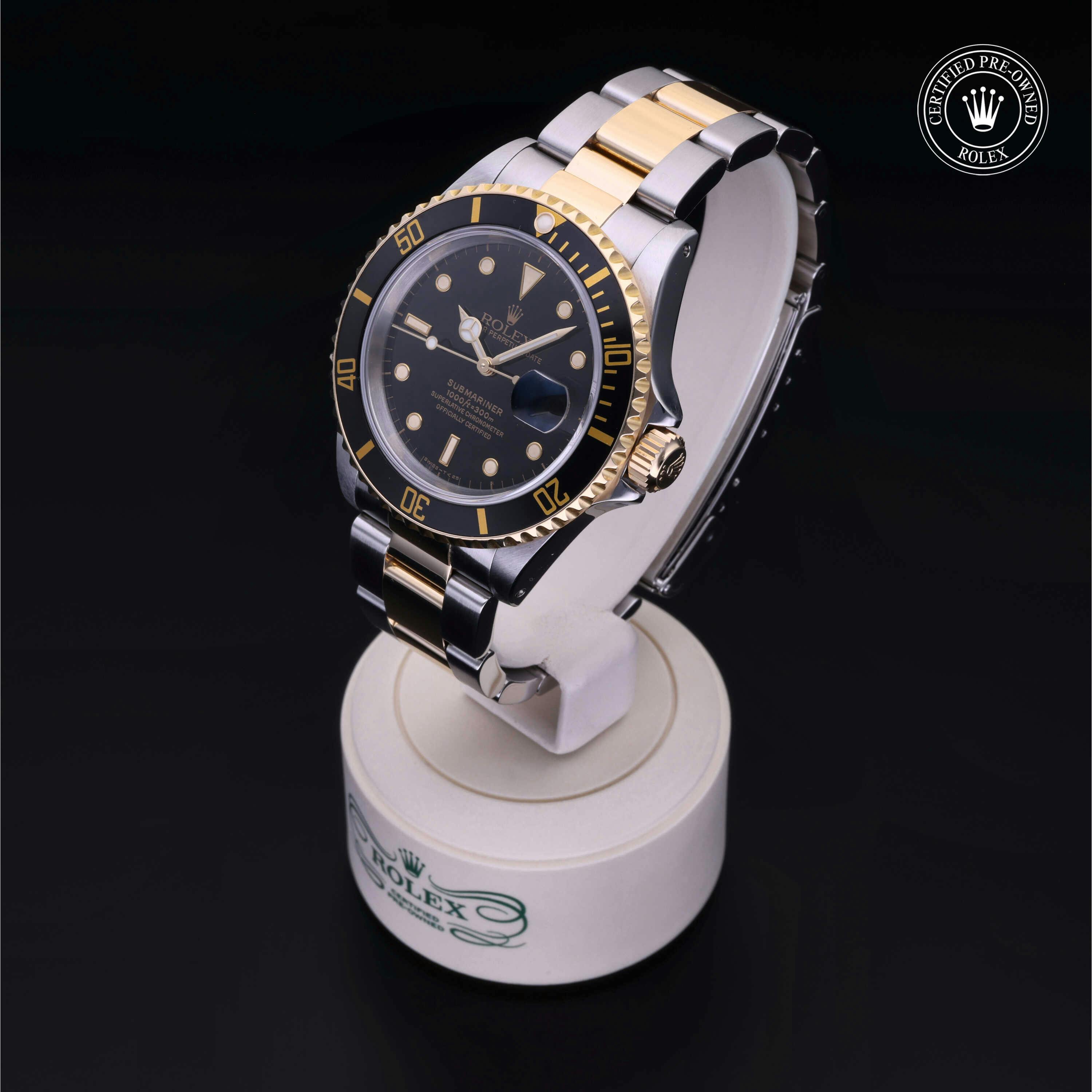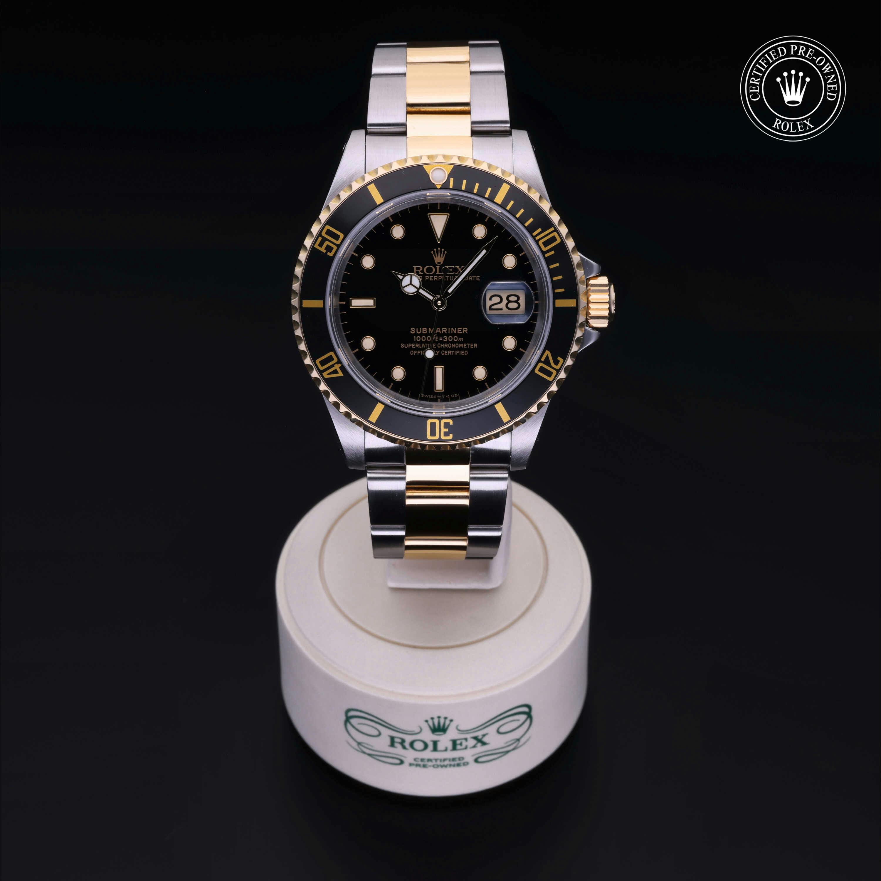 Rolex Certified Pre-Owned Submariner Date (16613) self - winding automatic watch, features a 40mm stainless steel case with an 18k yellow gold and black aluminum bezel surrounding a black dial on a stainless steel and 18k yellow gold oyster bracelet. Functions include hours, minutes, seconds and date. This watch has received Rolex-authorized service and certification. It does not come with the original box or papers, but includes a custom Rolex Certified Pre-Owned hang tag, travel pouch and RCPO international warranty card.