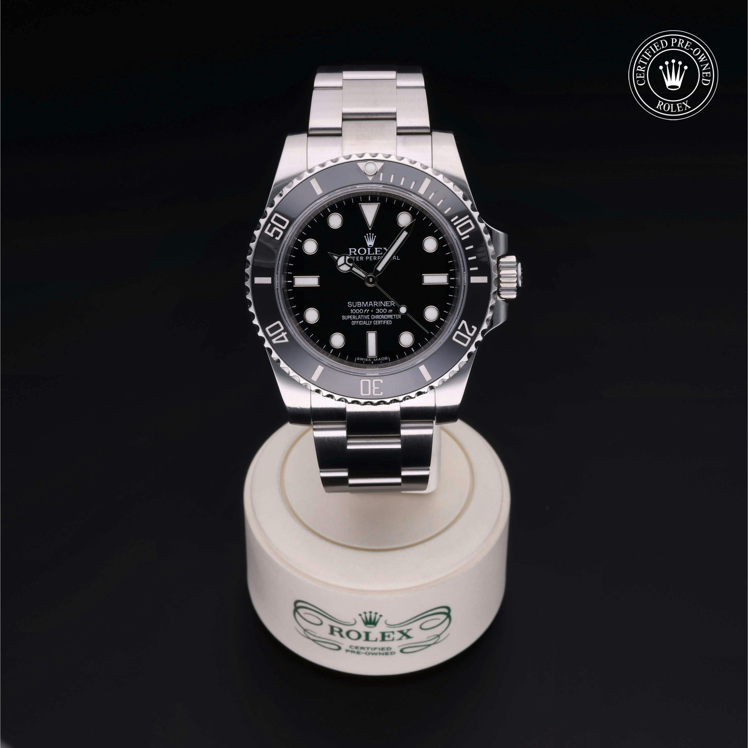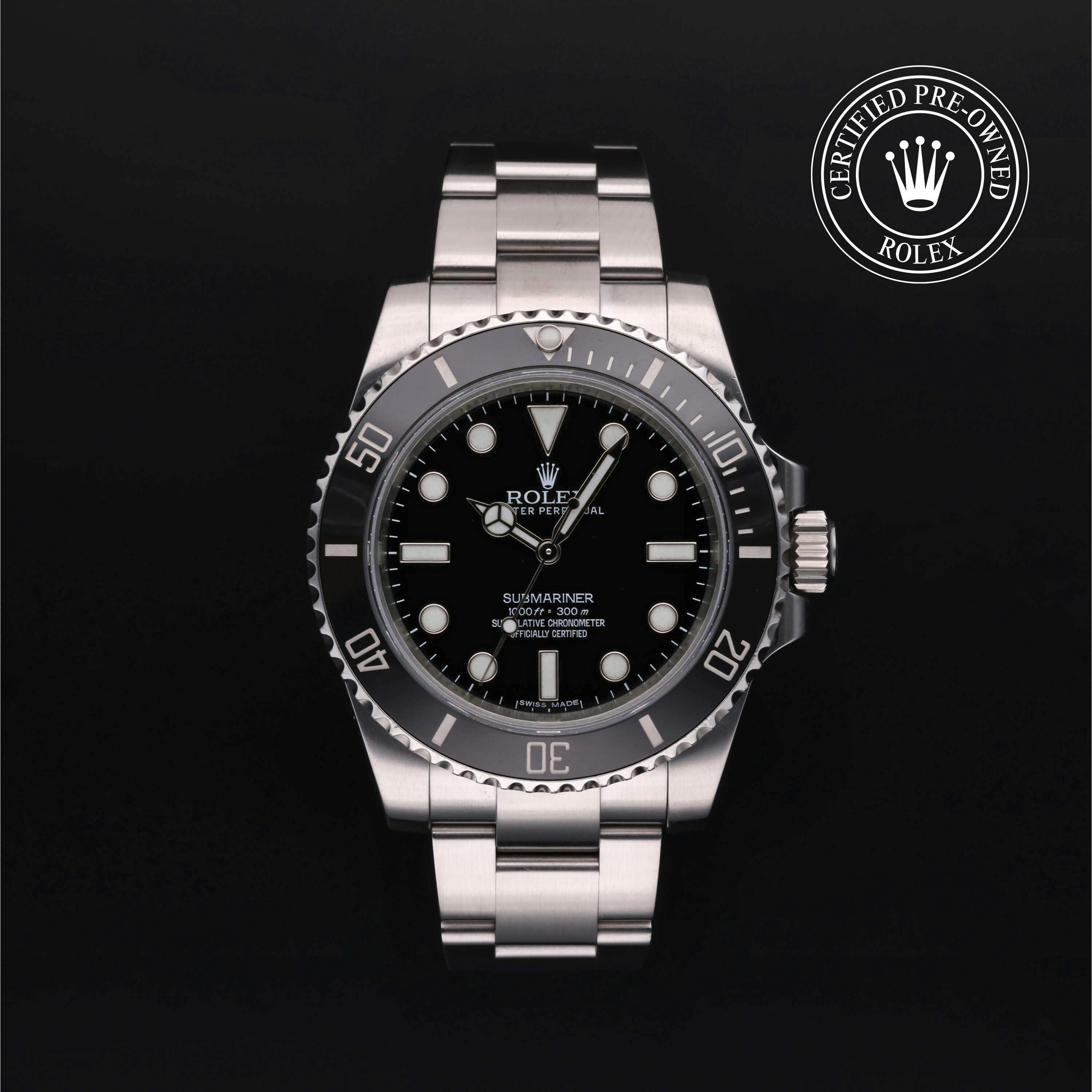 Rolex Certified Pre-Owned Submariner (114060) self - winding automatic watch, features a 40mm stainless steel case with a black cerachrom bezel surrounding a black dial on a stainless steel Oyster bracelet. Functions include hours, minutes and seconds. This watch has received Rolex-authorized service and certification. It comes with the original box, and includes a custom Rolex Certified Pre-Owned hang tag, travel pouch and RCPO international warranty card.