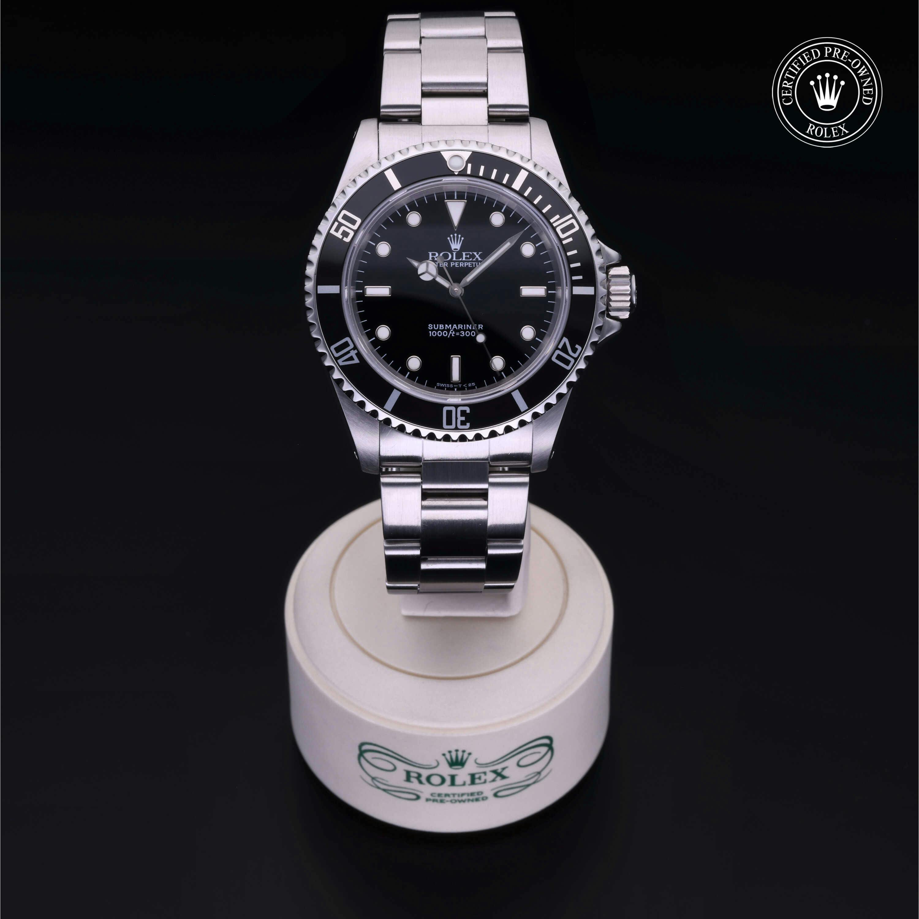 Rolex Certified Pre-Owned Submariner No Date (14060M) self - winding automatic watch, features a 40mm stainless steel case with a black aluminum bezel surrounding a black dial on a stainless steel oyster bracelet. Functions include hours, minutes and seconds. This watch has received Rolex-authorized service and certification. It does not come with the original box or papers, but includes a custom Rolex Certified Pre-Owned hang tag, travel pouch and RCPO international warranty card.