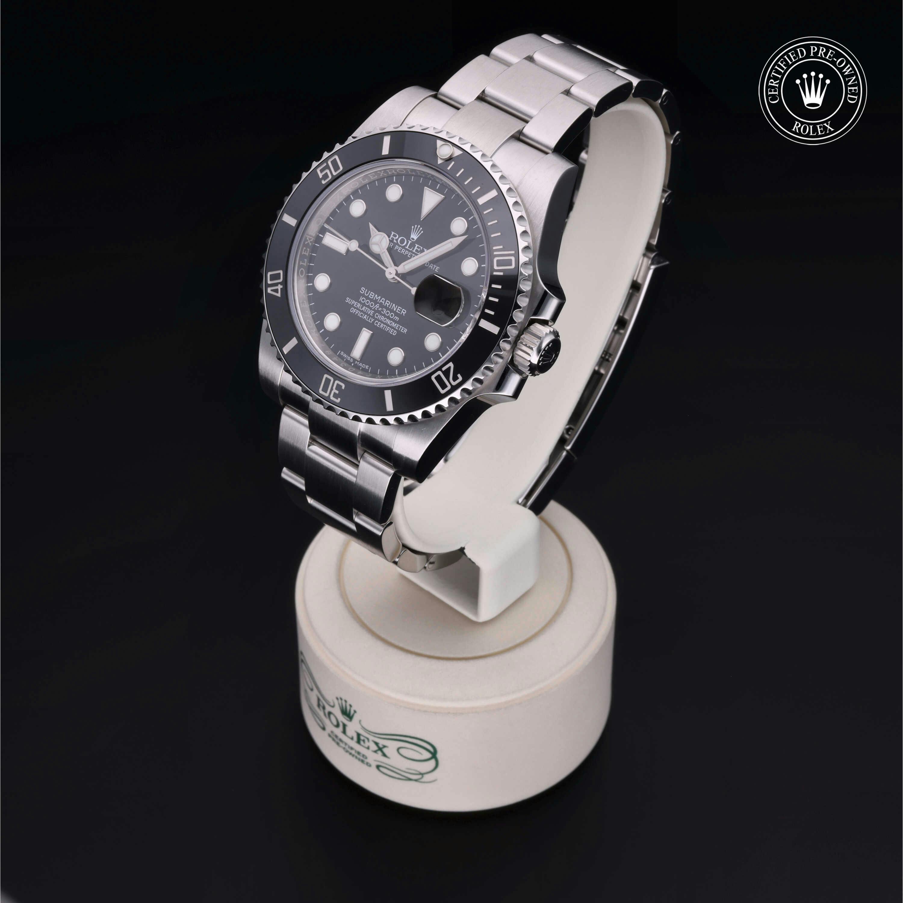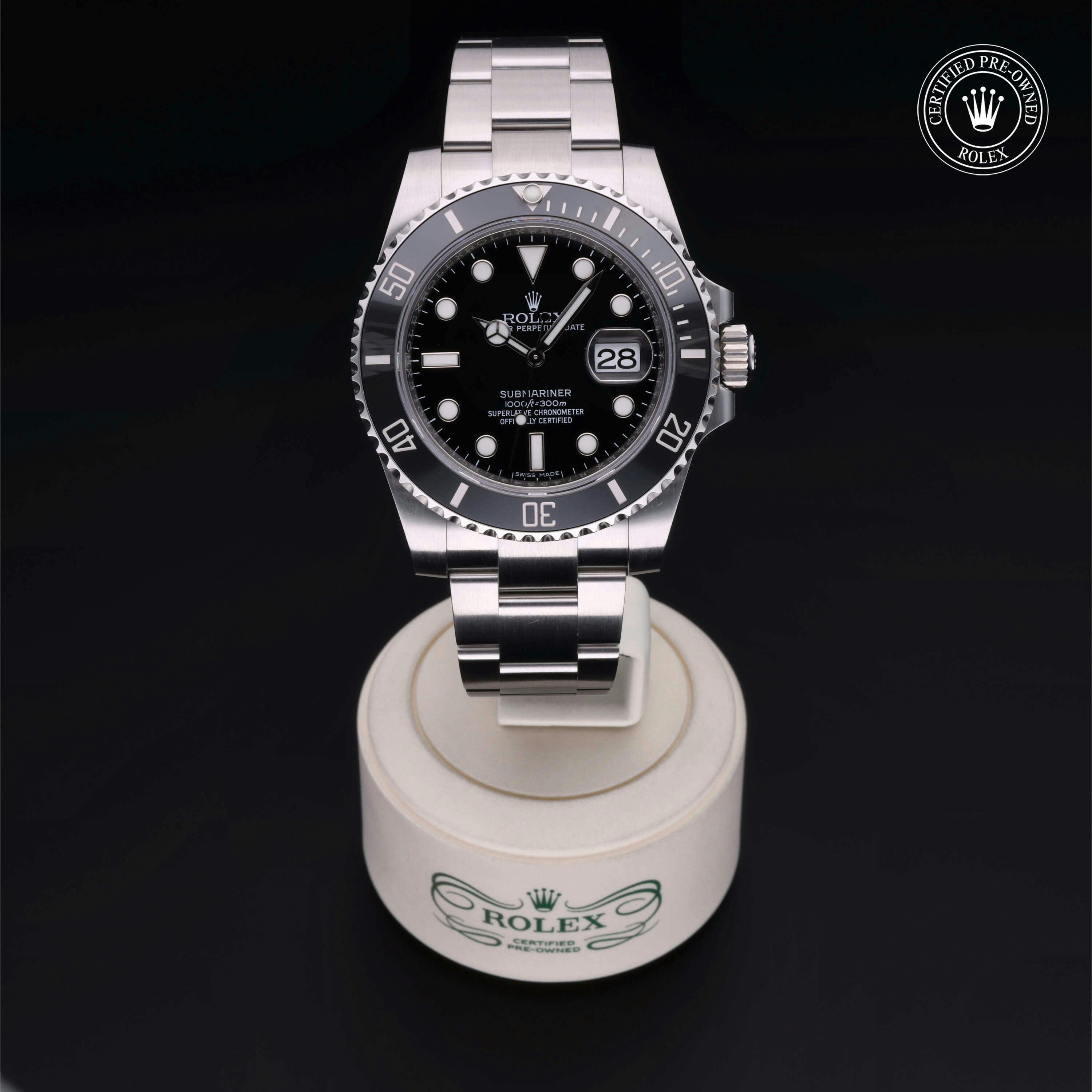 Rolex Certified Pre-Owned Submariner Date (116610LN) self - winding automatic watch, features a 40mm stainless steel case with a black cerachrom bezel surrounding a black dial on a stainless steel oyster bracelet. Functions include hours, minutes, seconds and date. This watch has received Rolex-authorized service and certification. It comes with the original box and papers, and includes a custom Rolex Certified Pre-Owned hang tag, travel pouch and RCPO international warranty card.