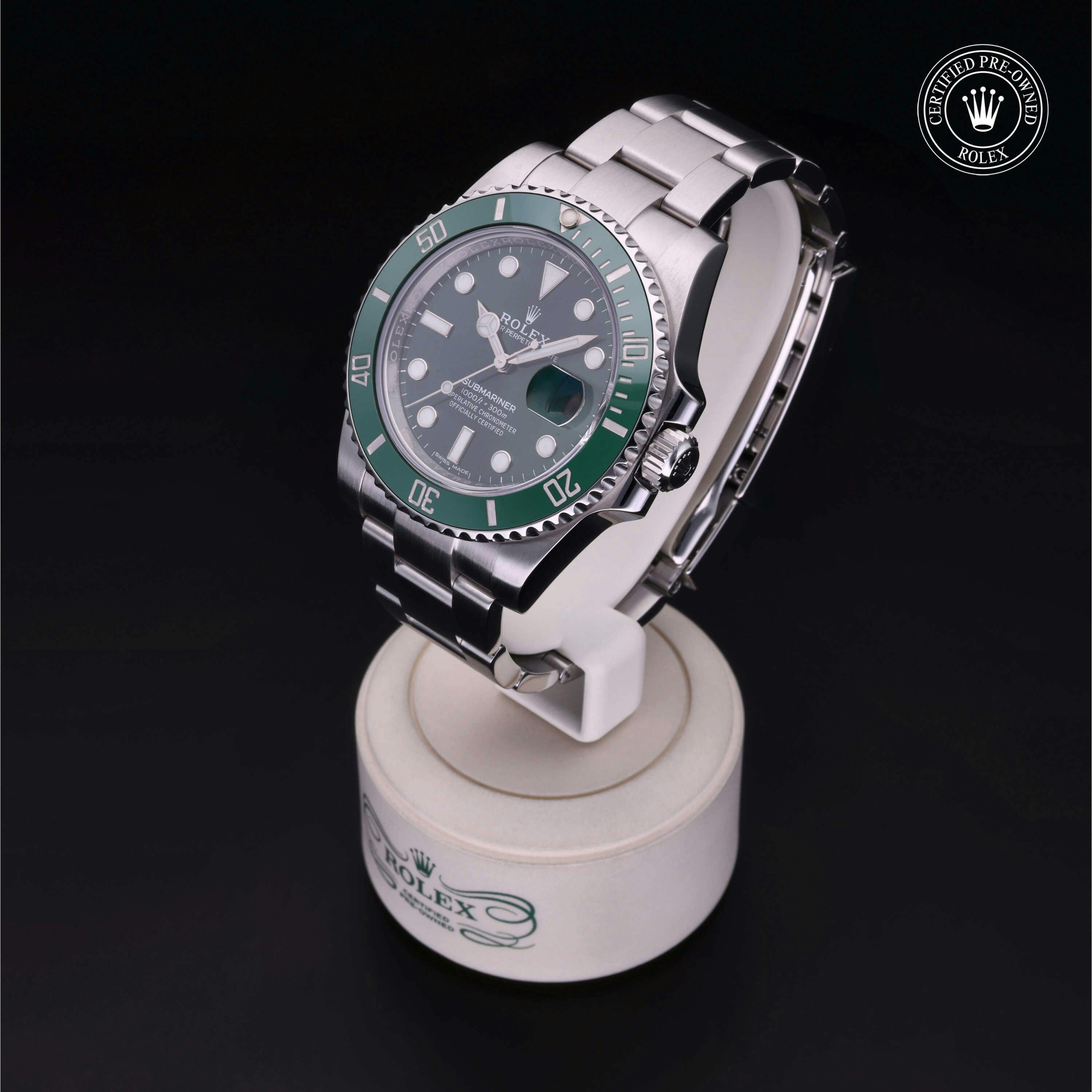 Rolex Certified Pre-Owned Submariner Date (116610LV) self - winding automatic watch, features a 40mm stainless steel case with a green cerachrom bezel surrounding a green dial on a stainless steel oyster bracelet. Functions include hours, minutes, seconds and date. This watch has received Rolex-authorized service and certification. It does not come with the original box or papers, but includes a custom Rolex Certified Pre-Owned hang tag, travel pouch and RCPO international warranty card.