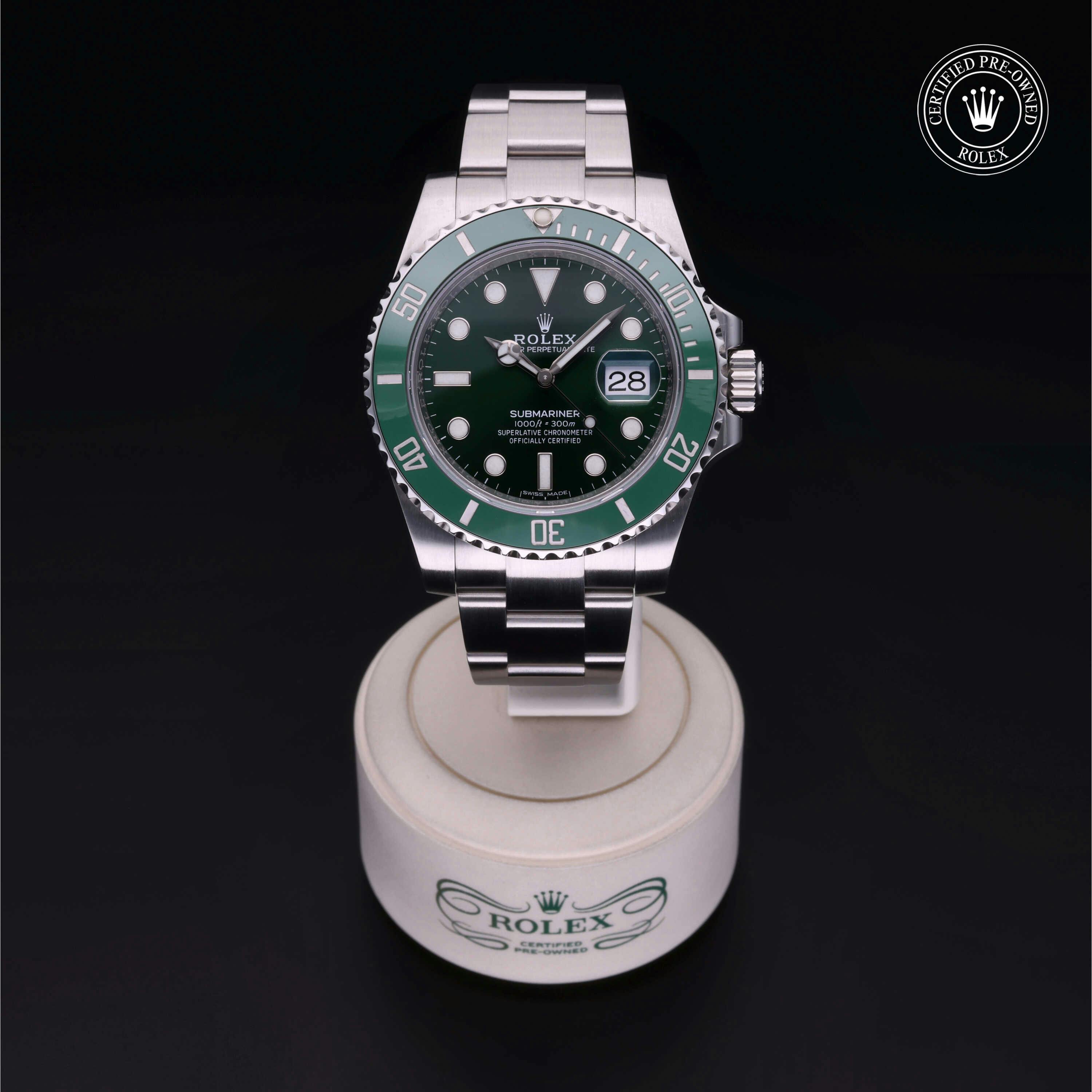 Rolex Certified Pre-Owned Submariner Date (116610LV) self - winding automatic watch, features a 40mm stainless steel case with a green cerachrom bezel surrounding a green dial on a stainless steel oyster bracelet. Functions include hours, minutes, seconds and date. This watch has received Rolex-authorized service and certification. It does not come with the original box or papers, but includes a custom Rolex Certified Pre-Owned hang tag, travel pouch and RCPO international warranty card.