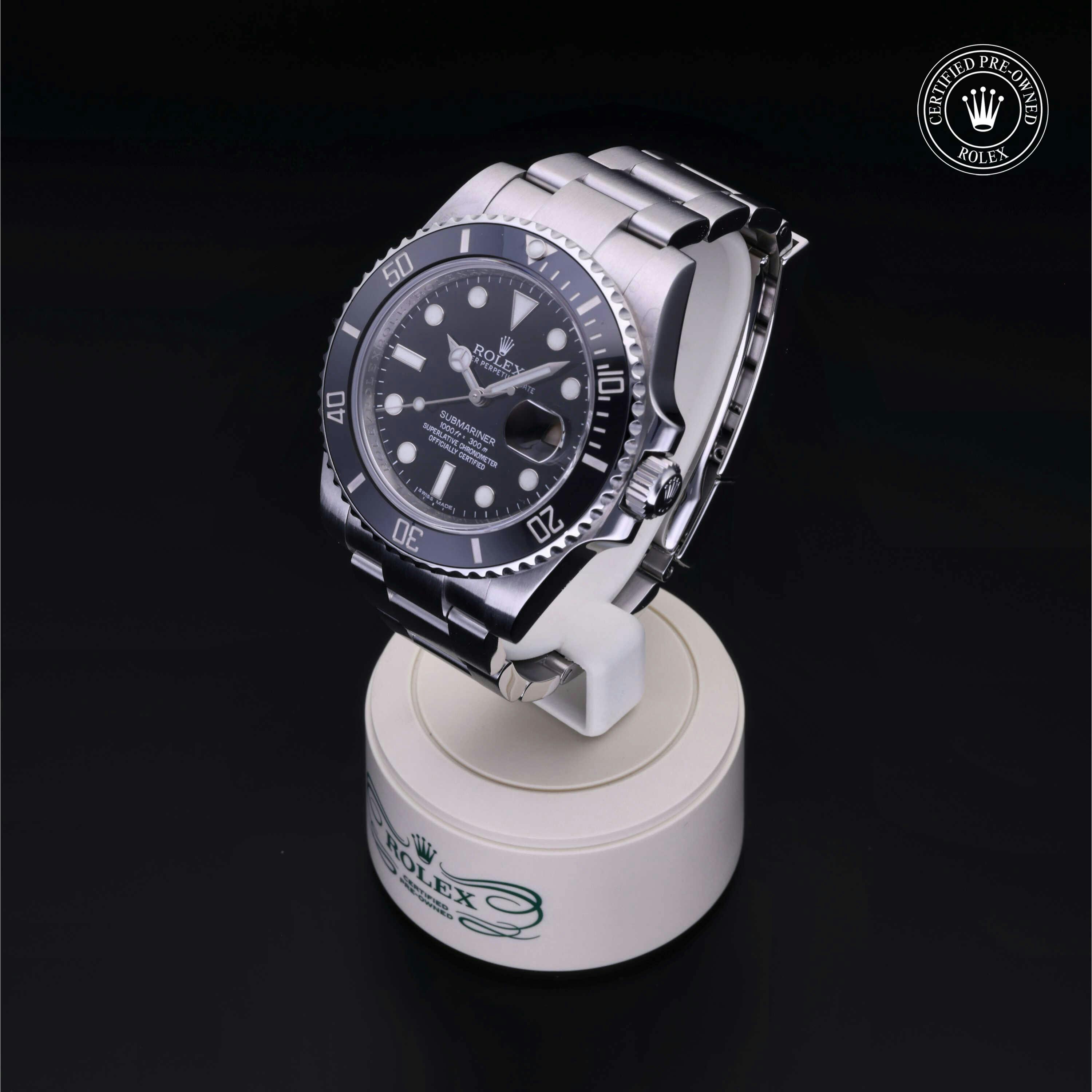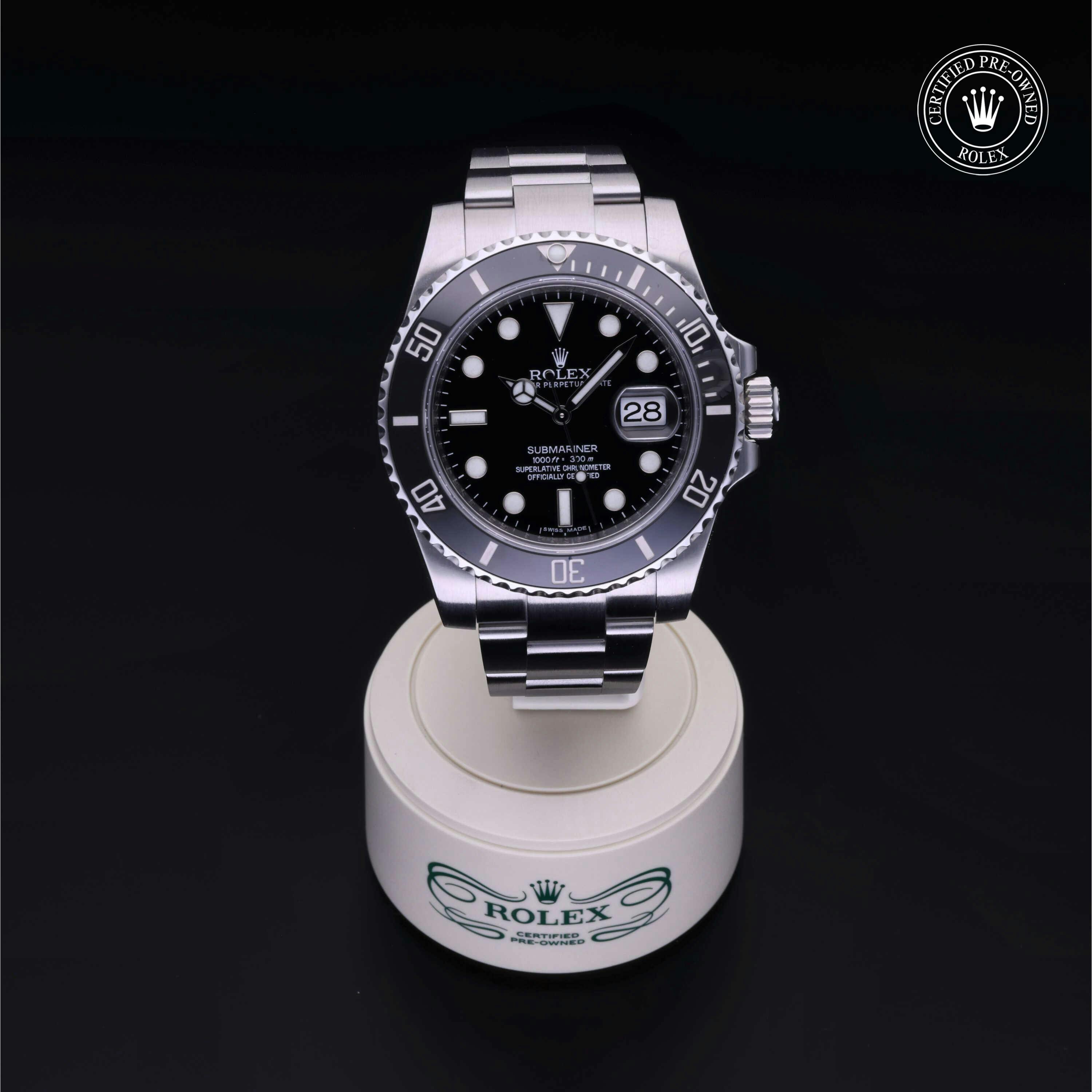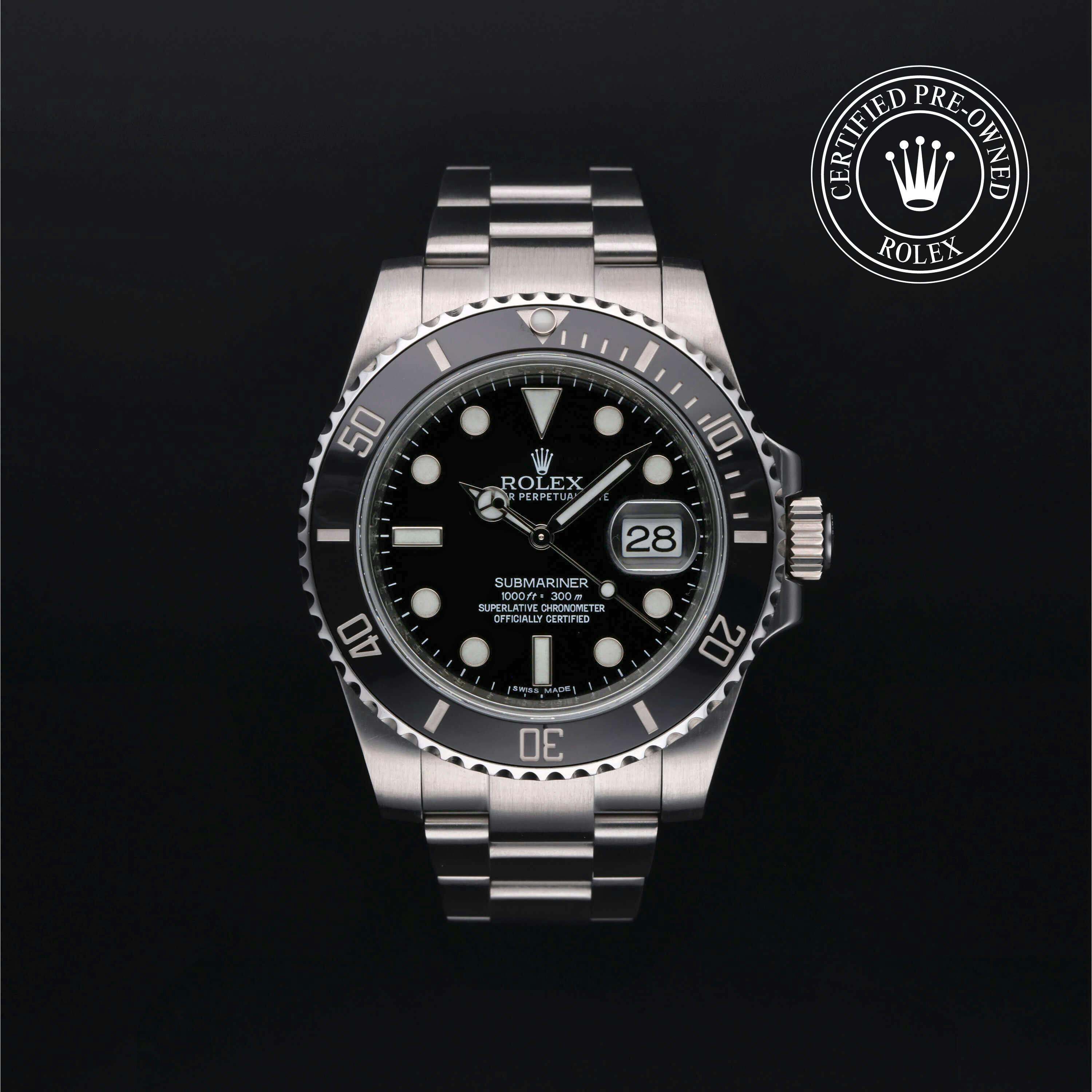 Rolex Certified Pre-Owned Submariner Date (116610LN) self - winding automatic watch, features a 40mm stainless steel case with a black cerachrom bezel insert surrounding a black dial on a stainless steel oyster bracelet. Functions include hours, minutes, seconds and date. This watch has received Rolex-authorized service and certification. It does not come with the original box or papers, but includes a custom Rolex Certified Pre-Owned hang tag, travel pouch and RCPO international warranty.