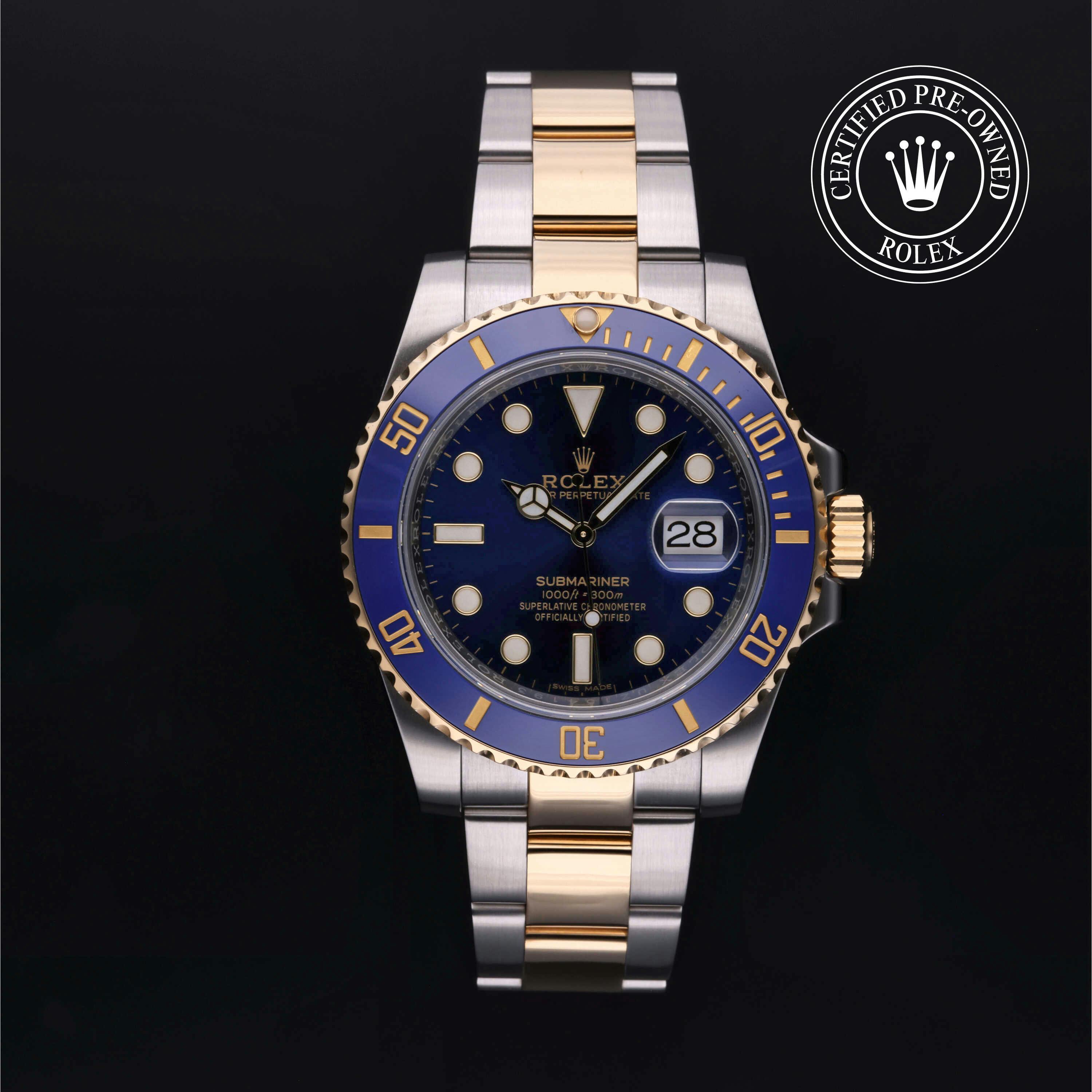 Rolex Certified Pre-Owned Submariner Date (116613LB) self - winding automatic watch, features a 40mm stainless steel case with an 18k yellow gold and blue cerachrom bezel surrounding a blue dial on a stainless steel and 18k yellow gold oyster bracelet. Functions include hours, minutes, seconds and date. This watch has received Rolex-authorized service and certification. It does not come with the original box or papers, but includes a custom Rolex Certified Pre-Owned hang tag, travel pouch and RCPO international warranty card.