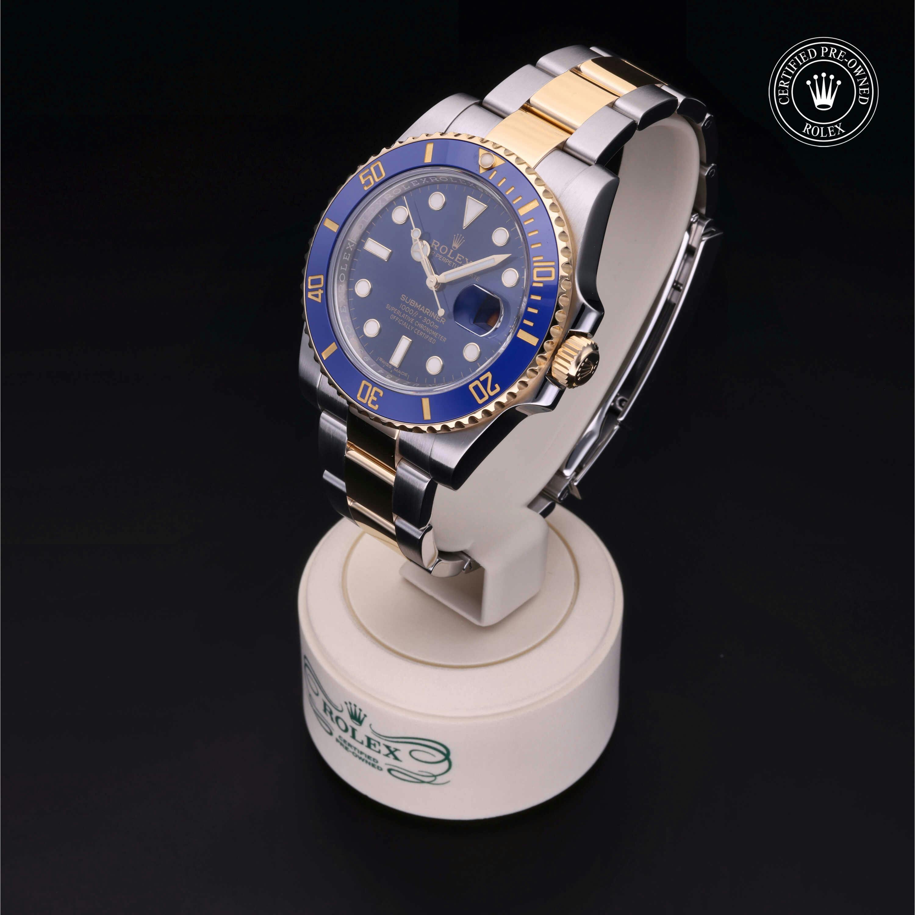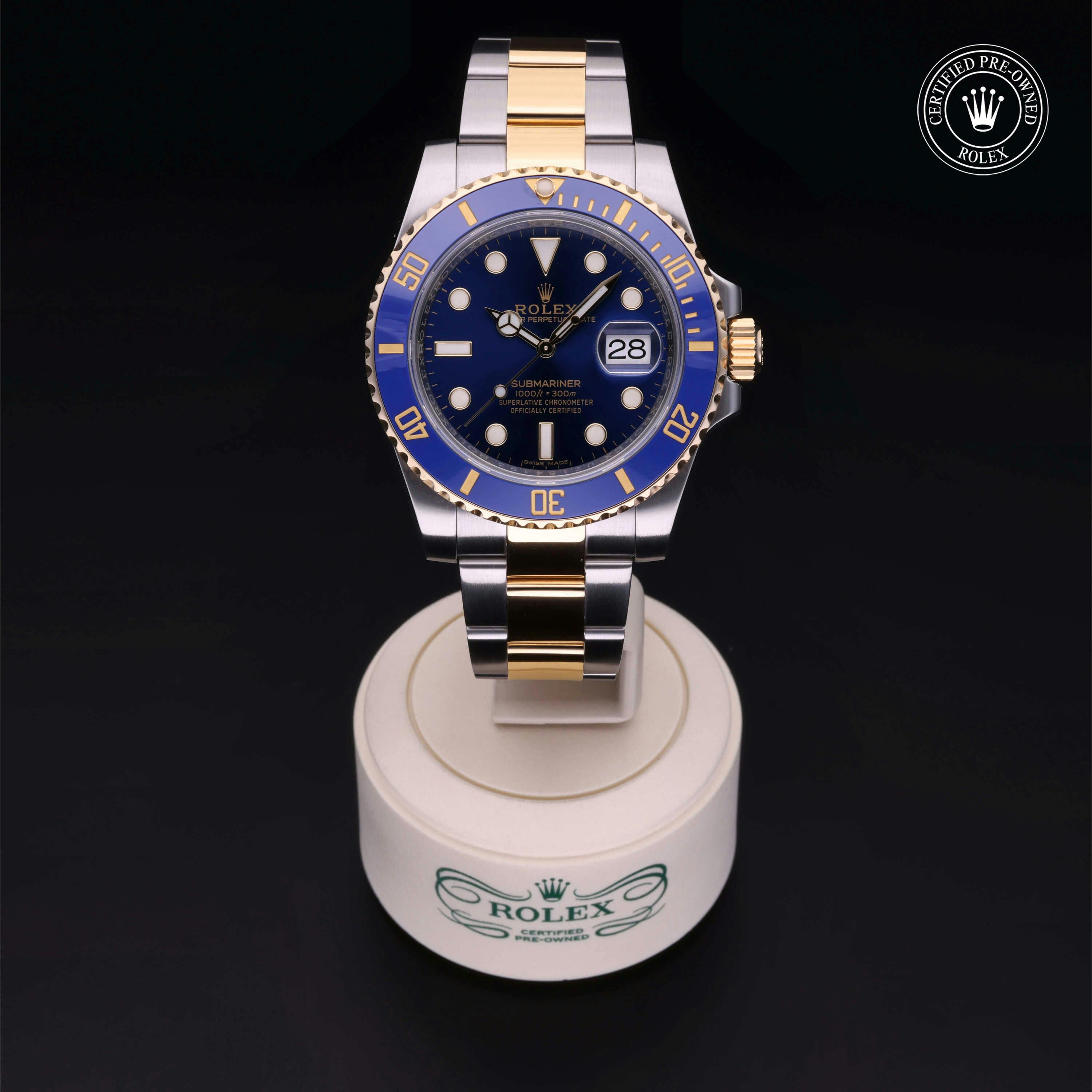Rolex Certified Pre-Owned Submariner Date (116613LB) self - winding automatic watch, features a 40mm stainless steel case with an 18k yellow gold and blue cerachrom bezel surrounding a blue dial on a stainless steel and 18k yellow gold oyster bracelet. Functions include hours, minutes, seconds and date. This watch has received Rolex-authorized service and certification. It does not come with the original box or papers, but includes a custom Rolex Certified Pre-Owned hang tag, travel pouch and RCPO international warranty card.