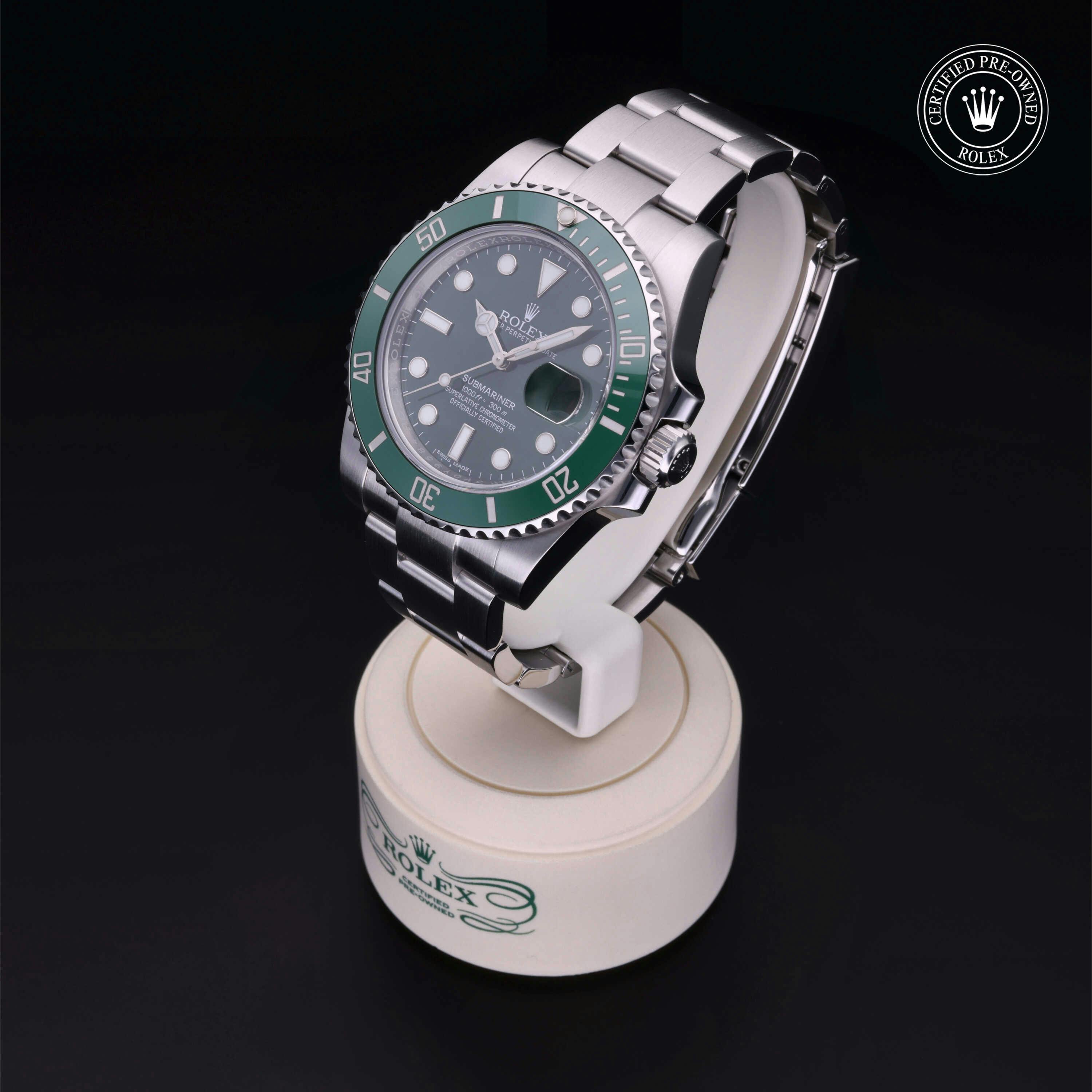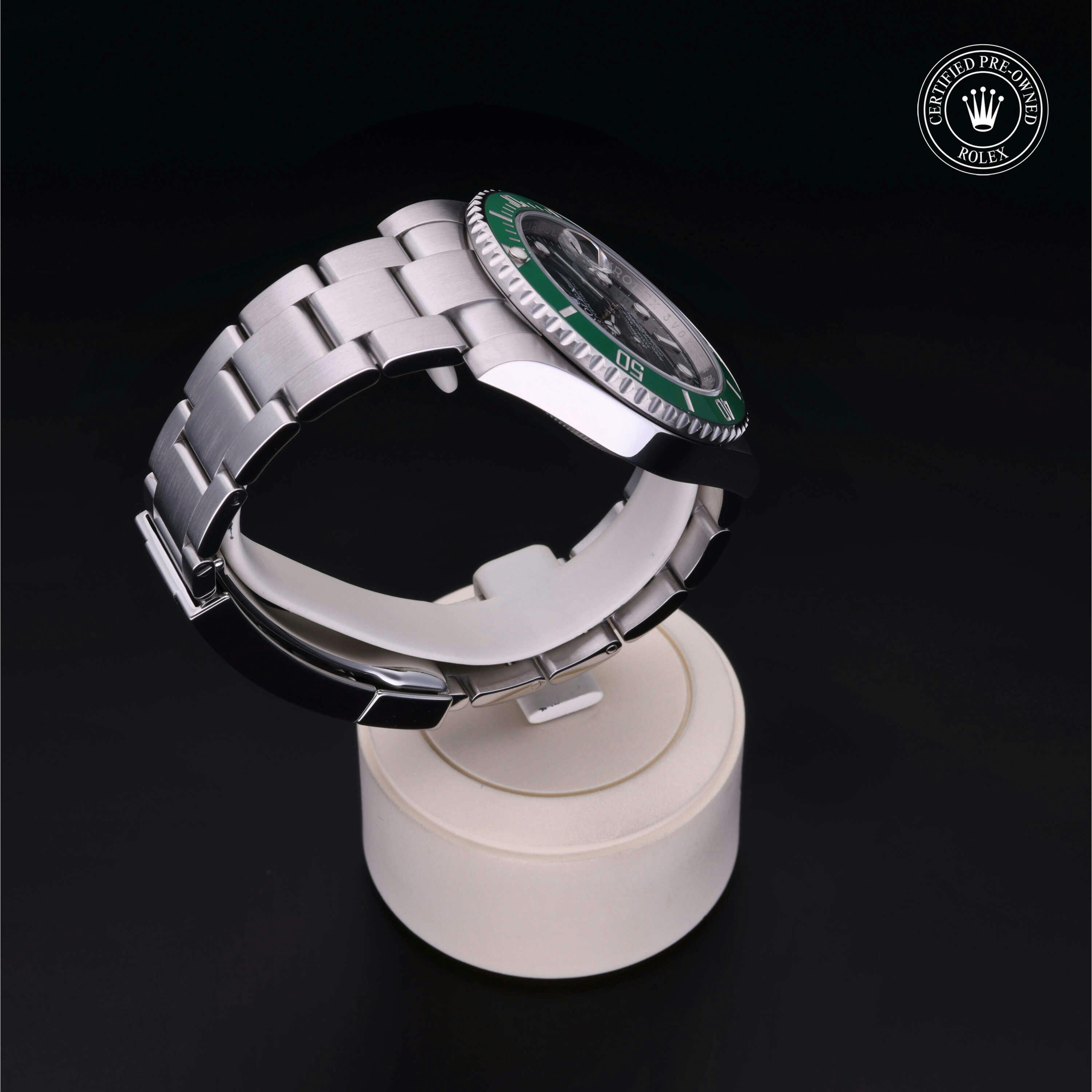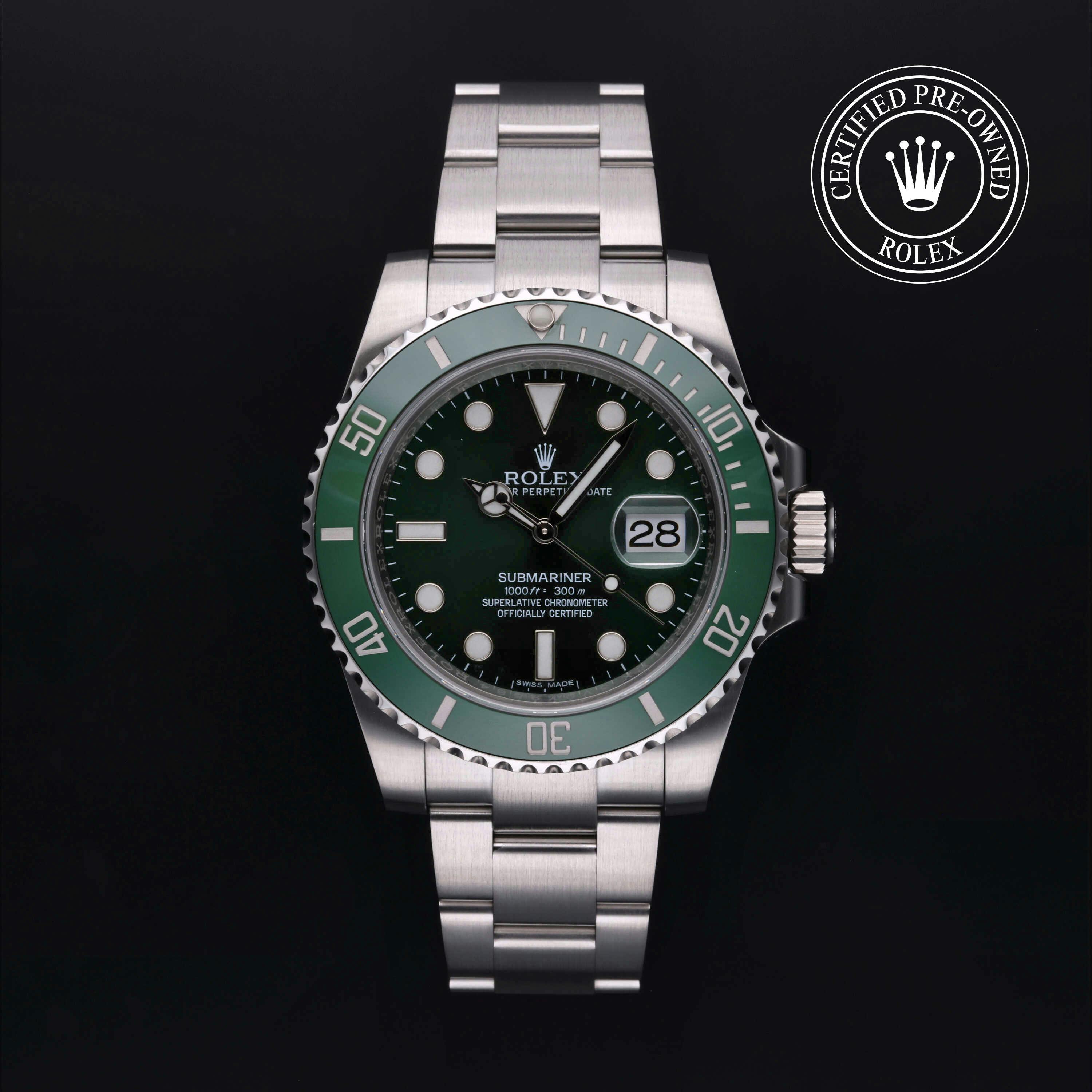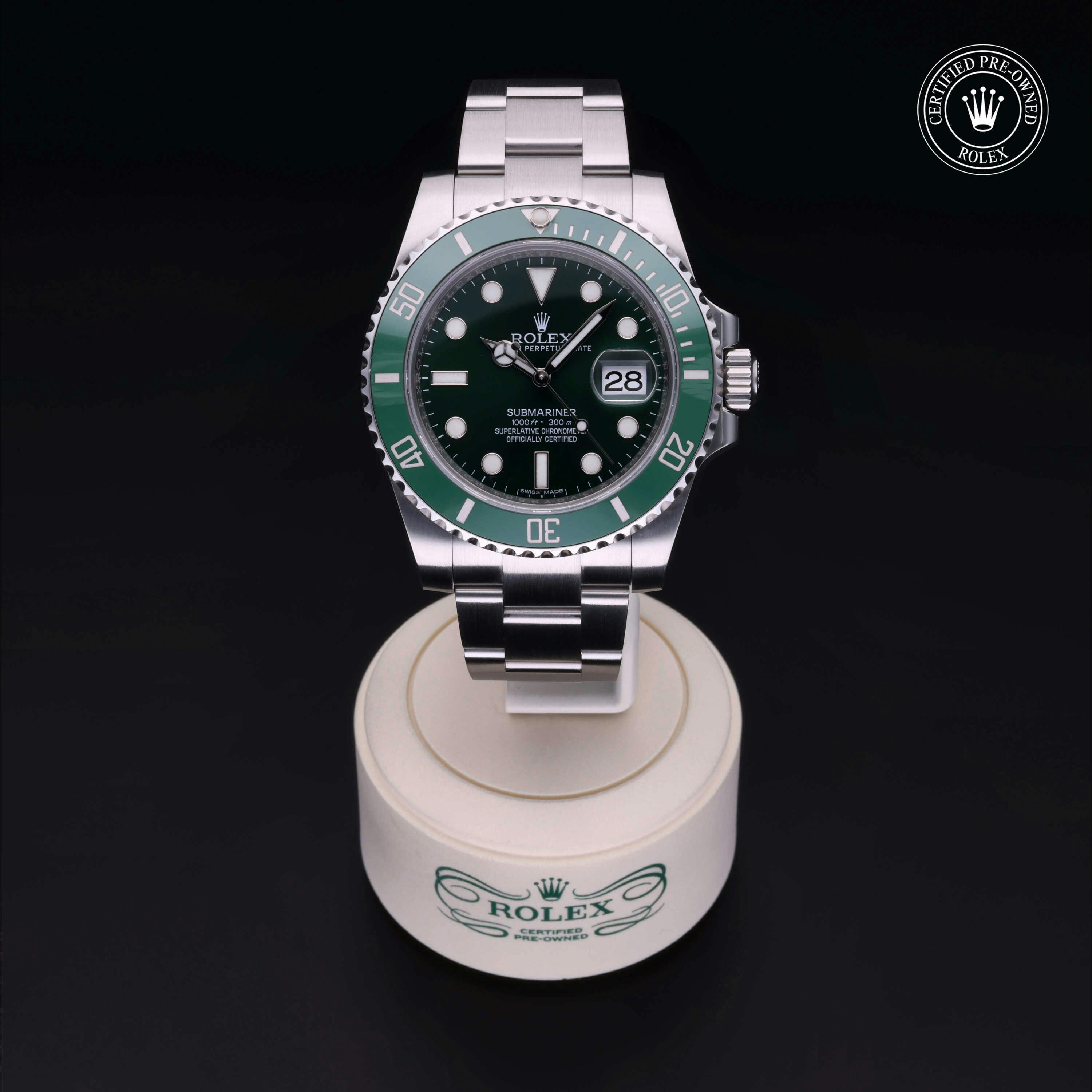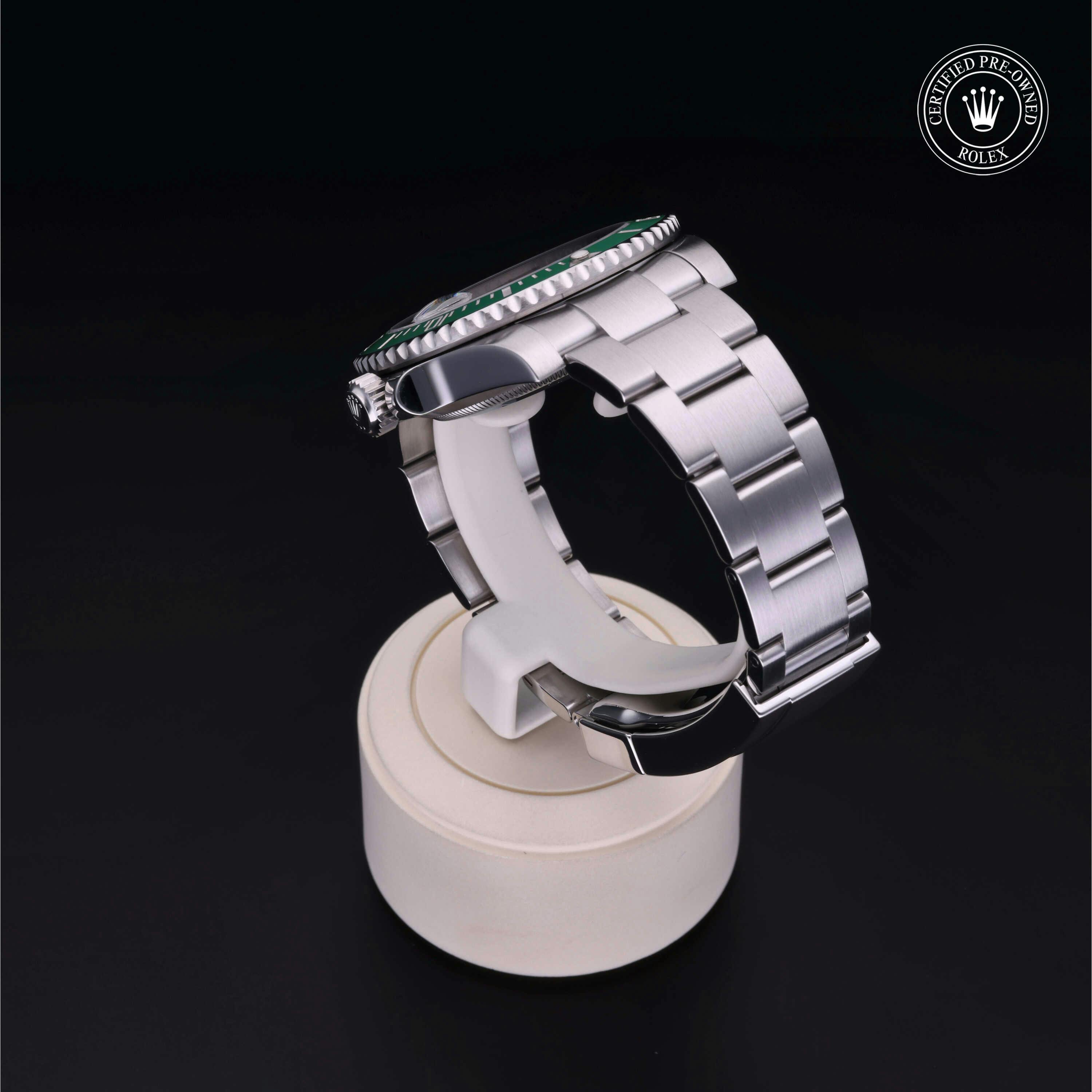 Rolex Certified Pre-Owned Submariner Date (116610LV) self - winding automatic watch, features a 40mm stainless steel case with a green cerachrom bezel surrounding a green dial on a stainless steel oyster bracelet. Functions include hours, minutes, seconds and date. This watch has received Rolex-authorized service and certification. It does not come with the original box or papers, but includes a custom Rolex Certified Pre-Owned hang tag, travel pouch and RCPO international warranty card.