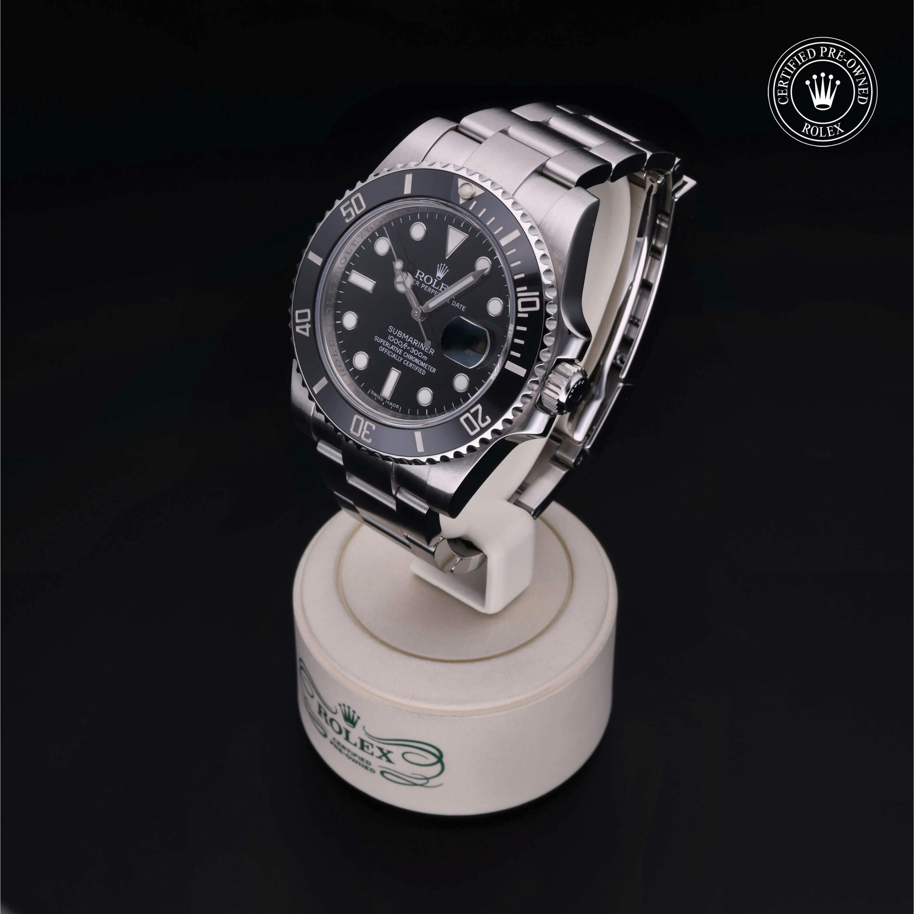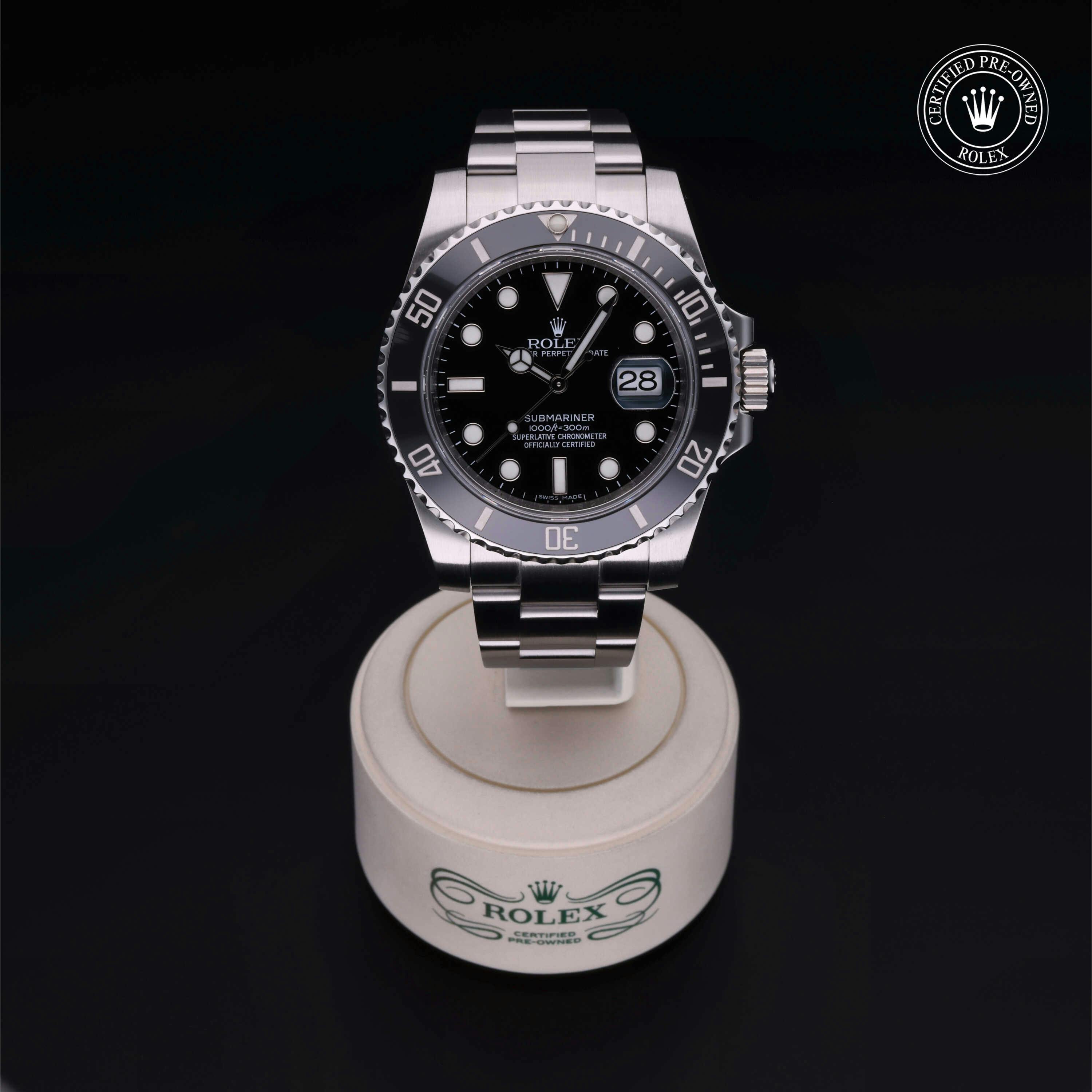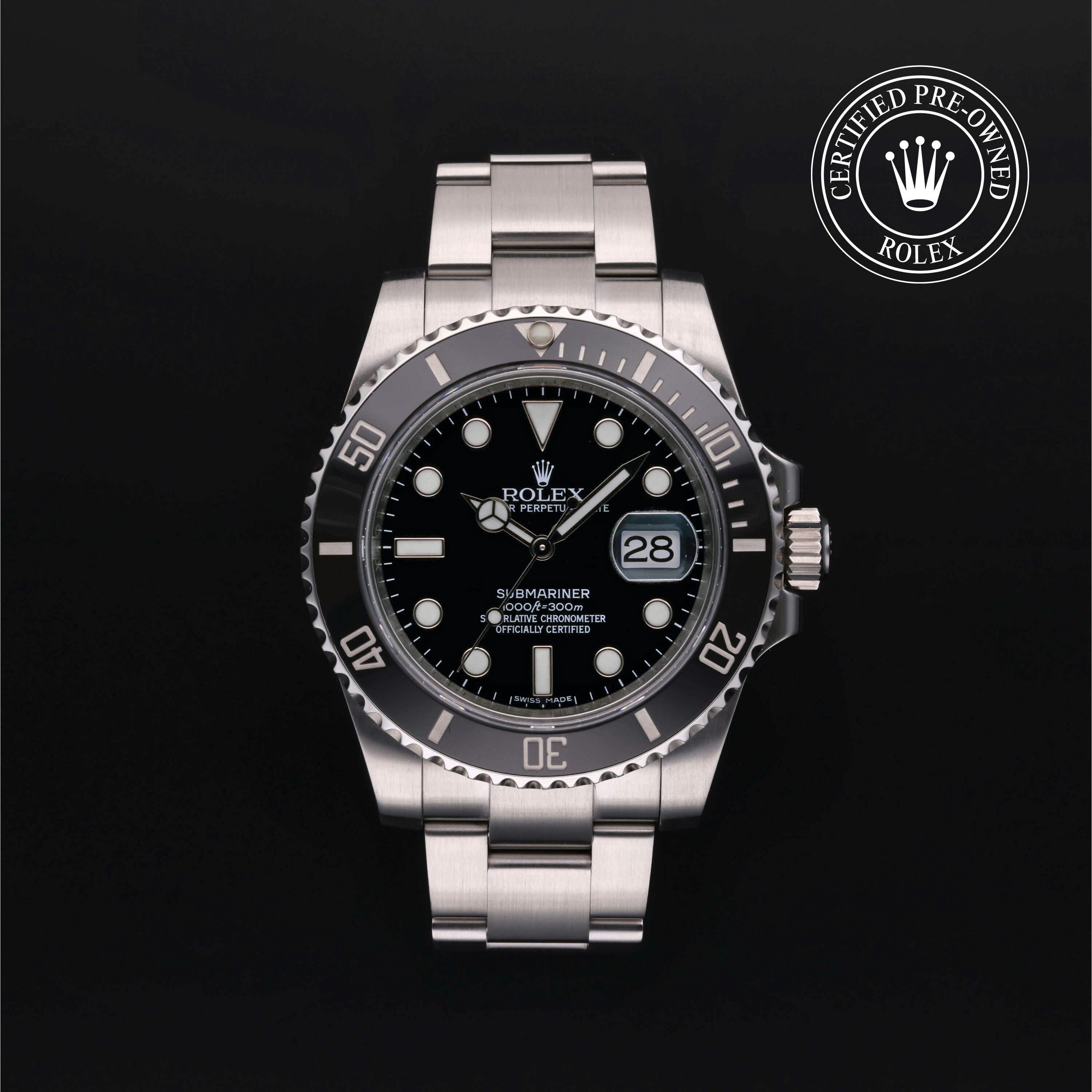 Rolex Certified Pre-Owned Submariner Date (116610LN) self - winding automatic watch, features a 40mm stainless steel case with a black cerachrom bezel surrounding a black dial on a stainless steel oyster bracelet. Functions include hours, minutes, seconds and date. This watch has received Rolex-authorized service and certification. It does not come with the original box or papers, but includes a custom Rolex Certified Pre-Owned hang tag, travel pouch and RCPO international warranty card.