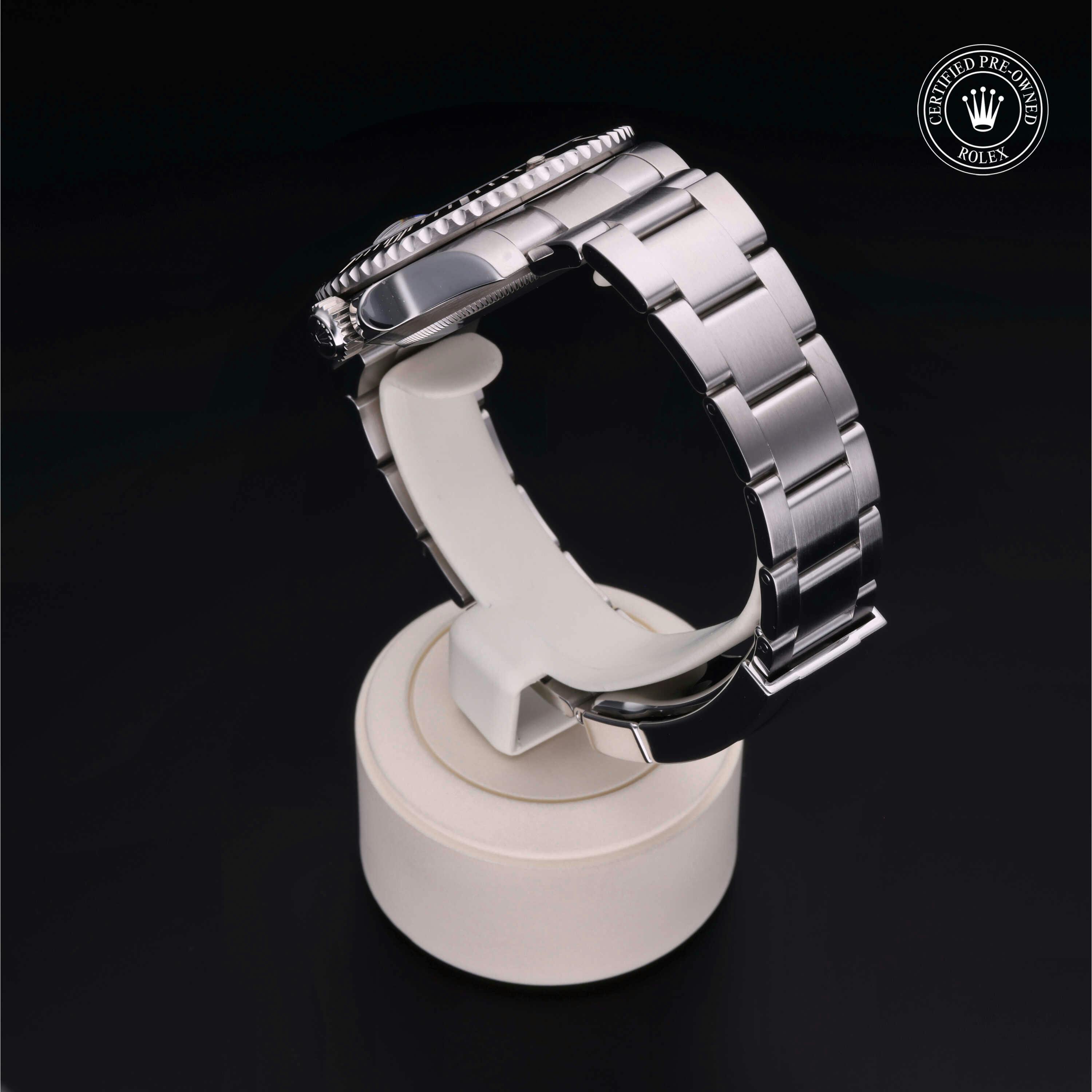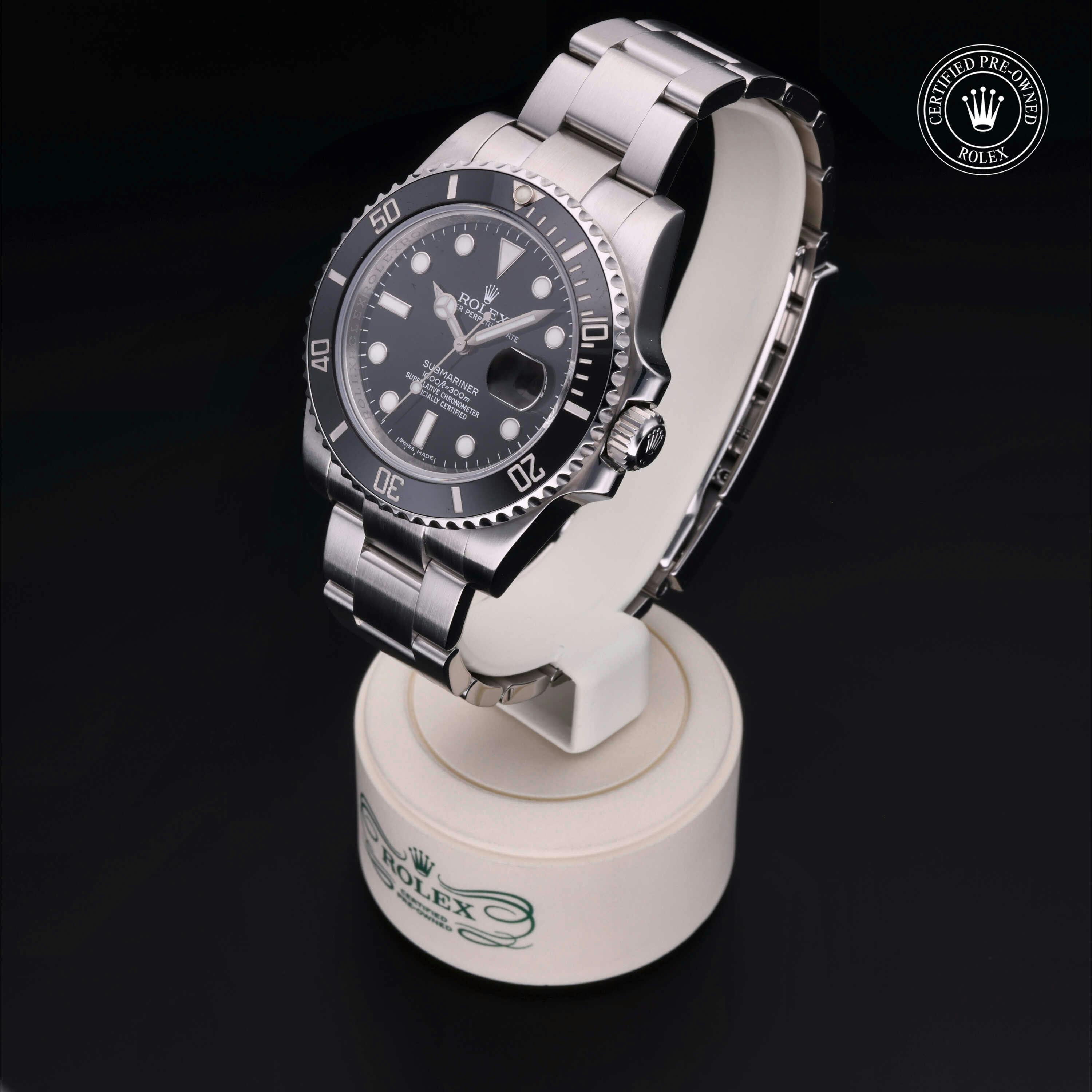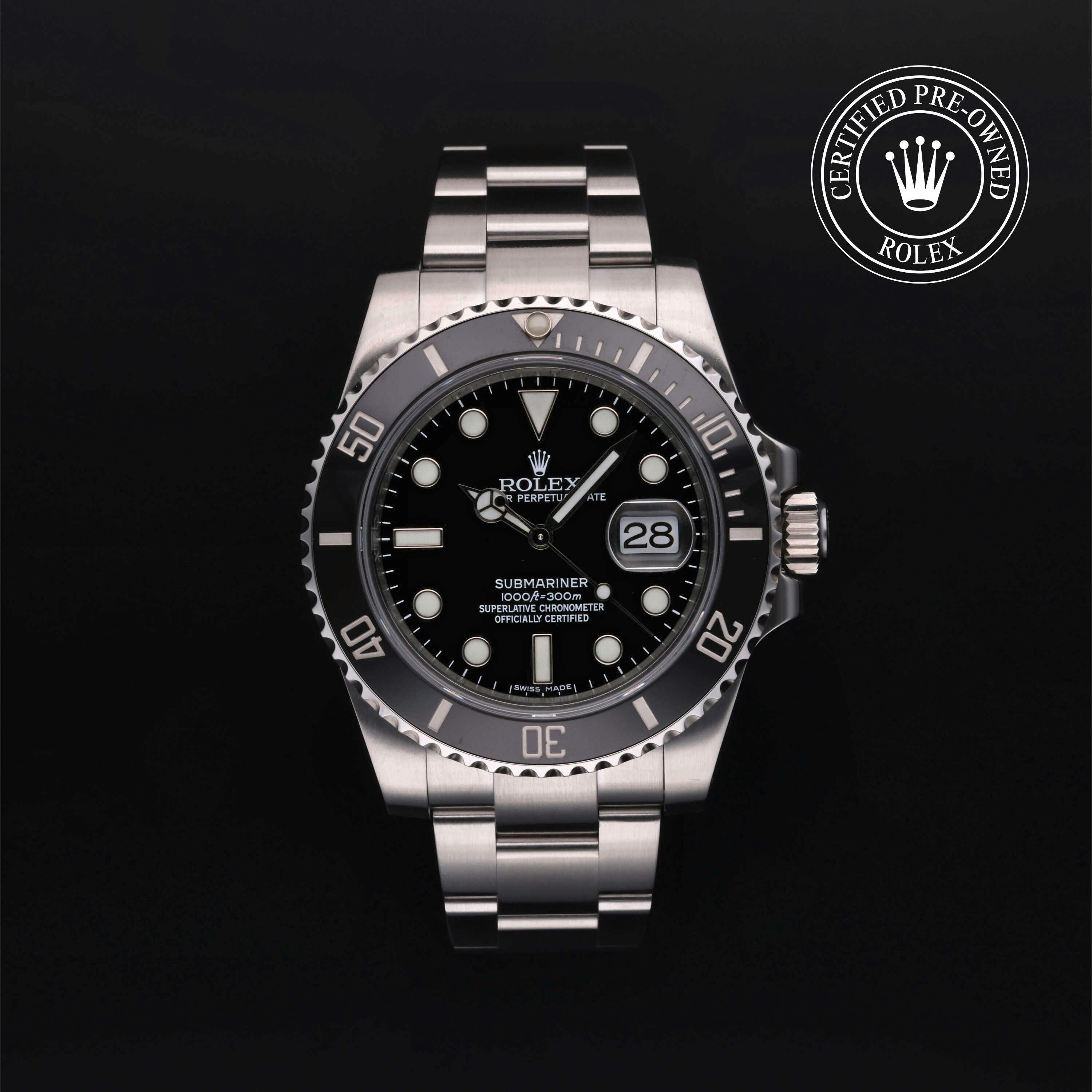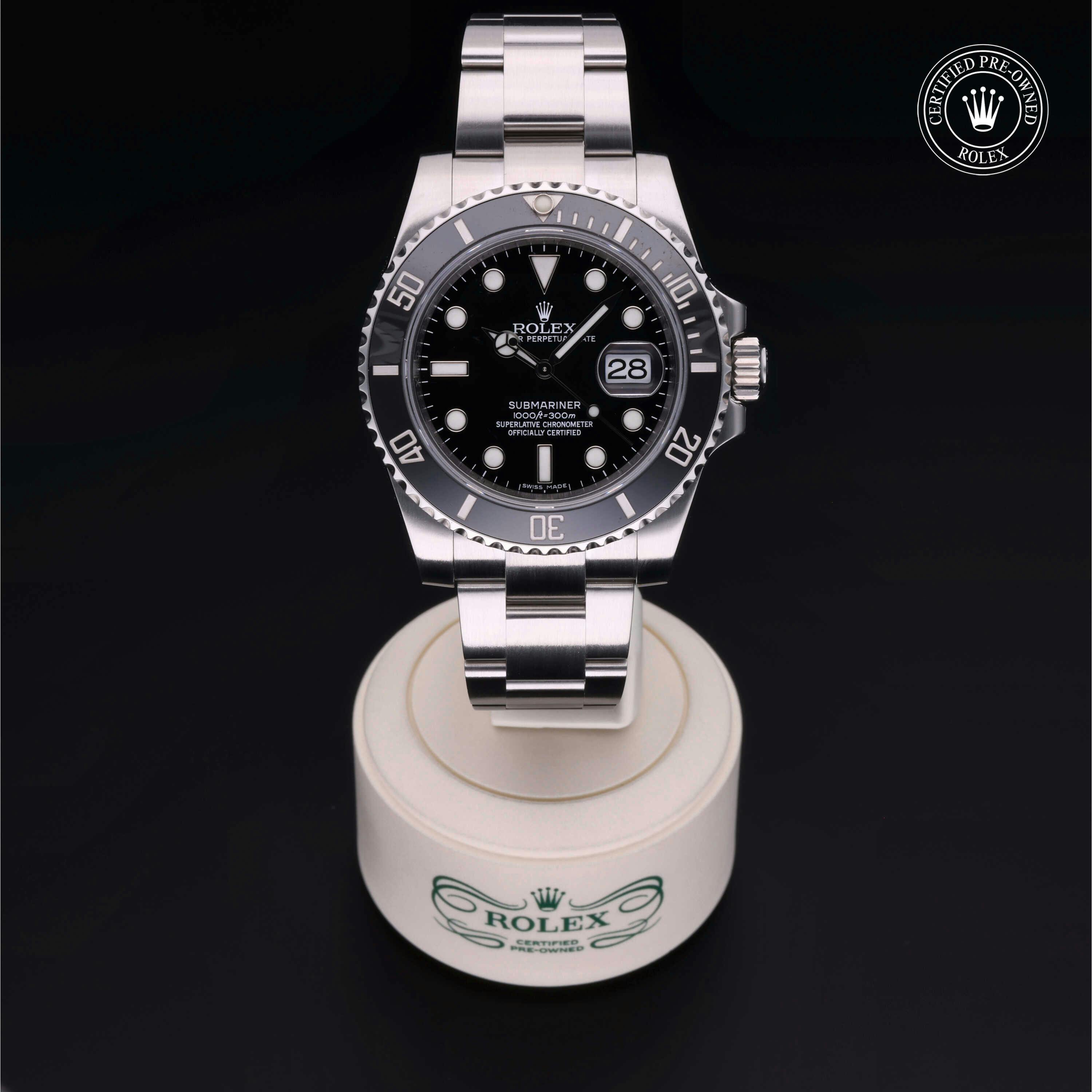 Rolex Certified Pre-Owned Submariner Date (116610LN) self - winding automatic watch, features a 40mm stainless steel case with a stainless steel and black cerachrom bezel surrounding a black dial. The watch is secured on a stainless steel Oyster bracelet complete with a folding buckle. Functions include hours, minutes, seconds and date. This watch has received Rolex-authorized service and certification. It comes with the original box and papers, and includes a custom Rolex Certified Pre-Owned hang tag, travel pouch and RCPO international warranty card.