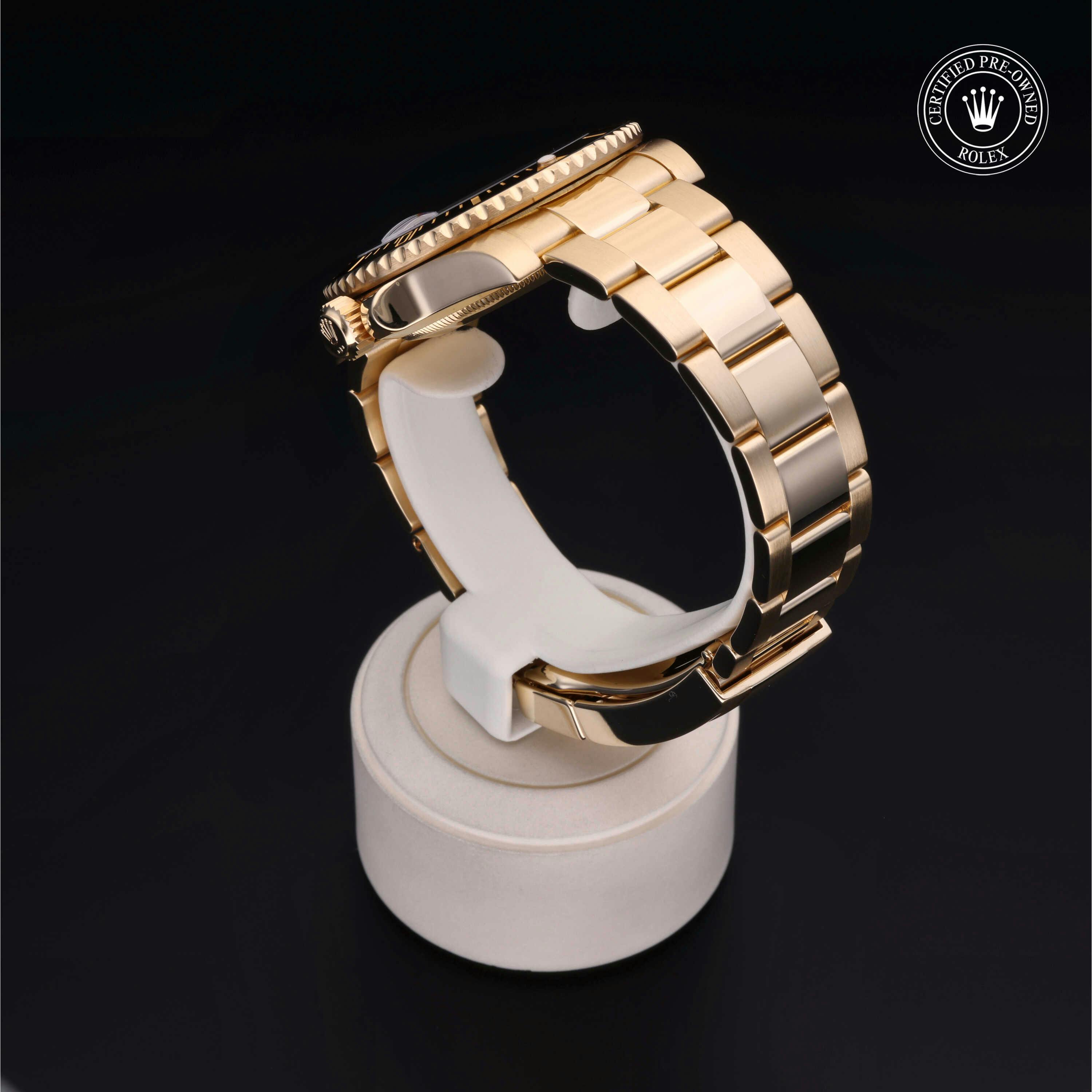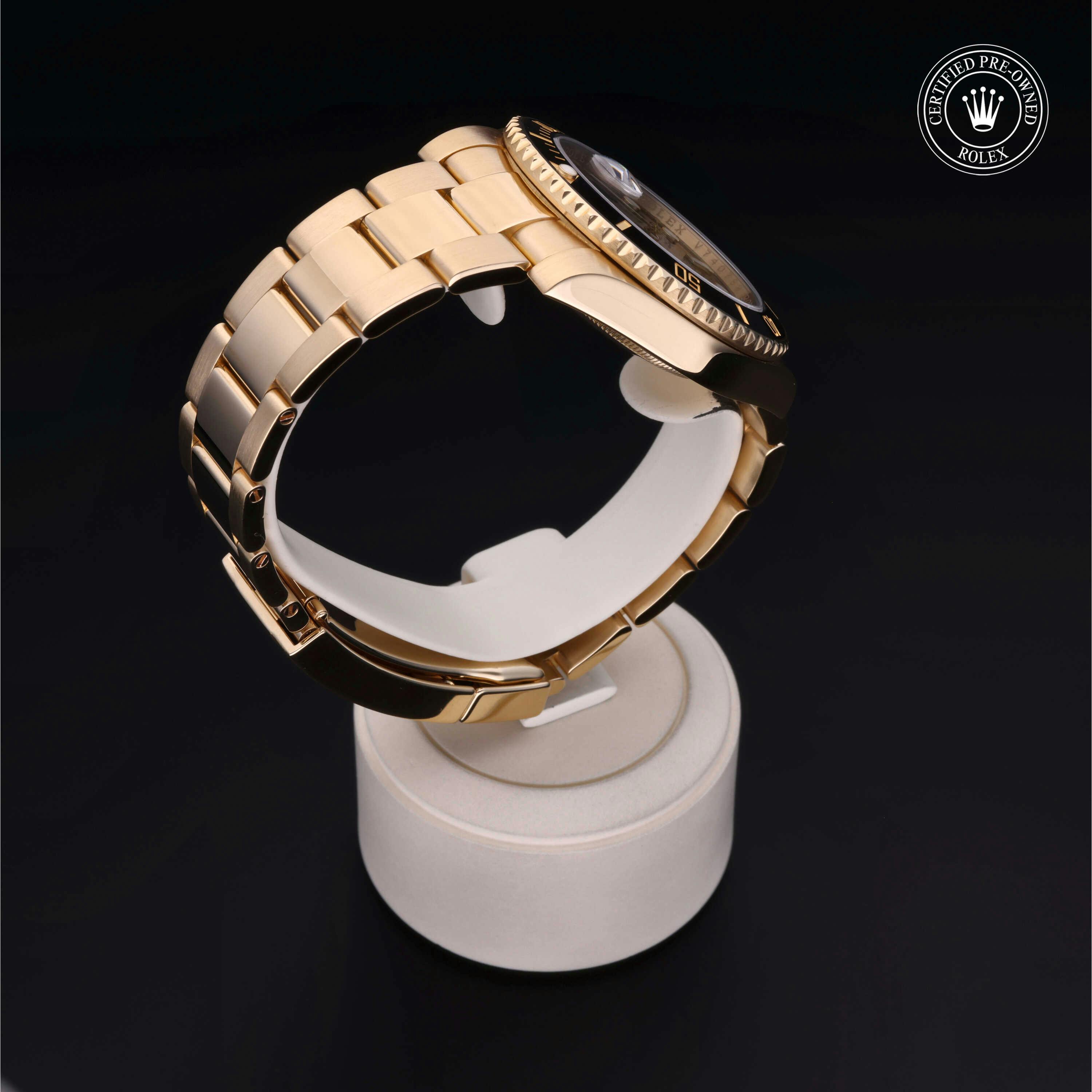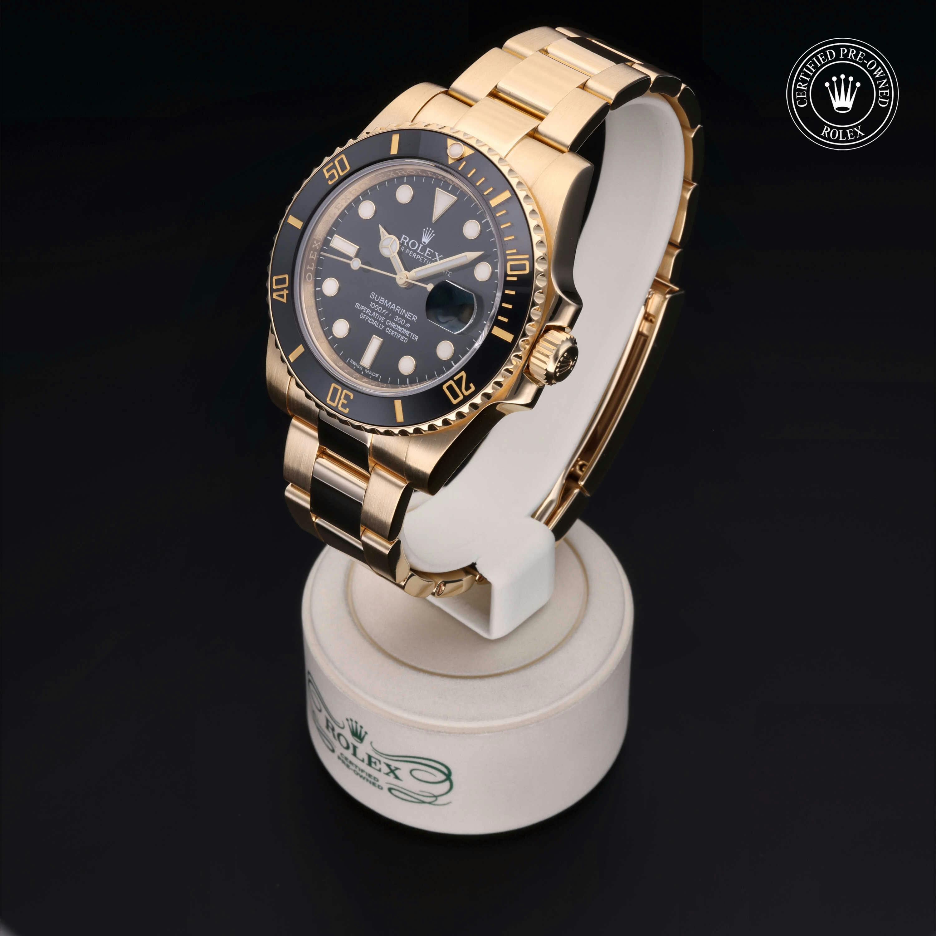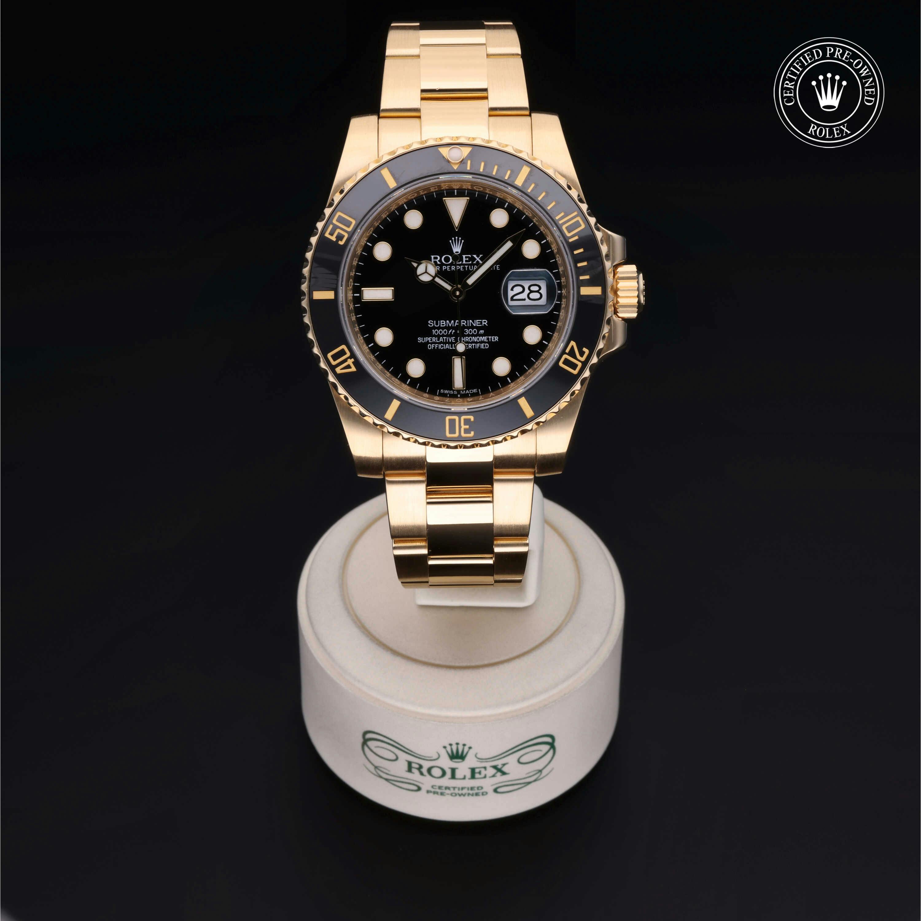 Rolex Certified Pre-Owned Submariner Date (116618LN) self - winding automatic watch, features a 40mm 18k yellow gold case with a black cerachrom bezel surrounding a black dial on an 18k yellow gold oyster bracelet. Functions include hours, minutes, seconds and date. This watch has received Rolex-authorized service and certification. It comes with the original box and papers, and includes a custom Rolex Certified Pre-Owned hang tag, travel pouch and RCPO international warranty card.