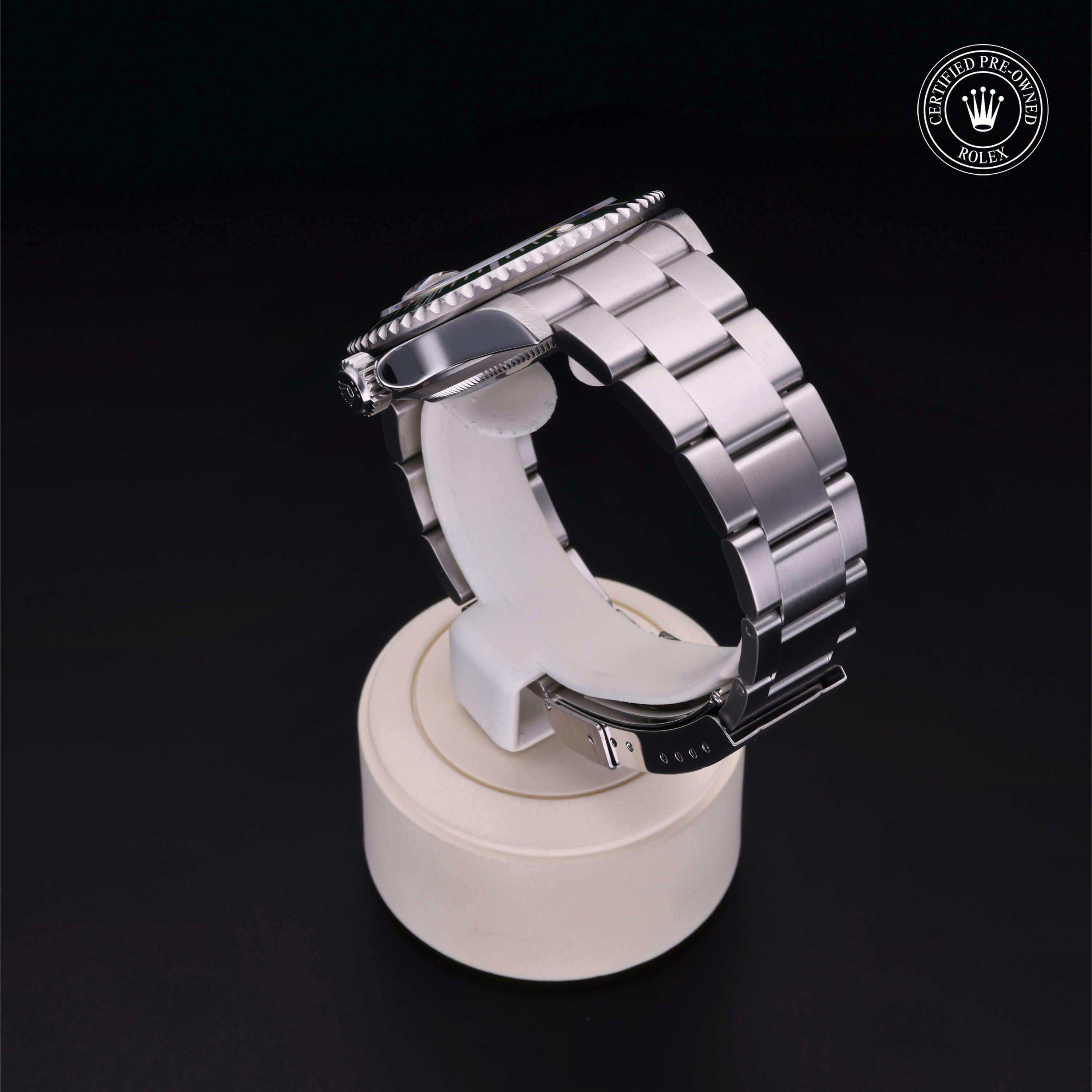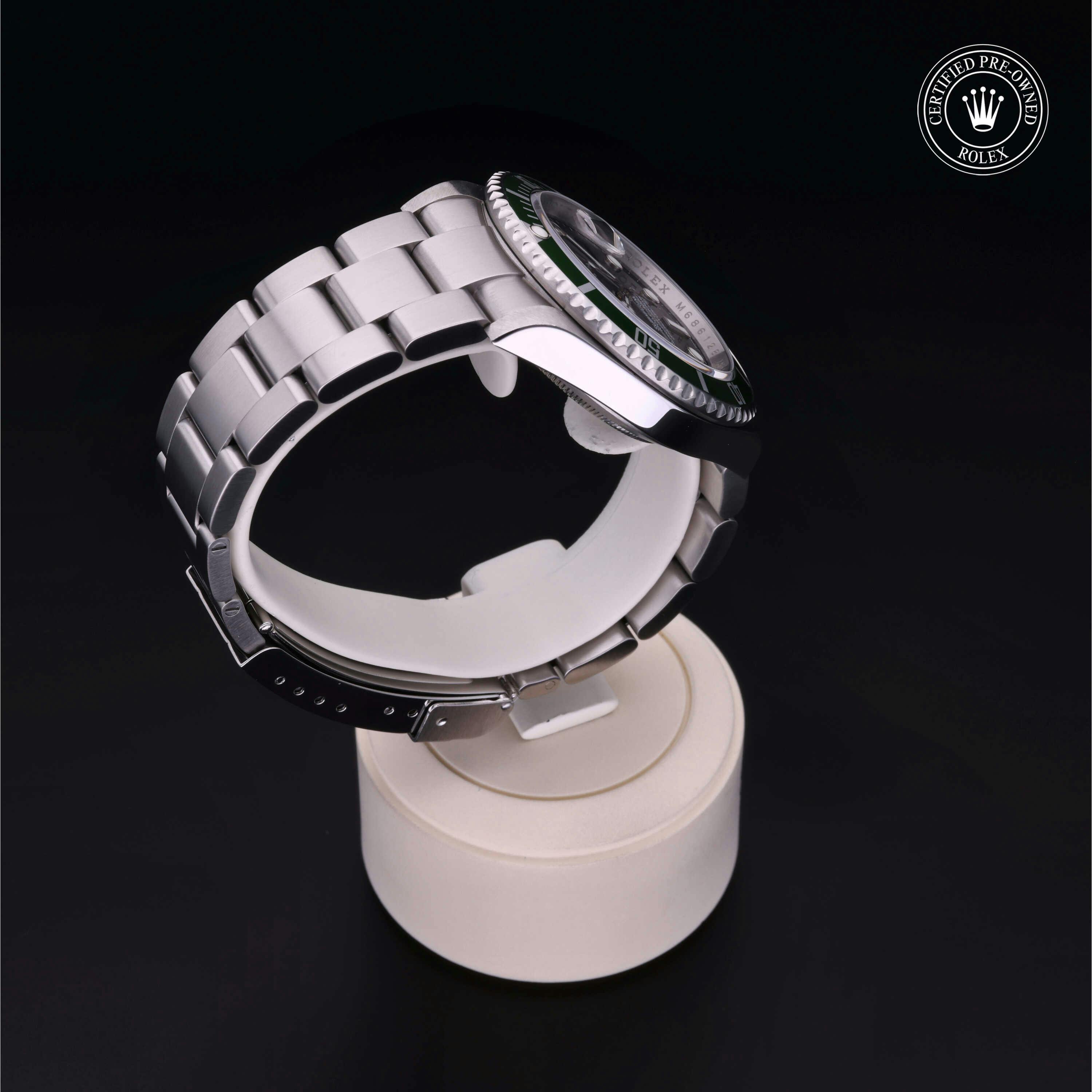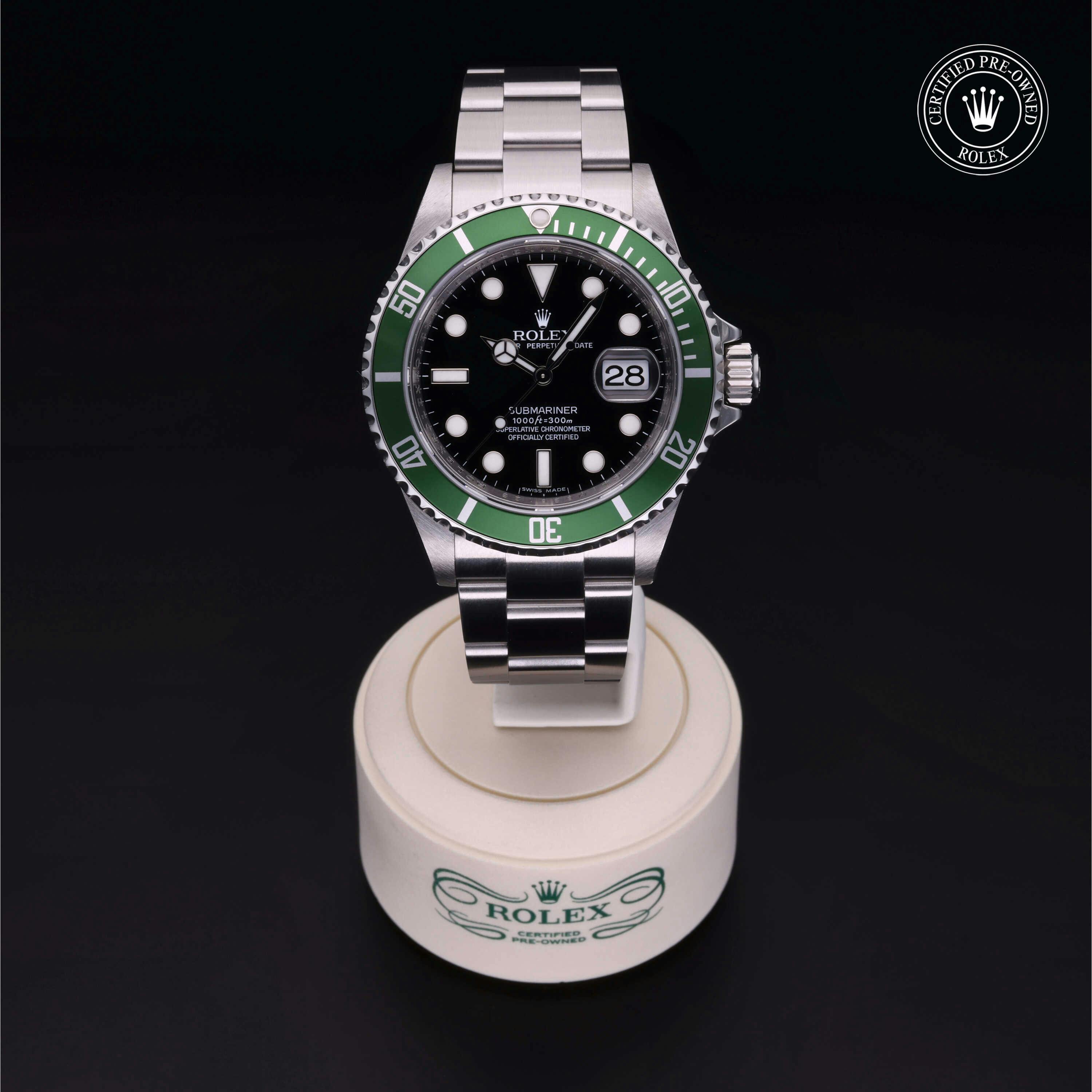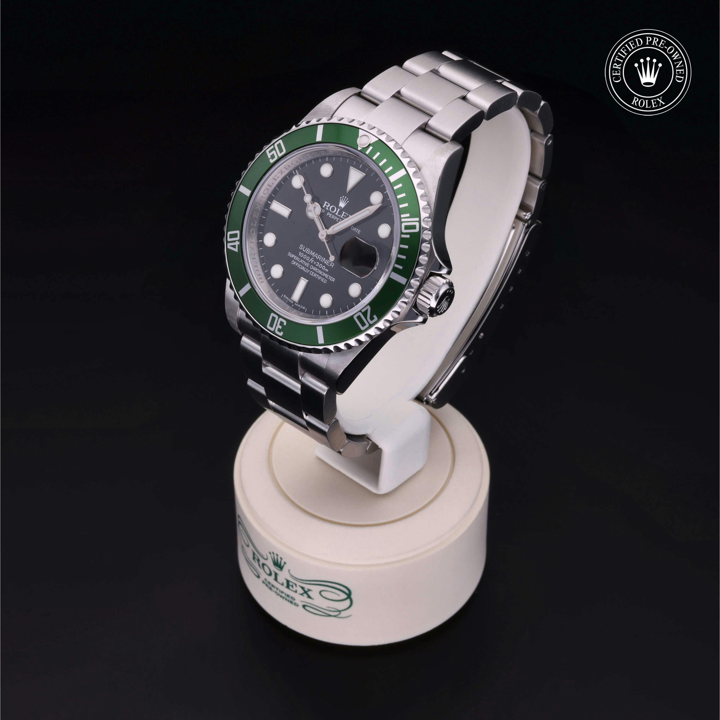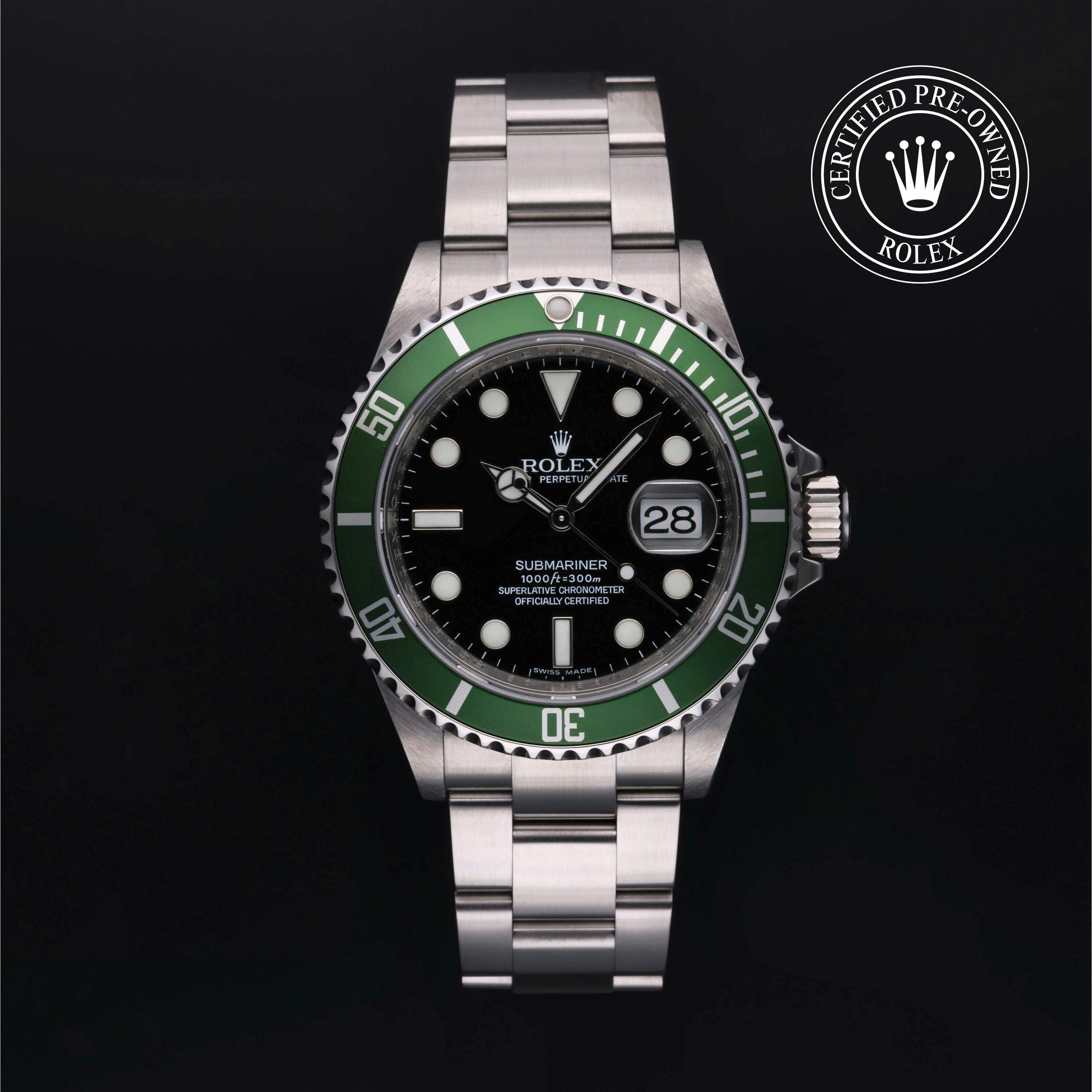 Rolex Certified Pre-Owned Submariner Date (16610LV) self - winding automatic watch, features a 40mm stainless steel case with a green aluminum bezel surrounding a black dial on a stainless steel oyster bracelet. Functions include hours, minutes, seconds and date. This watch has received Rolex-authorized service and certification. It does not come with the original box or papers, but includes a custom Rolex Certified Pre-Owned hang tag, travel pouch and RCPO international warranty card.