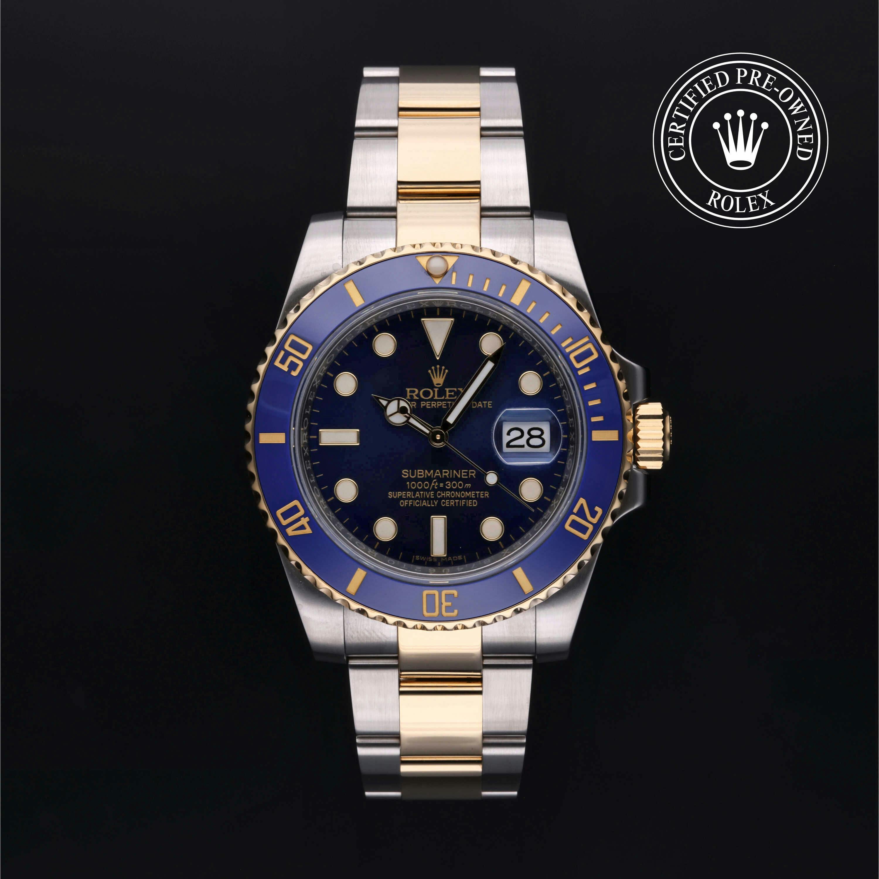 Rolex Certified Pre-Owned Submariner Date (116613LB) self - winding automatic watch, features a 40mm stainless steel case with an 18k yellow gold and blue cerachrom bezel surrounding a blue dial on a stainless steel and 18k yellow gold oyster bracelet. Functions include hours, minutes, seconds and date. This watch has received Rolex-authorized service and certification. It does not come with the original box or papers, but includes a custom Rolex Certified Pre-Owned hang tag, travel pouch and RCPO international warranty card.