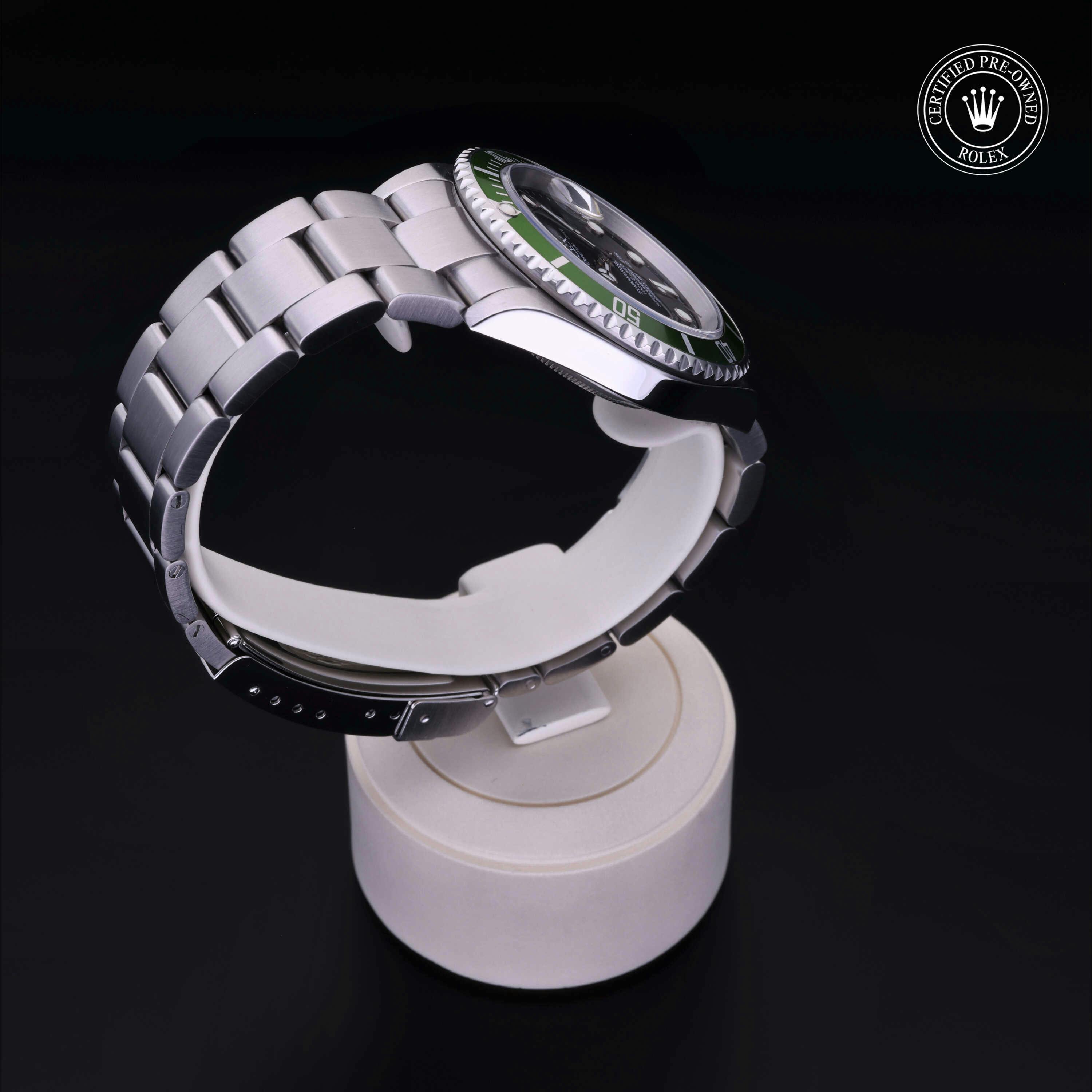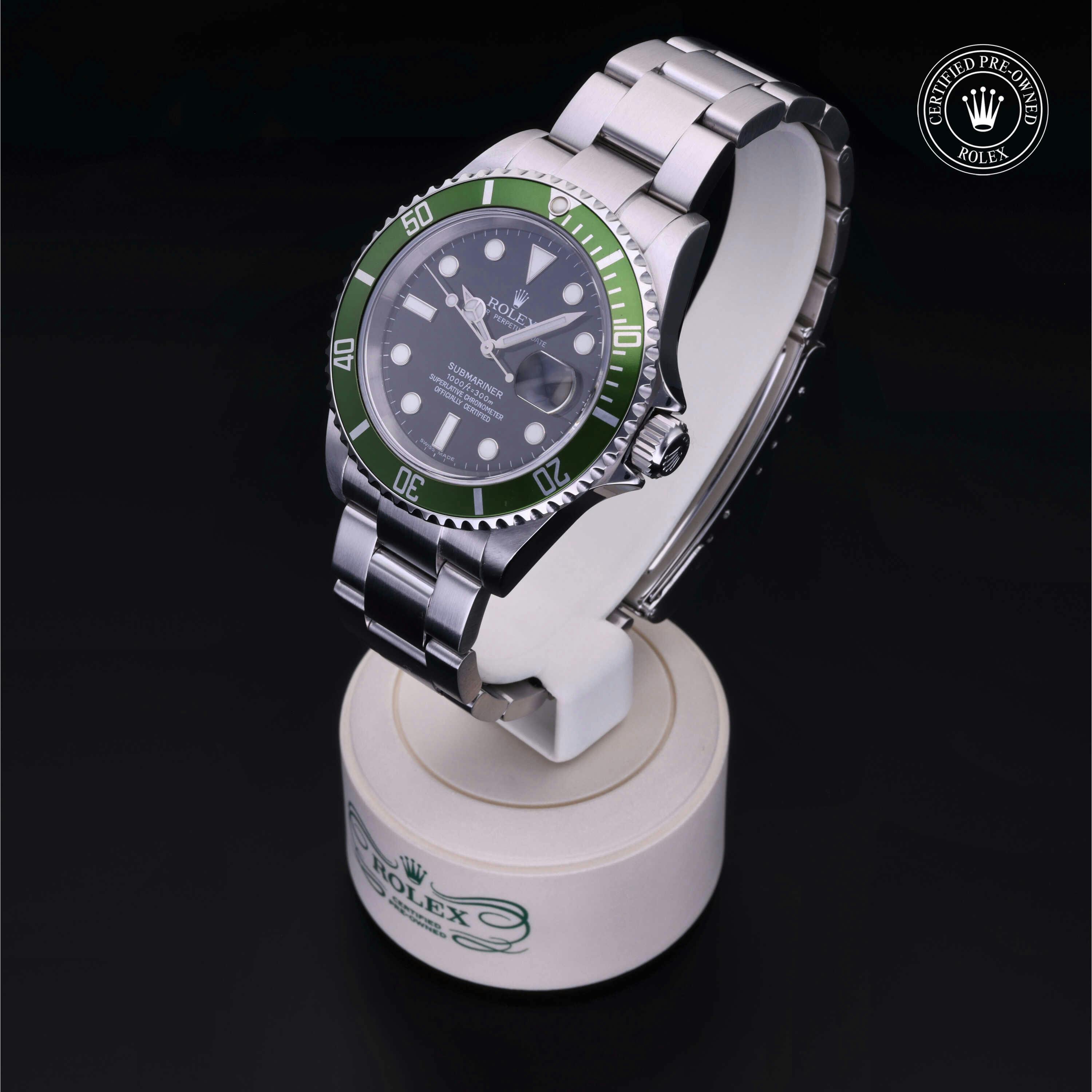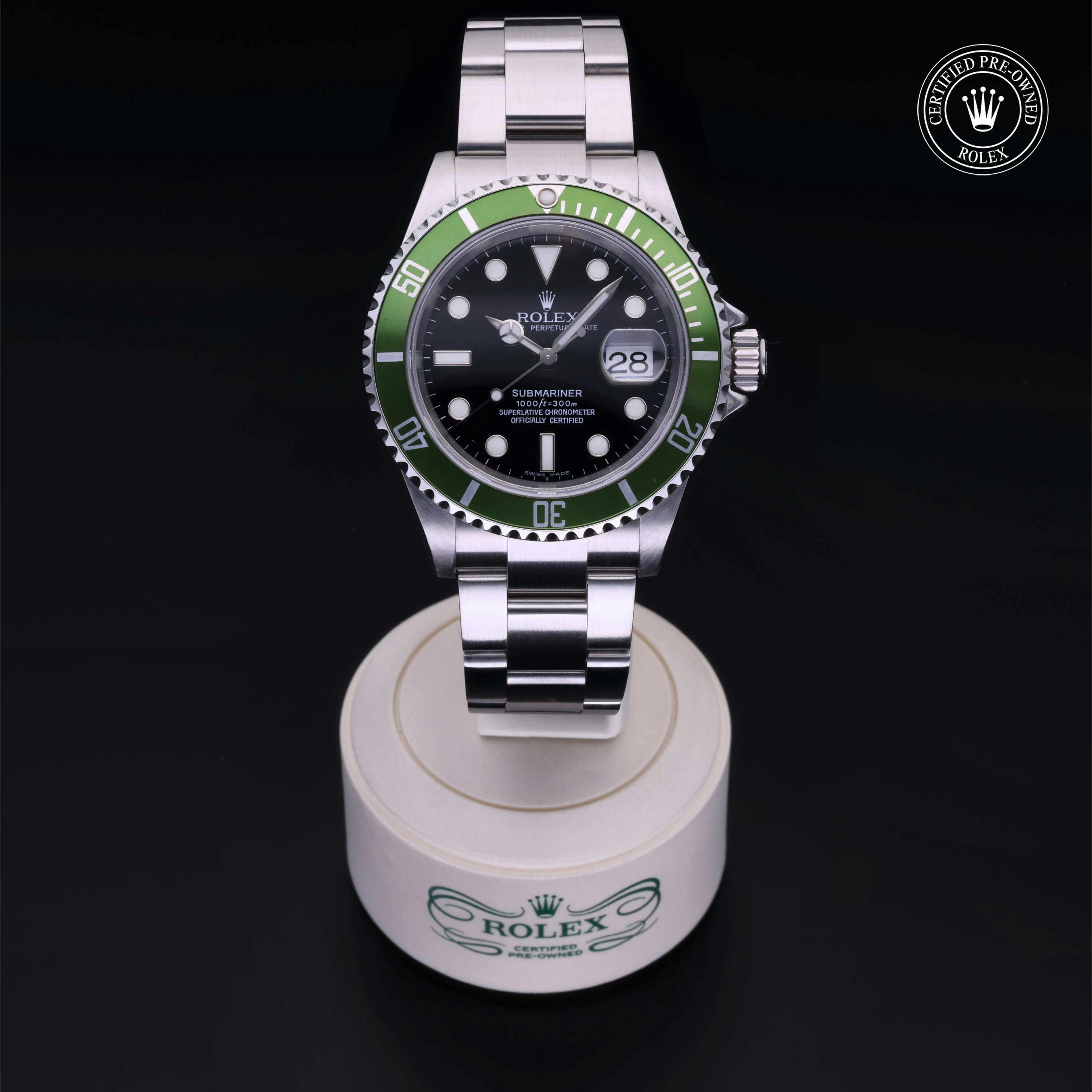 Rolex Certified Pre-Owned Submariner (16610LV) self - winding automatic watch, features a 40mm stainless steel case with a green aluminium bezel surrounding a black dial on a stainless steel Oyster bracelet. Functions include hours, minutes, seconds and date. This watch has received Rolex-authorized service and certification. It does not come with the original box or papers, but includes a custom Rolex Certified Pre-Owned hang tag, travel pouch and RCPO international warranty card.