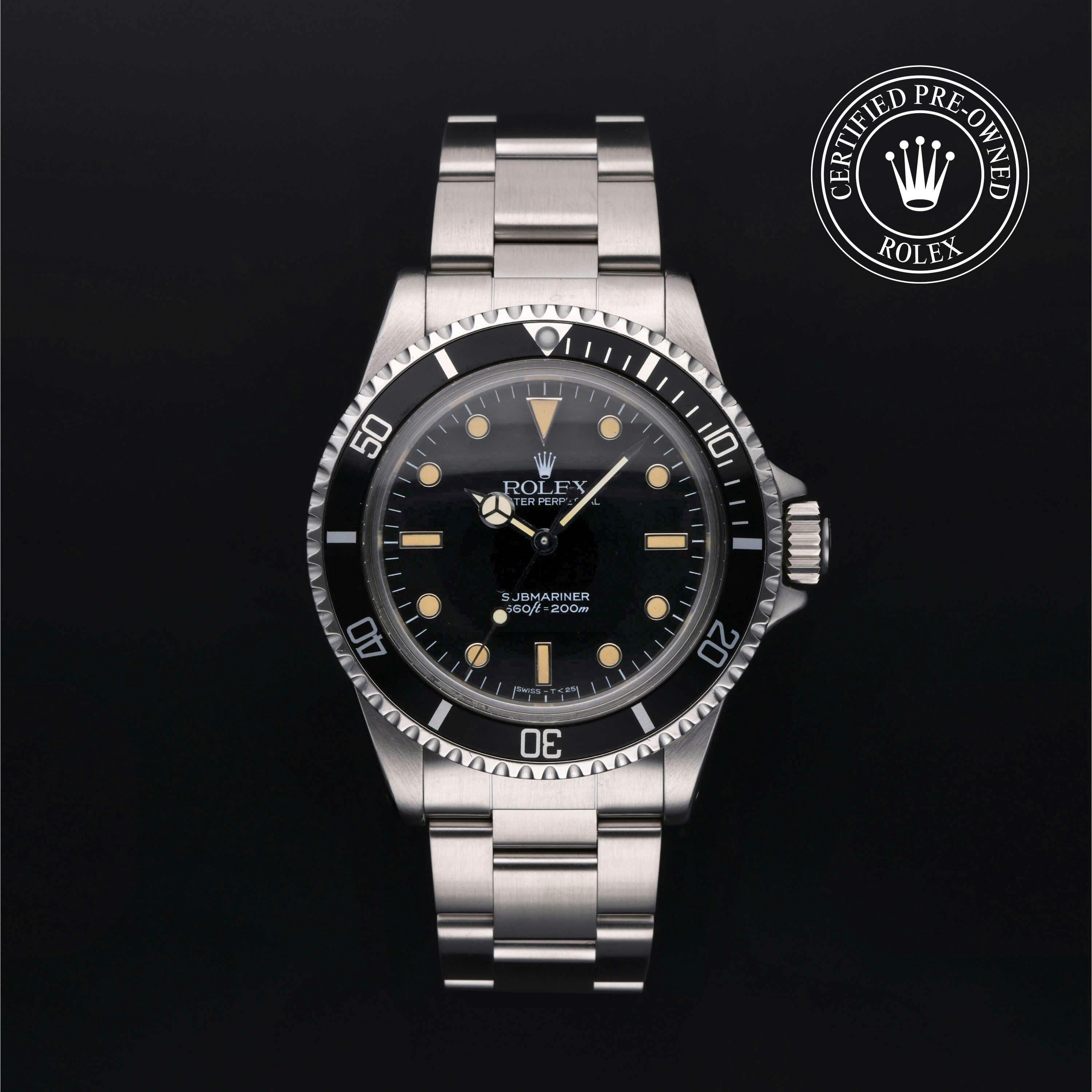 Rolex Certified Pre-Owned Vintage Submariner No Date (5513) self - winding automatic watch, features a 40mm stainless steel case with a black aluminum bezel surrounding a black dial on a stainless steel oyster bracelet. Functions include hours, minutes and seconds. This watch has received Rolex-authorized service and certification. It does not come with the original box or papers, but includes a custom Rolex Certified Pre-Owned hang tag, travel pouch and RCPO international warranty card.