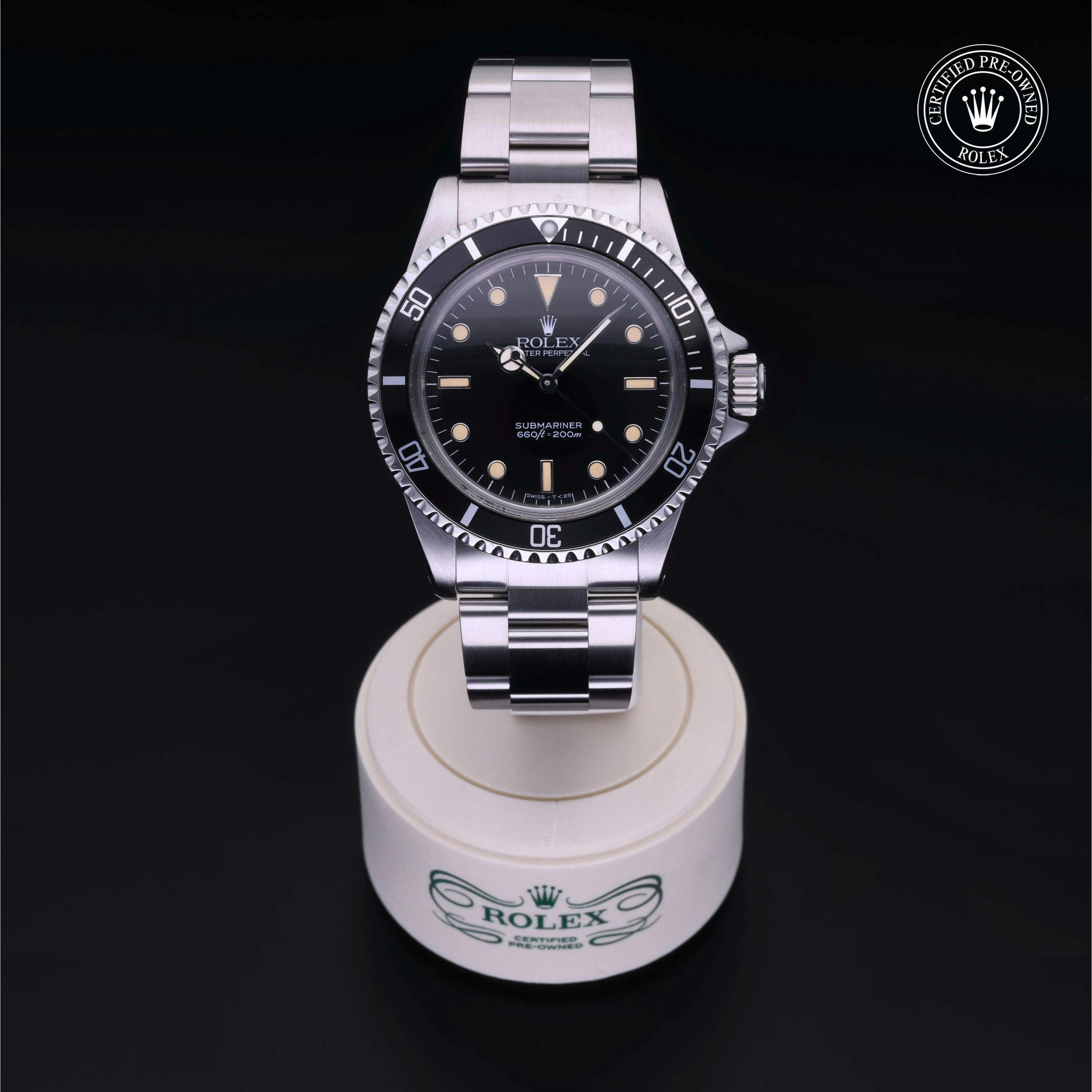 Rolex Certified Pre-Owned Vintage Submariner No Date (5513) self - winding automatic watch, features a 40mm stainless steel case with a black aluminum bezel surrounding a black dial on a stainless steel oyster bracelet. Functions include hours, minutes and seconds. This watch has received Rolex-authorized service and certification. It does not come with the original box or papers, but includes a custom Rolex Certified Pre-Owned hang tag, travel pouch and RCPO international warranty card.