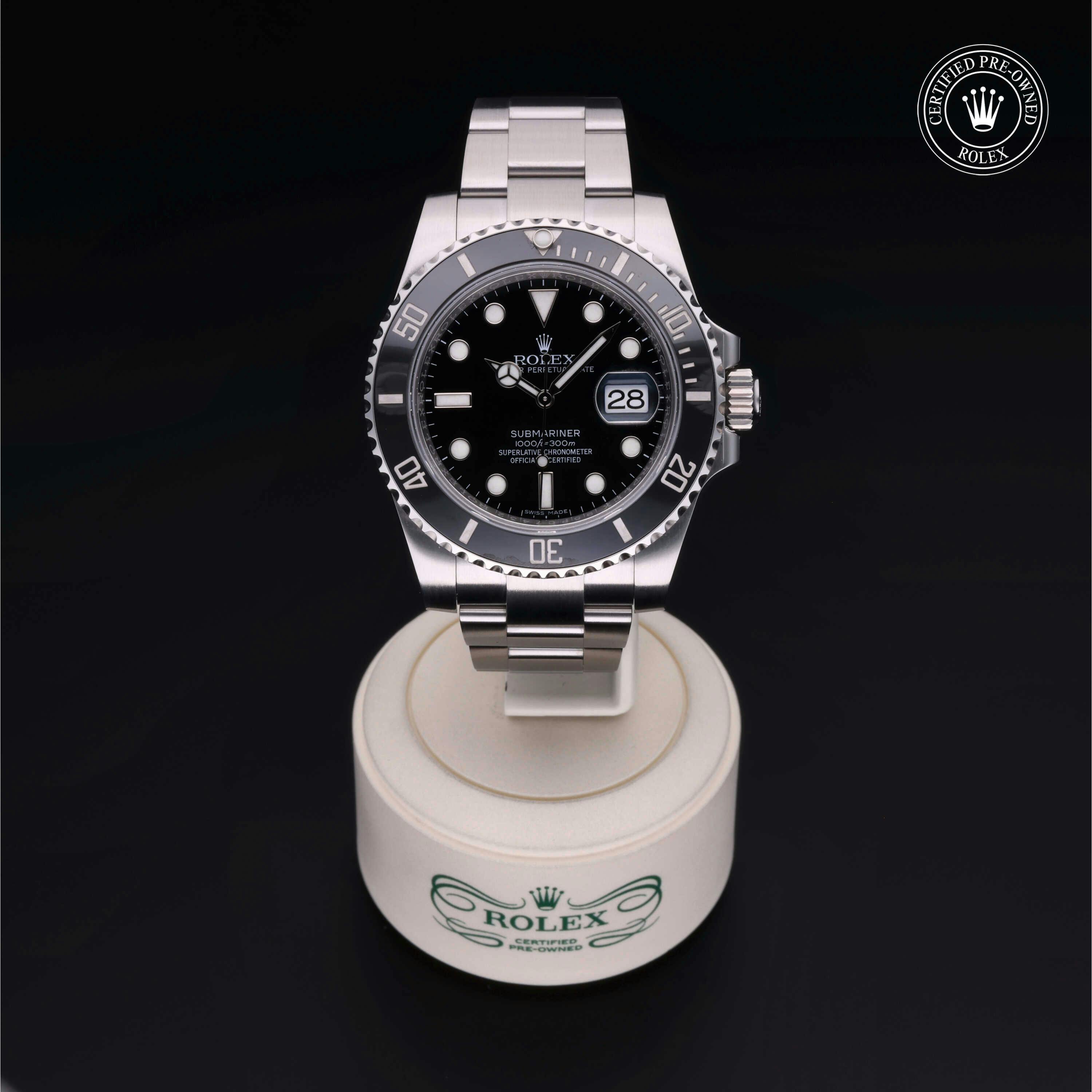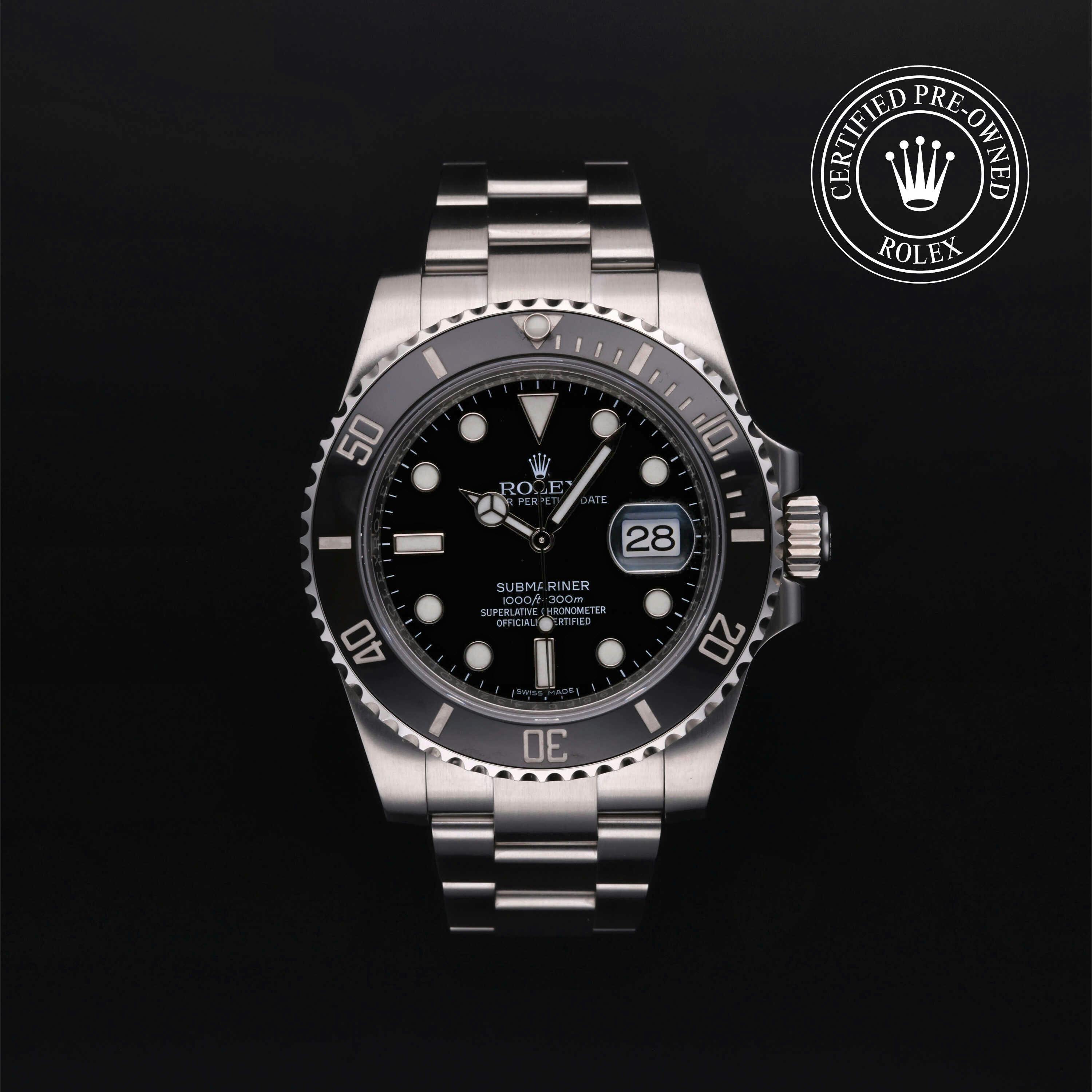 Rolex Certified Pre-Owned Submariner Date (116610LN) self - winding automatic watch, features a 40mm stainless steel case with a stainless steel and black cerachrom bezel surrounding a black dial. The watch is secured on a stainless steel Oyster bracelet complete with a folding buckle. Functions include hours, minutes, seconds and date. This watch has received Rolex-authorized service and certification. It comes with the original papers, and includes a custom Rolex Certified Pre-Owned hang tag, travel pouch and RCPO international warranty card.