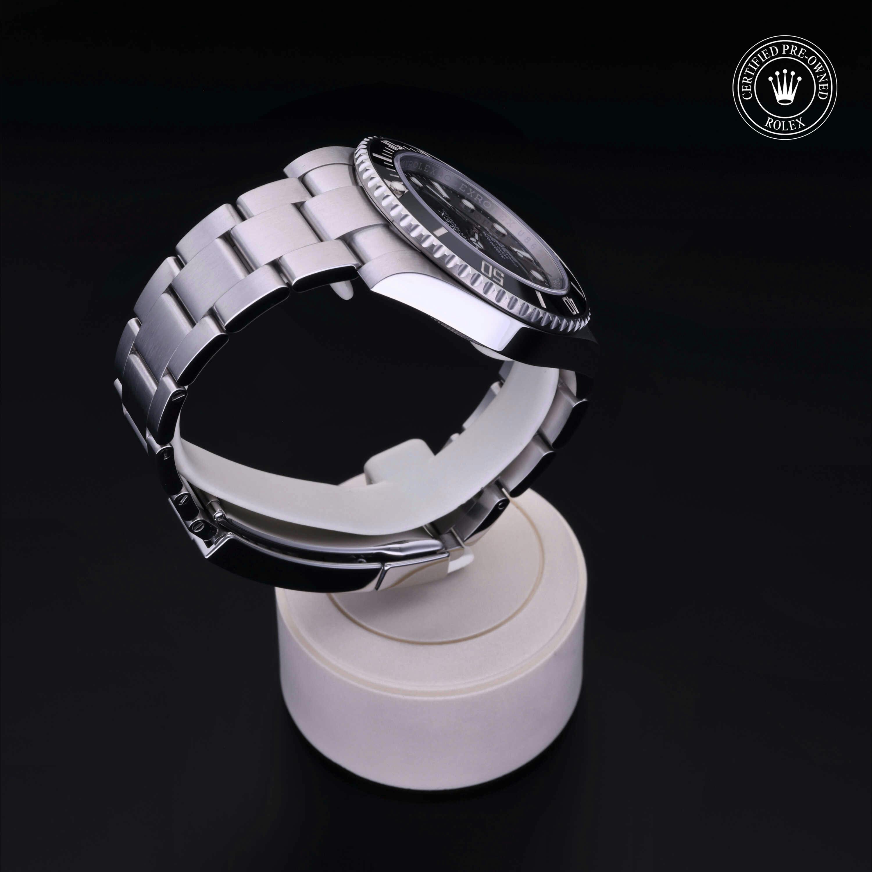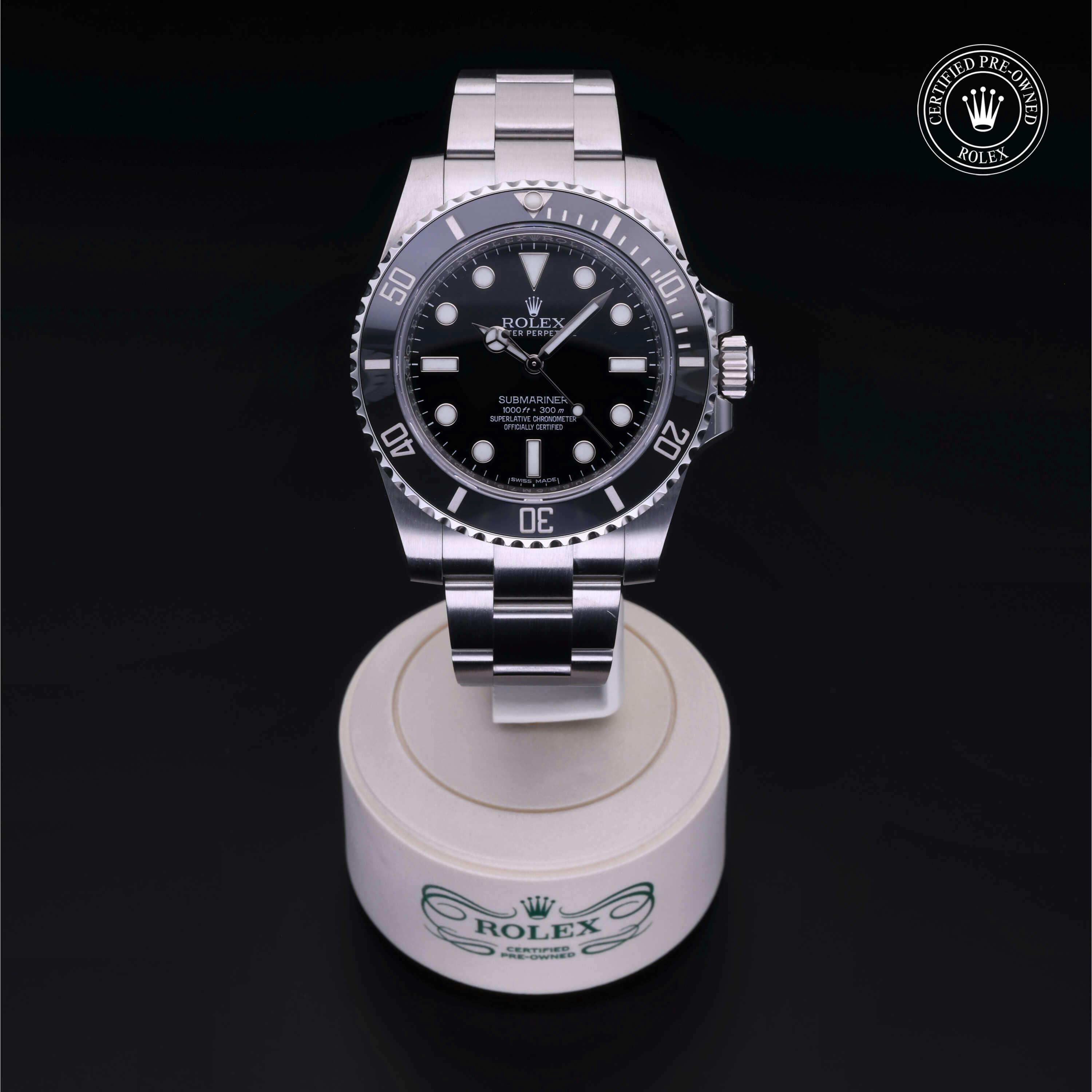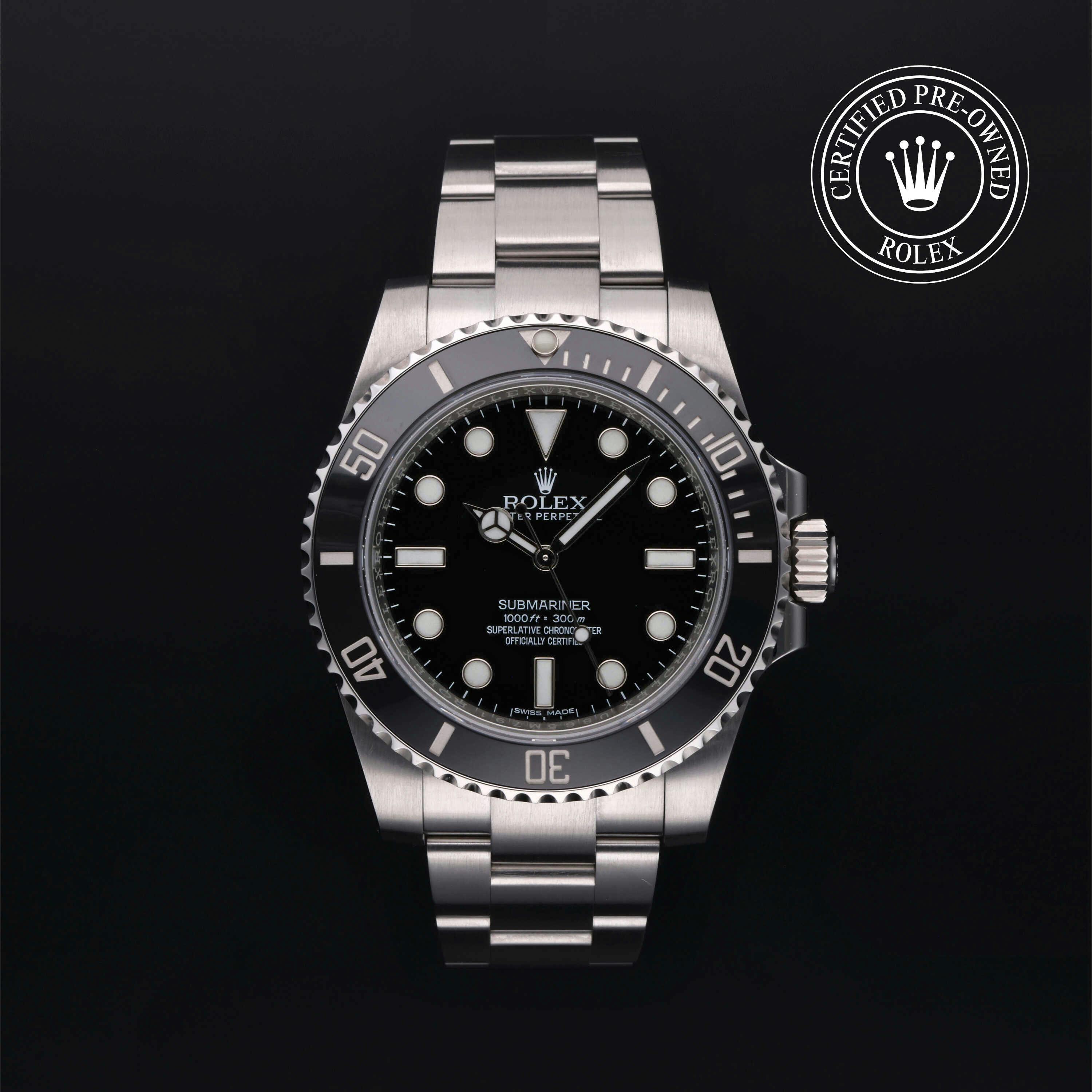 Rolex Certified Pre-Owned Submariner No Date (114060) self - winding automatic watch, features a 40mm stainless steel case with a black cerachrom bezel surrounding a black dial on a stainless steel oyster bracelet. Functions include hours, minutes and seconds. This watch has received Rolex-authorized service and certification. It comes with the original papers, and includes a custom Rolex Certified Pre-Owned hang tag, travel pouch and RCPO international warranty card.