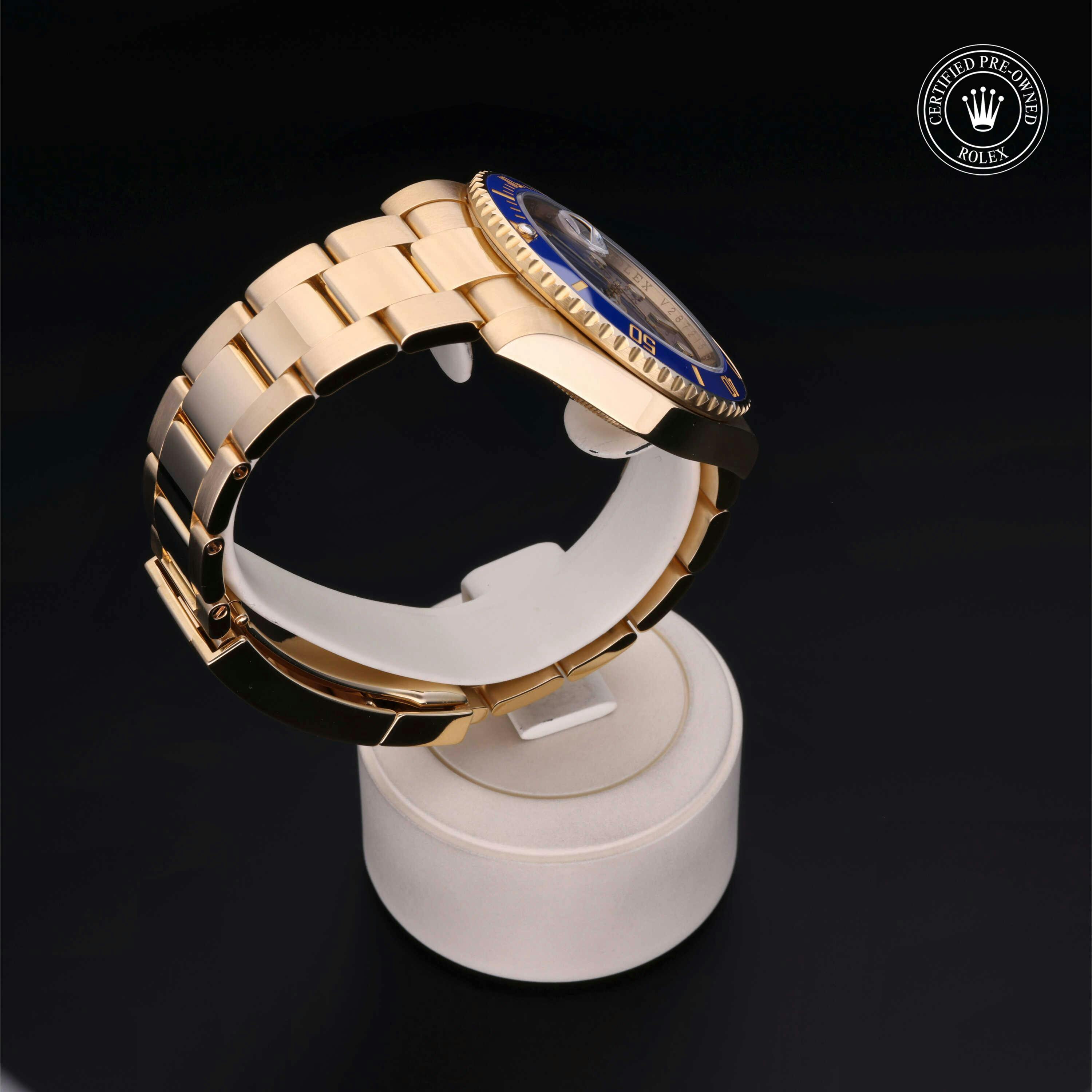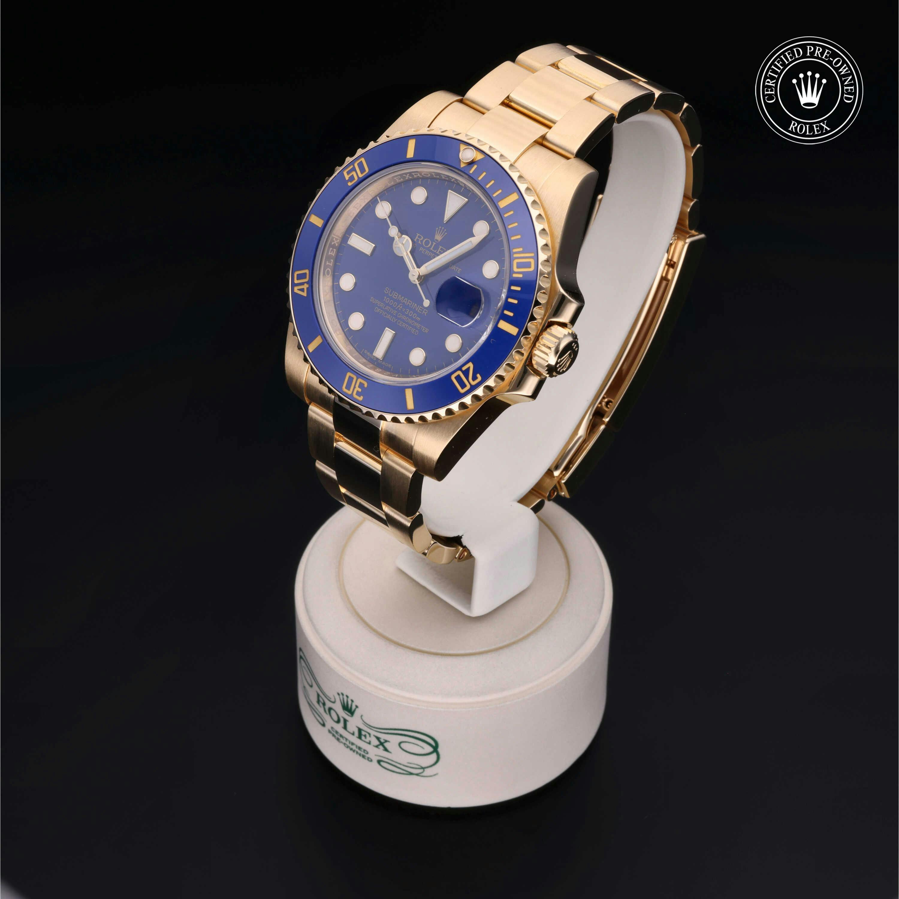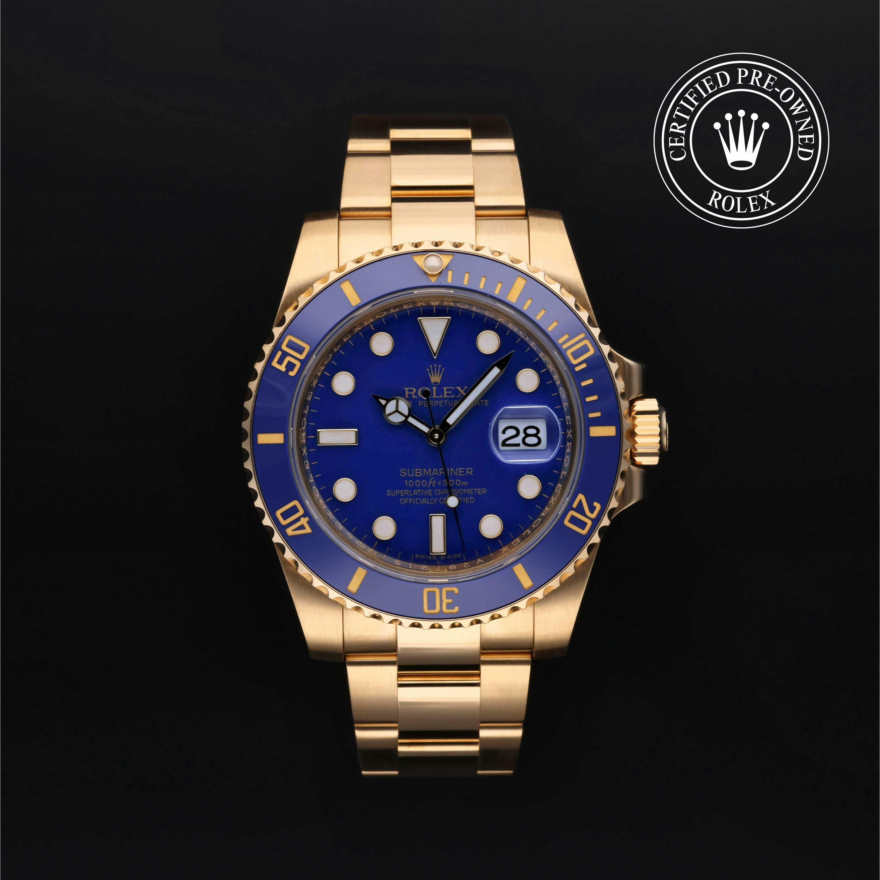 Rolex Certified Pre-Owned Submariner (116618LB) self - winding automatic watch, features a 40mm 18k yellow gold case with a blue cerachrom bezel insert surrounding a blue dial on an 18k yellow gold oyster bracelet. Functions include hours, minutes, seconds and date. This watch has received Rolex-authorized service and certification. It comes with the original box and papers, and includes a custom Rolex Certified Pre-Owned hang tag, travel pouch and RCPO international warranty card.