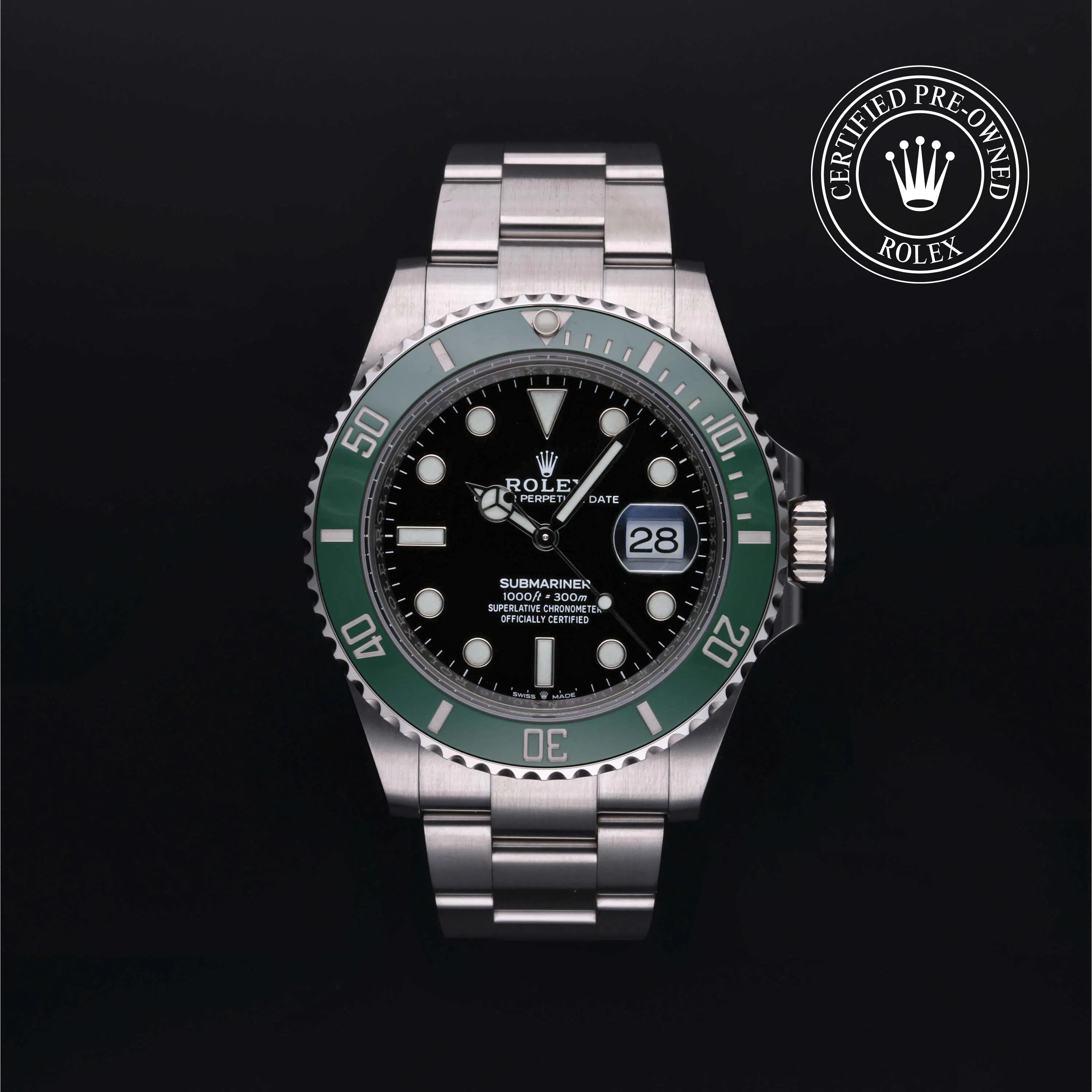 Rolex Certified Pre-Owned Submariner (126610LV) self - winding automatic watch, features a 41mm stainless steel case and rotating bezel with a green cerachrom insert surrounding a black dial. The watch is secured on a stainless steel Oyster bracelet complete with a folding buckle. Functions include hours, minutes, seconds and date. This watch has received Rolex-authorized service and certification. It comes with the original box and papers, and includes a custom Rolex Certified Pre-Owned hang tag, travel pouch and RCPO international warranty card.