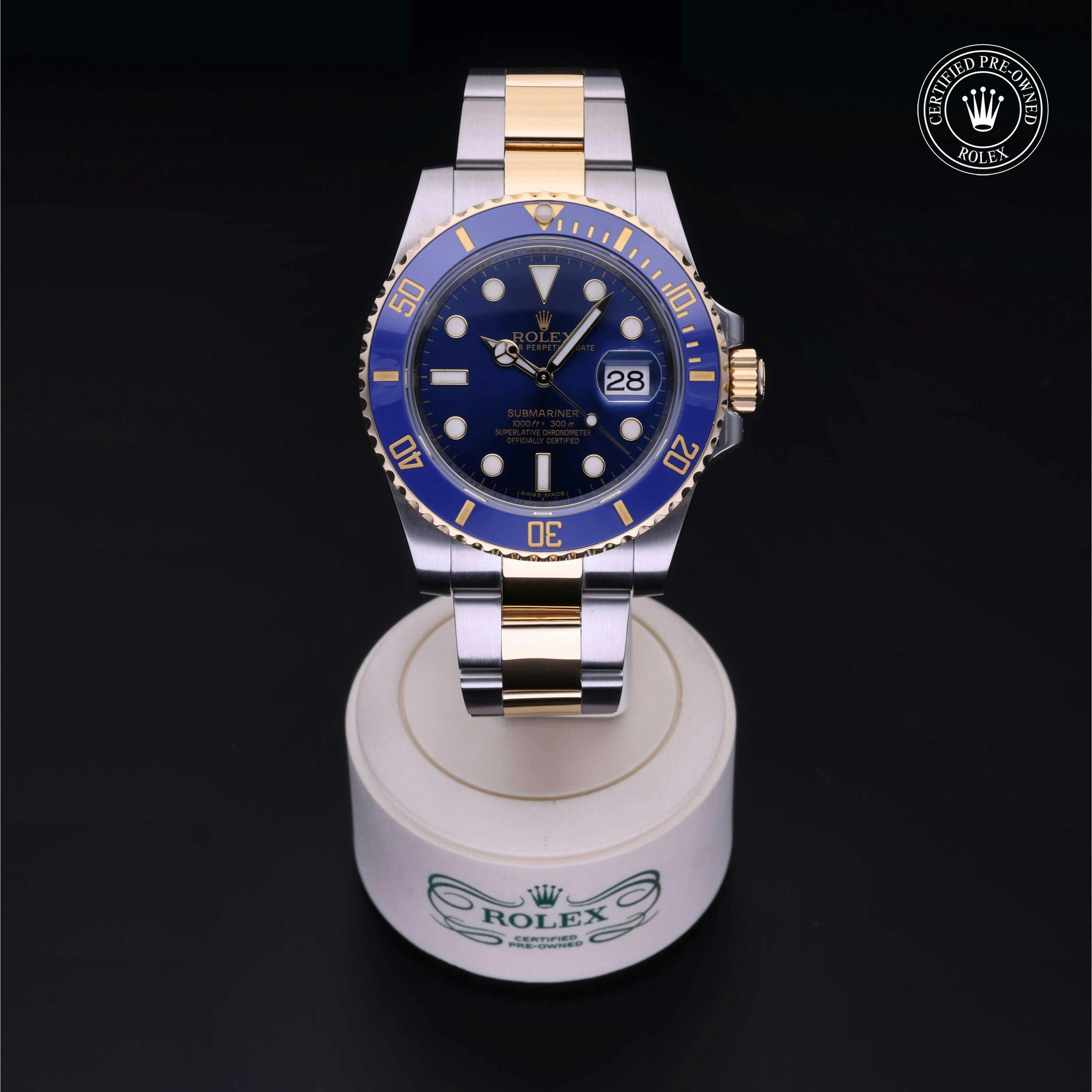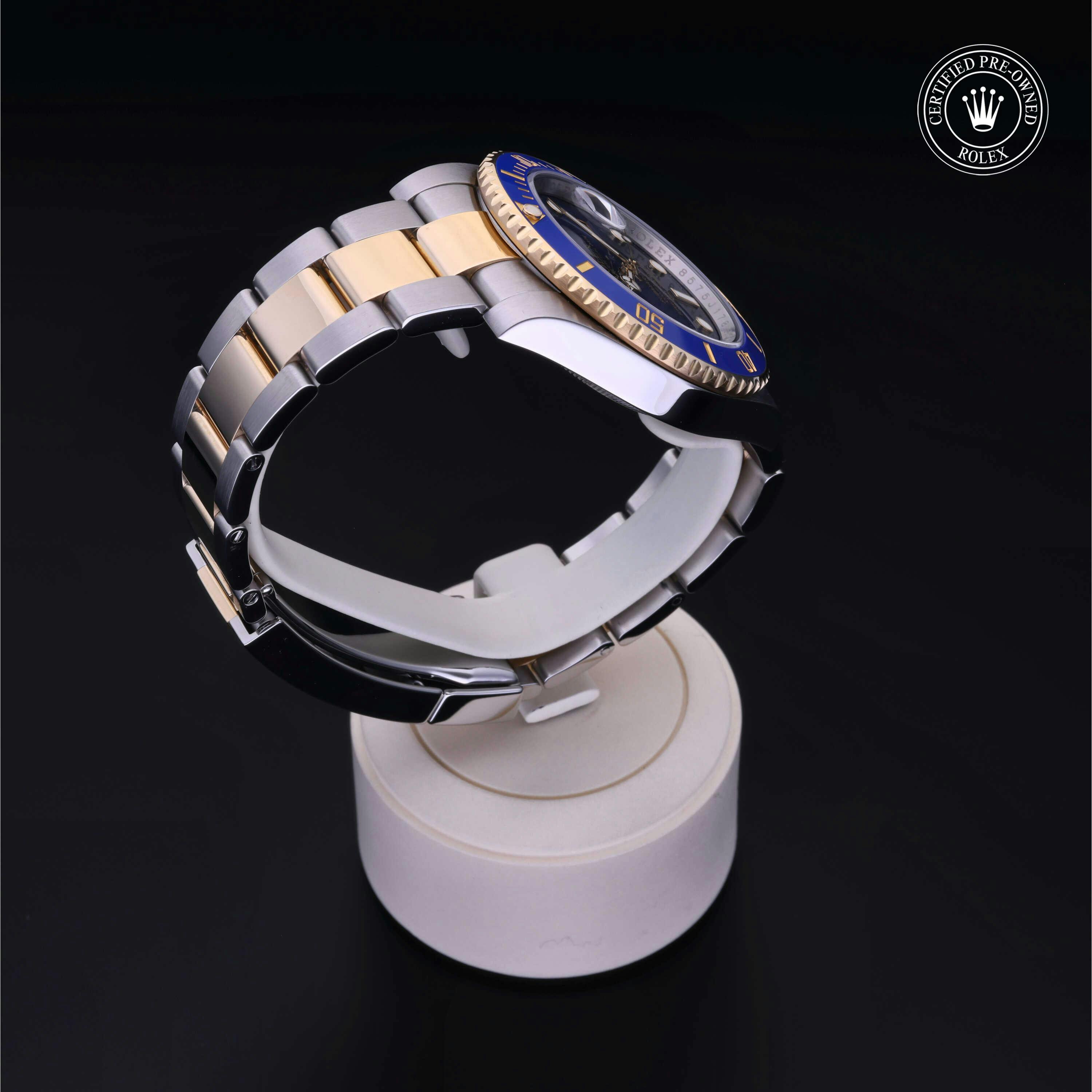Rolex Certified Pre-Owned Submariner Date (116613LB) self - winding automatic watch, features a 40mm stainless steel case with an 18k yellow gold rotating bezel with a blue cerachrom insert surrounding a blue dial on a stainless steel and 18k yellow gold oyster bracelet. Functions include hours, minutes, seconds and date. This watch has received Rolex-authorized service and certification. It does not come with the original box or papers, but includes a custom Rolex Certified Pre-Owned hang tag, travel pouch and RCPO international warranty card.