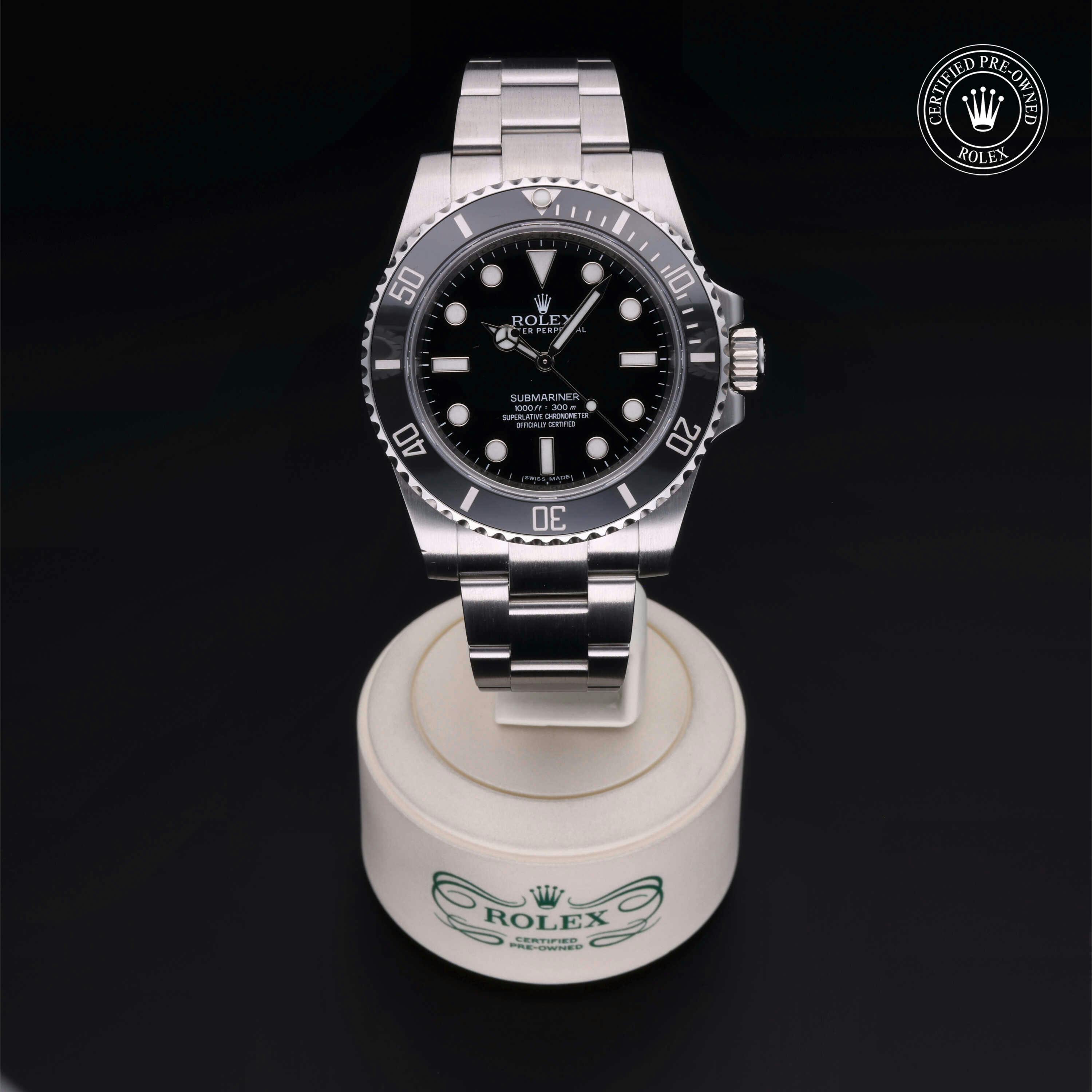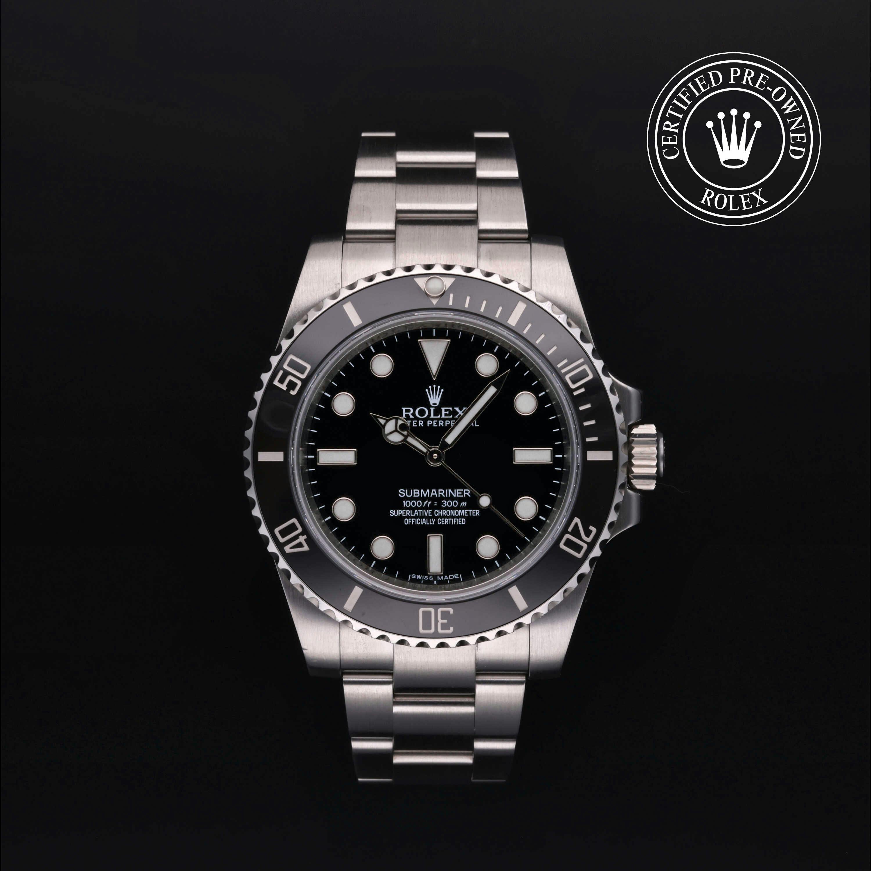 Rolex Certified Pre-Owned Submariner (114060) self - winding automatic watch, features a 40mm stainless steel case with a stainless steel and black cerachrom bezel insert surrounding a black dial. The watch is secured on a stainless steel Oyster bracelet complete with a folding clasp. Functions include hours, minutes and seconds. This watch has received Rolex-authorized service and certification. It does not come with the original box or papers, but includes a custom Rolex Certified Pre-Owned hang tag, travel pouch and RCPO international warranty card.