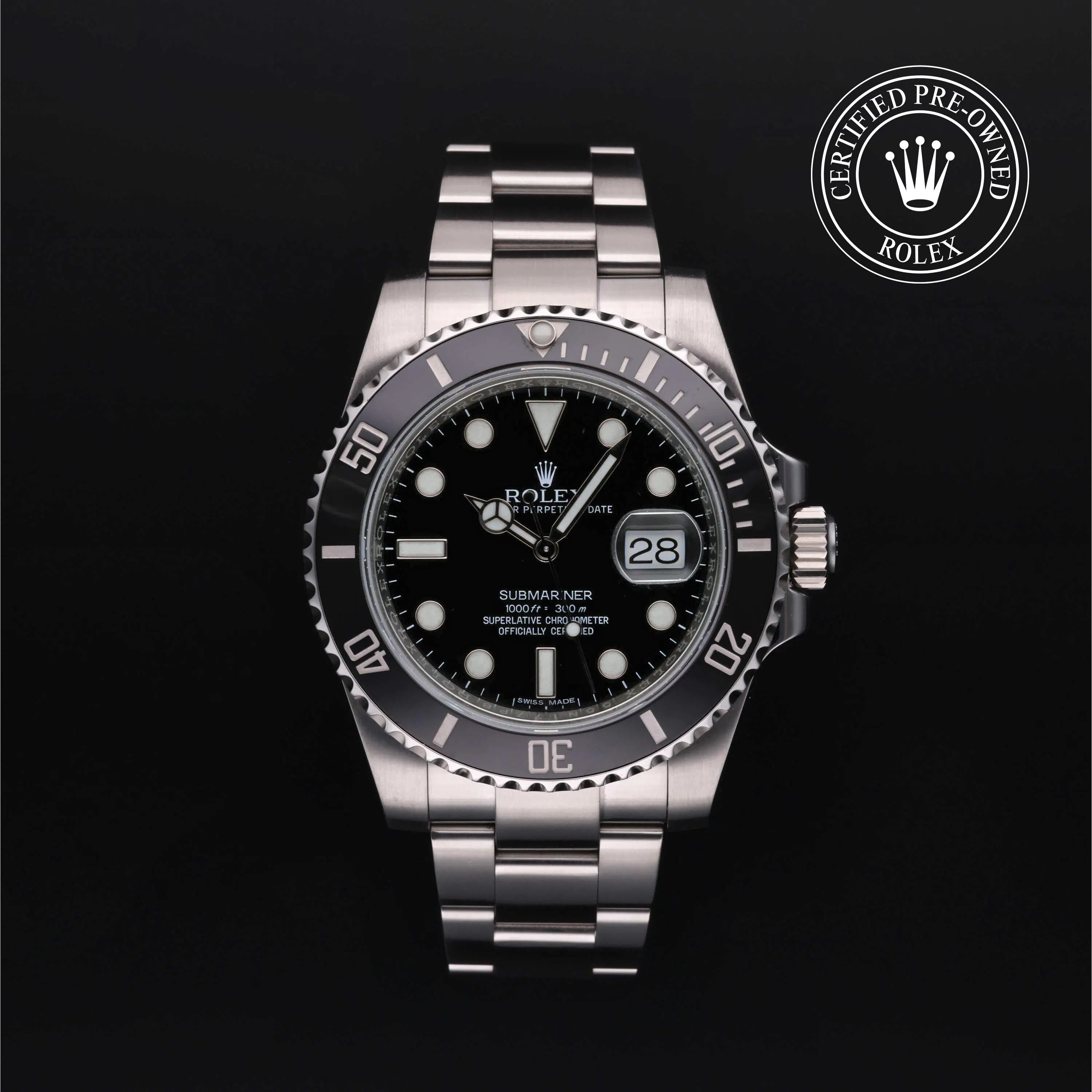 Rolex Certified Pre-Owned Submariner Date (116610LN) self - winding automatic watch, features a 40mm stainless steel case and rotating bezel with a black cerachrom insert surrounding a black dial on a stainless steel Oyster bracelet. Functions include hours, minutes, seconds and date. This watch has received Rolex-authorized service and certification. It does not come with the original box or papers, but includes a custom Rolex Certified Pre-Owned hang tag, travel pouch and RCPO international warranty card.