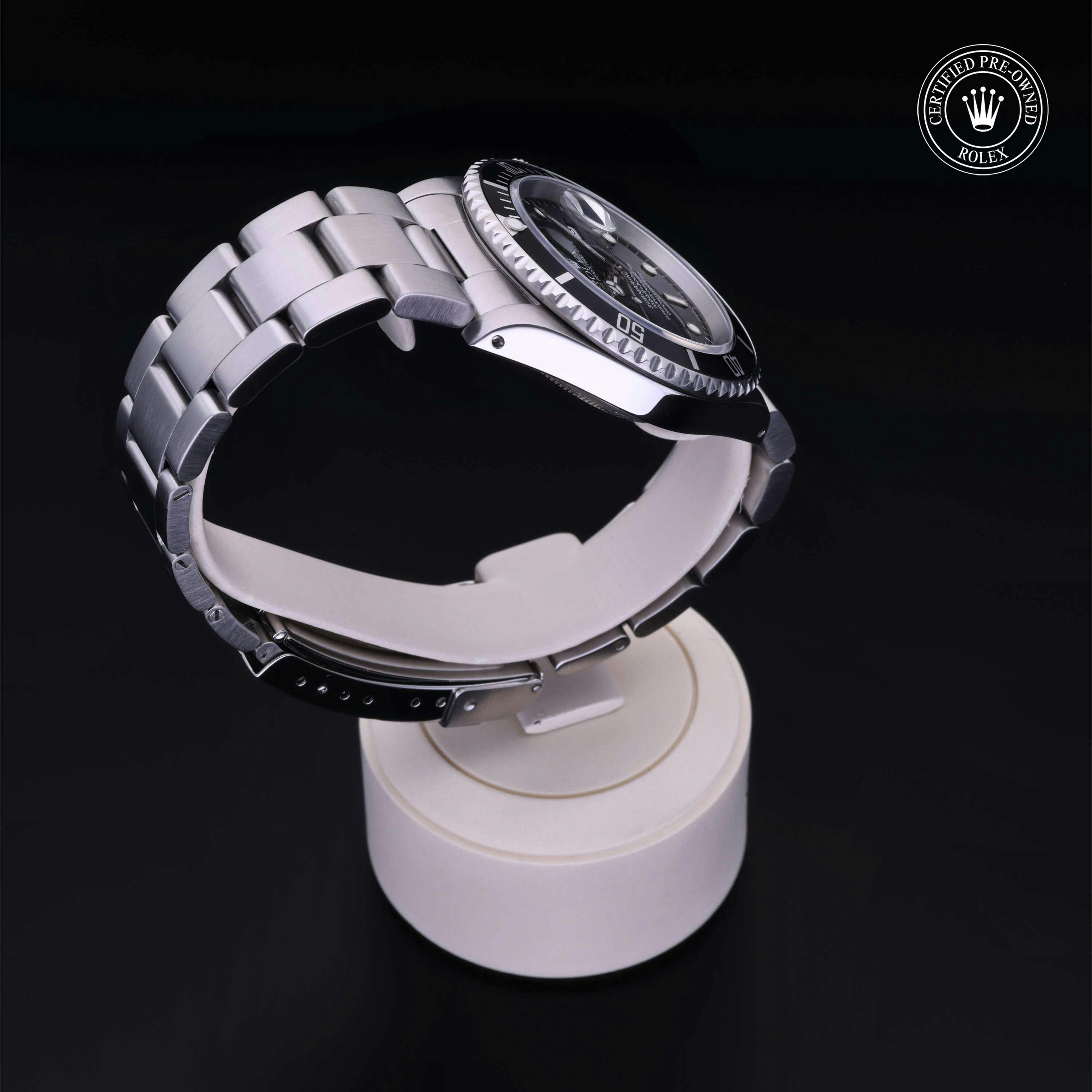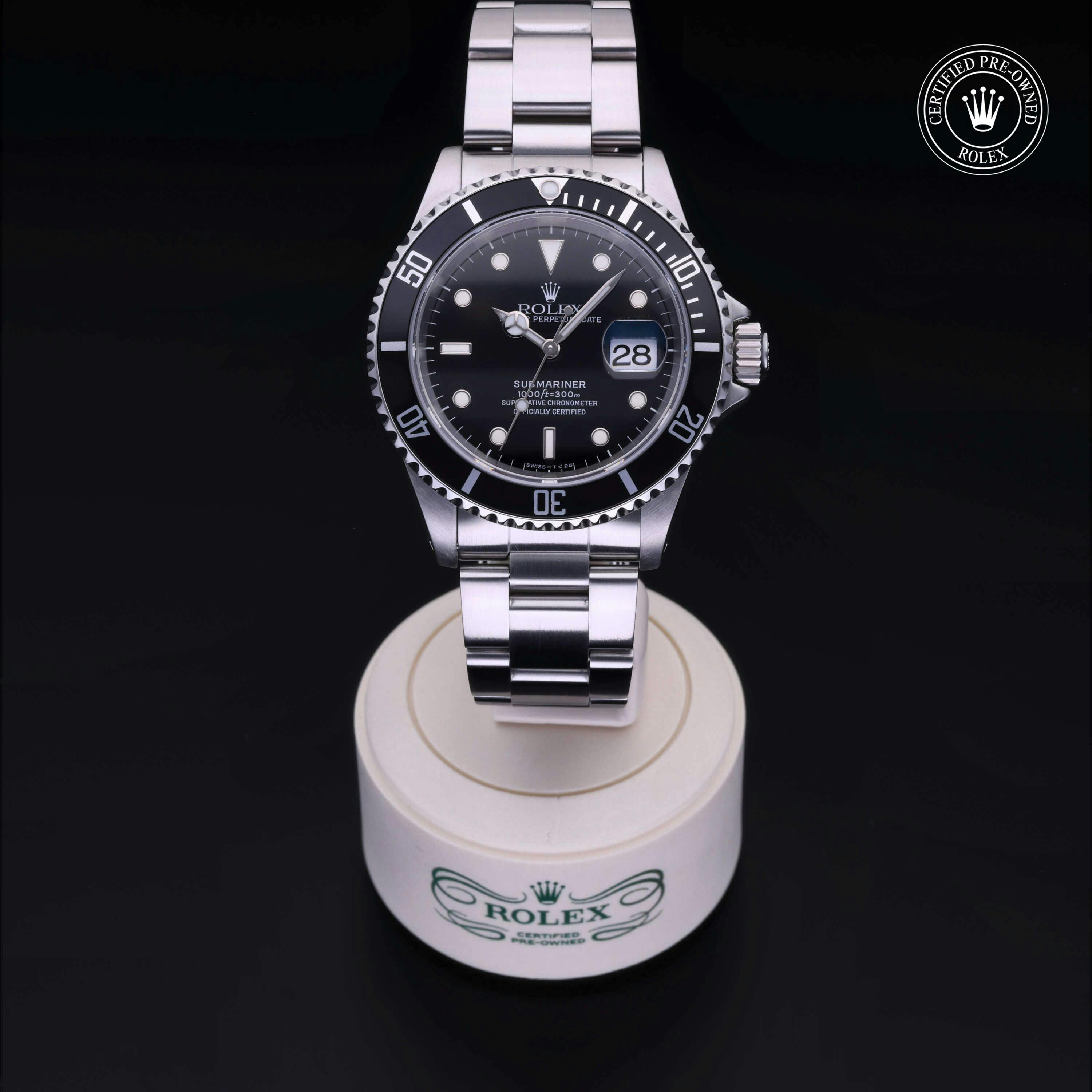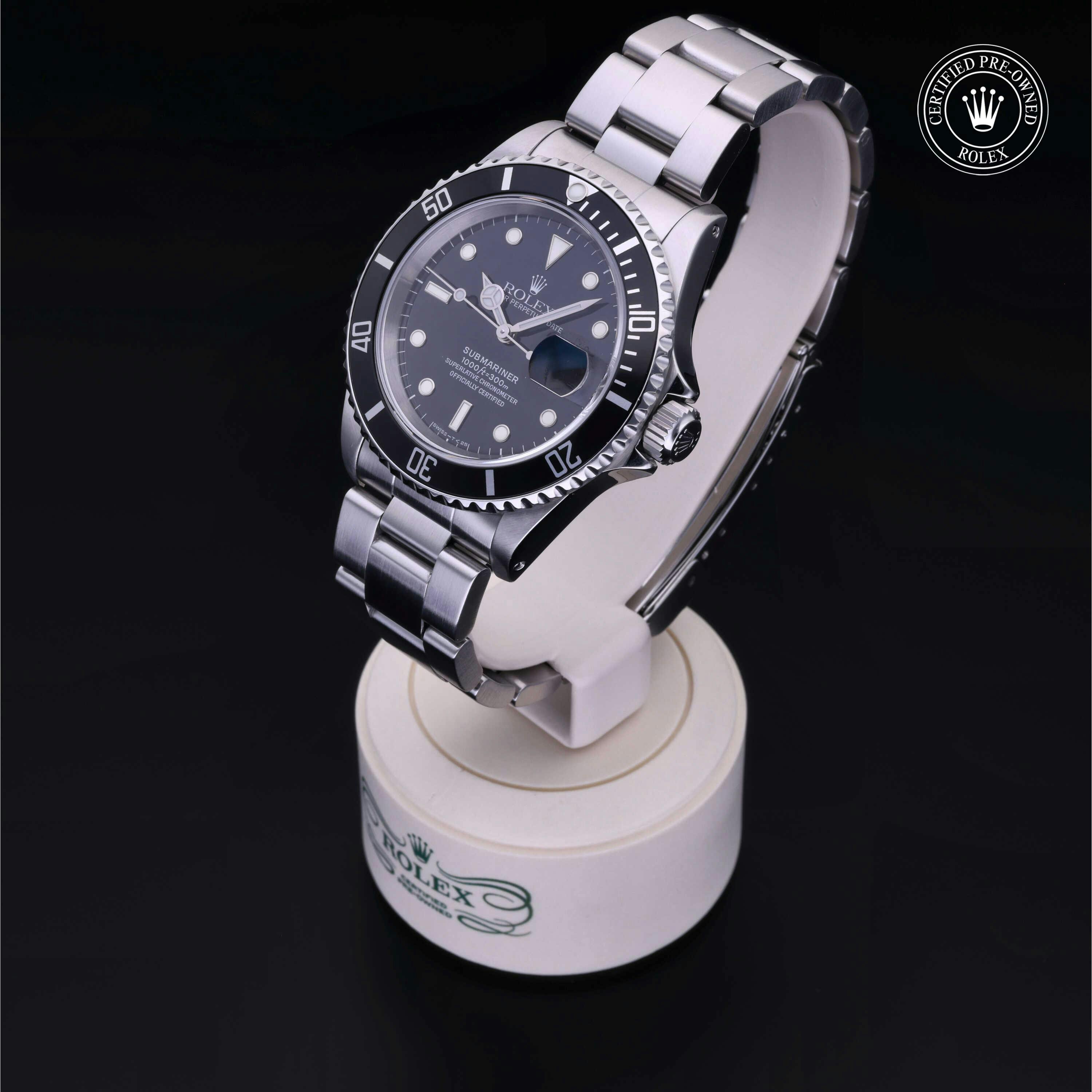 Rolex Certified Pre-Owned Submariner Date (16610) self - winding automatic watch, features a 40mm stainless steel case with a black aluminum bezel insert surrounding a black dial on a stainless steel oyster bracelet. Functions include hours, minutes, seconds and date. This watch has received Rolex-authorized service and certification. It does not come with the original box or papers, but includes a custom Rolex Certified Pre-Owned hang tag, travel pouch and RCPO international warranty card.