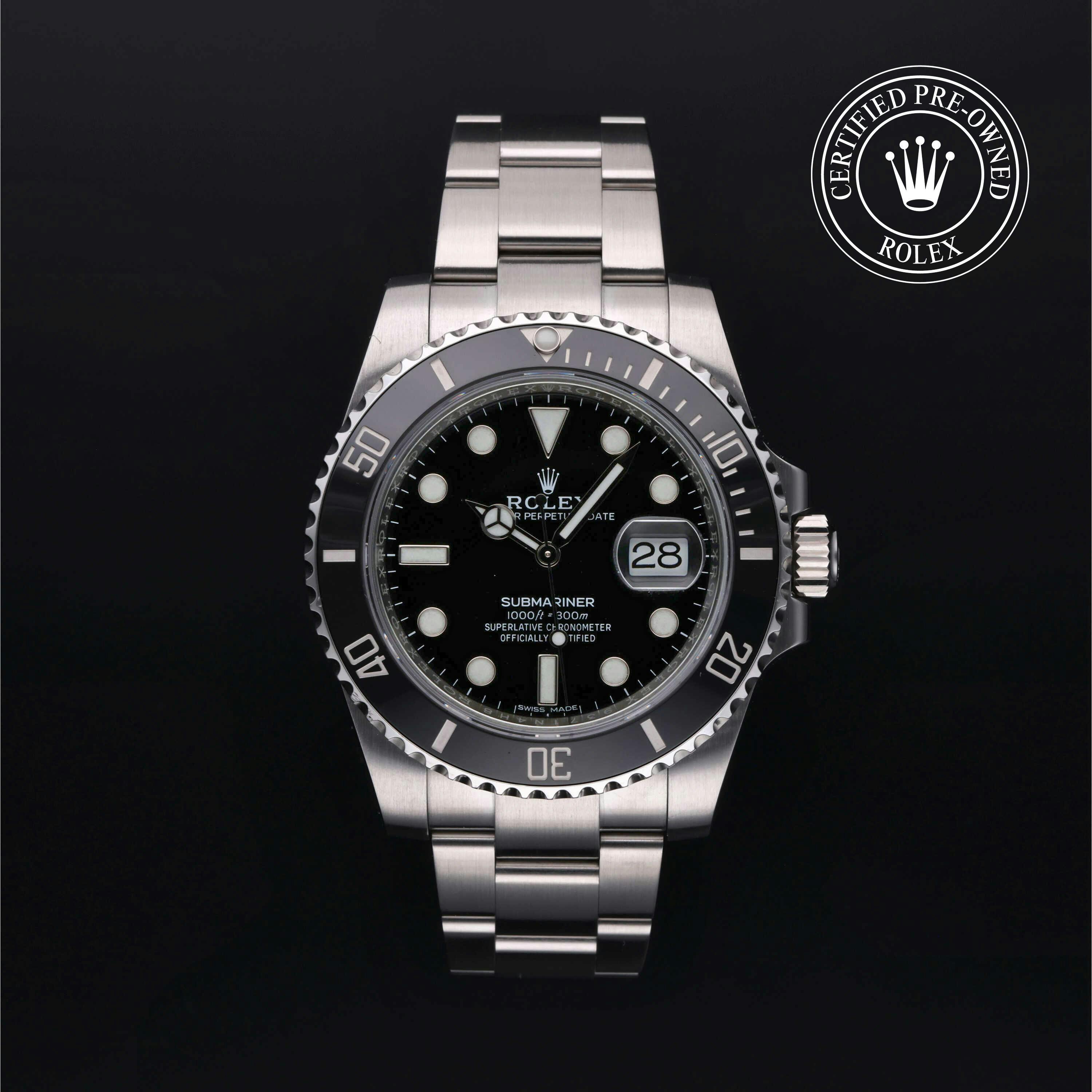 Rolex Certified Pre-Owned Submariner Date (116610LN) self - winding automatic watch, features a 40mm stainless steel case with a black cerachrom bezel insert surrounding a black dial on a stainless steel oyster bracelet. Functions include hours, minutes, seconds and date. This watch has received Rolex-authorized service and certification. It comes with the original papers, and includes a custom Rolex Certified Pre-Owned hang tag, travel pouch and RCPO international warranty card.