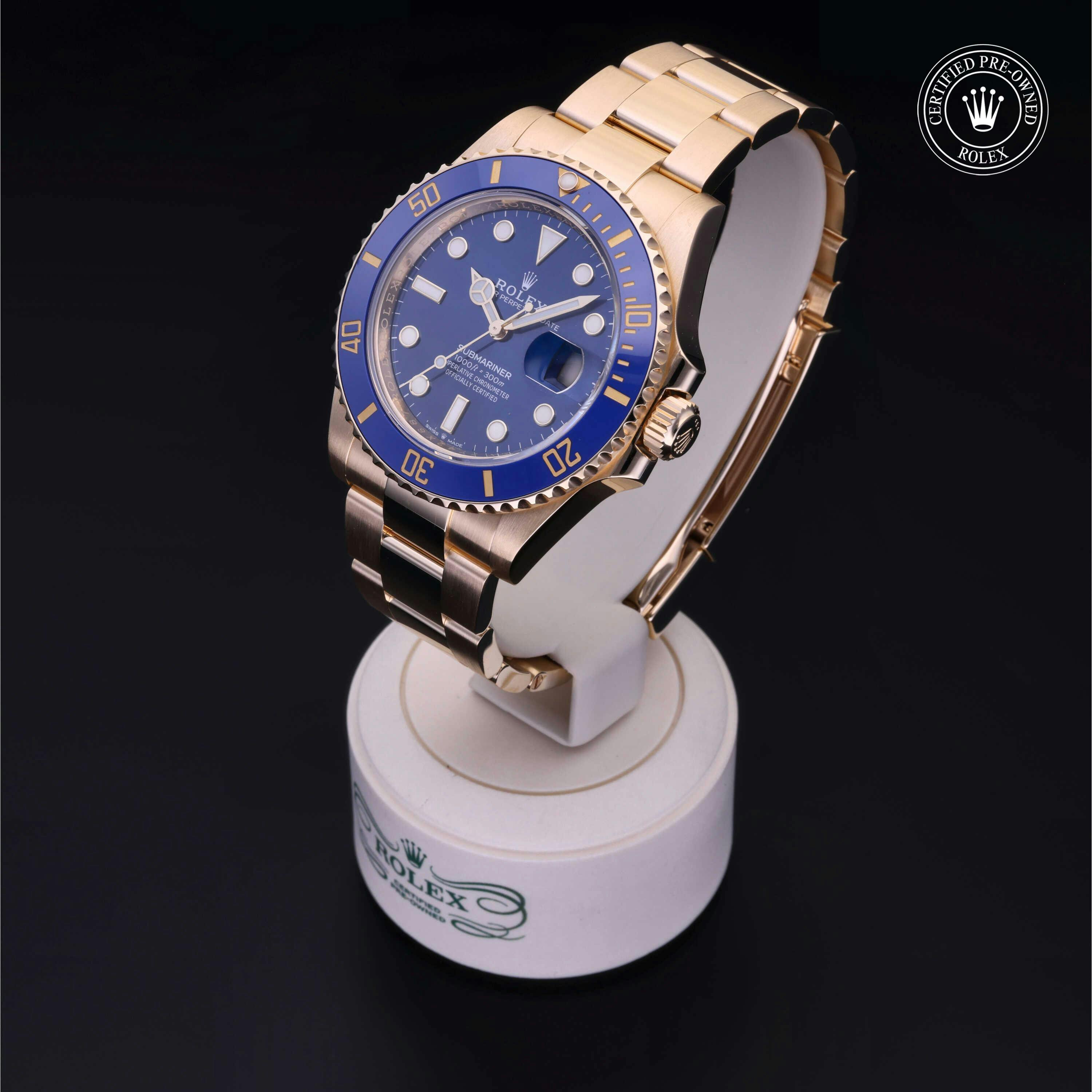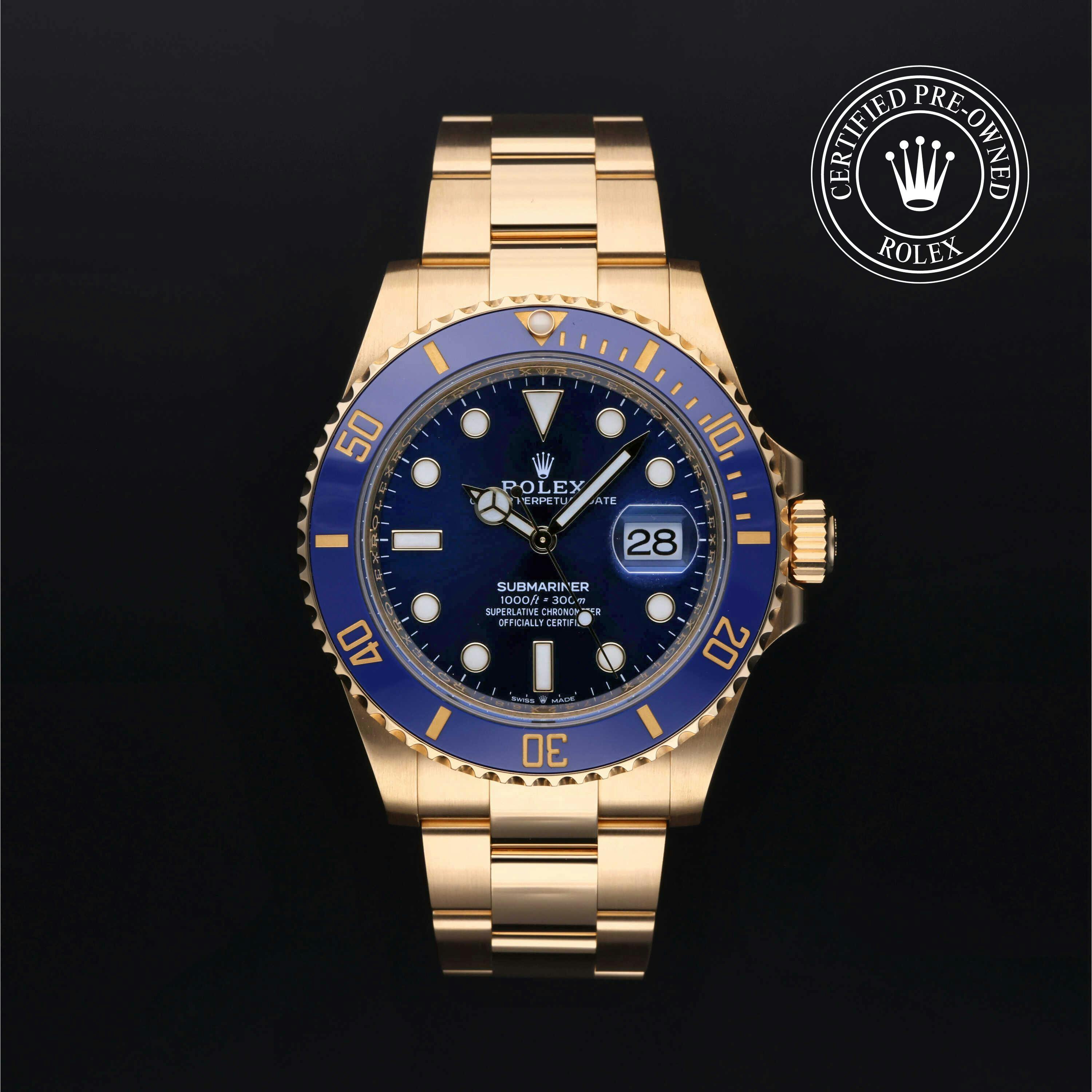 Rolex Certified Pre-Owned Submariner (126618LB) self - winding automatic watch, features a 41mm 18k yellow gold case and rotating bezel with a blue cerachrom insert surrounding a blue dial on an 18k yellow gold oyster bracelet. Functions include hours, minutes, seconds and date. This watch has received Rolex-authorized service and certification. It does not come with the original box or papers, but includes a custom Rolex Certified Pre-Owned hang tag, travel pouch and RCPO international warranty card.
