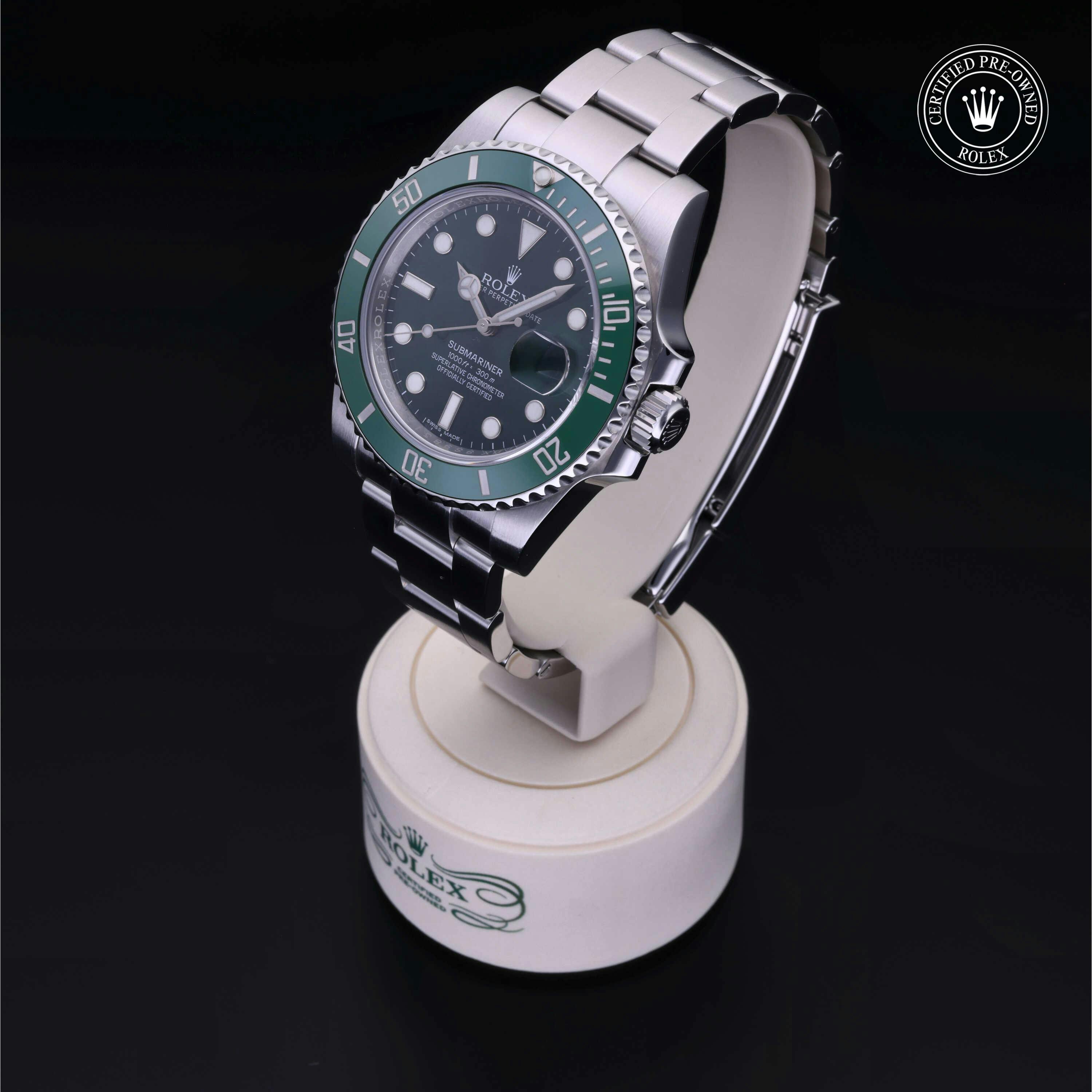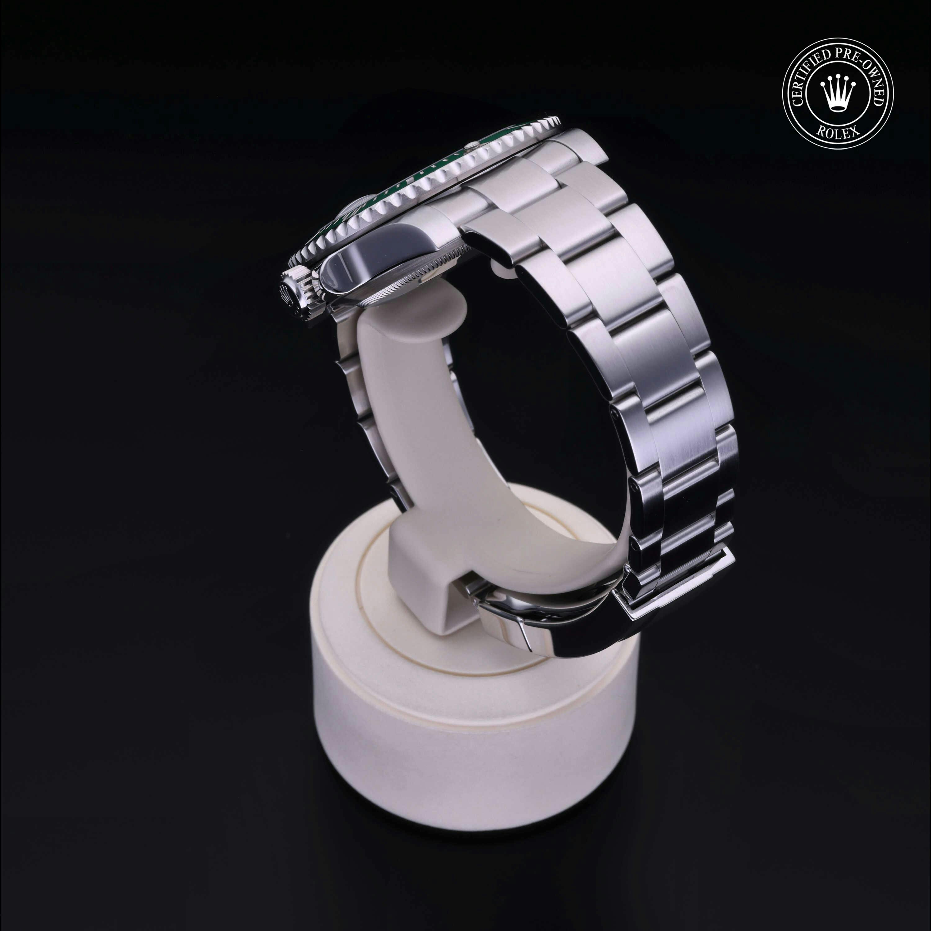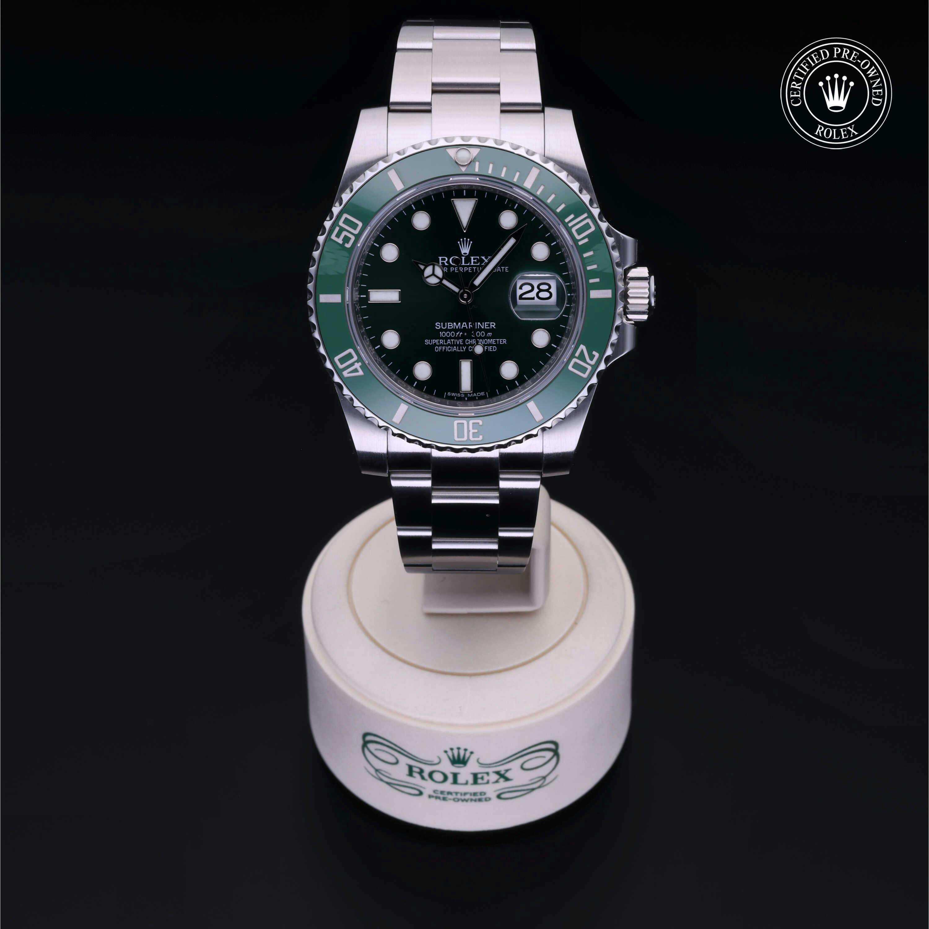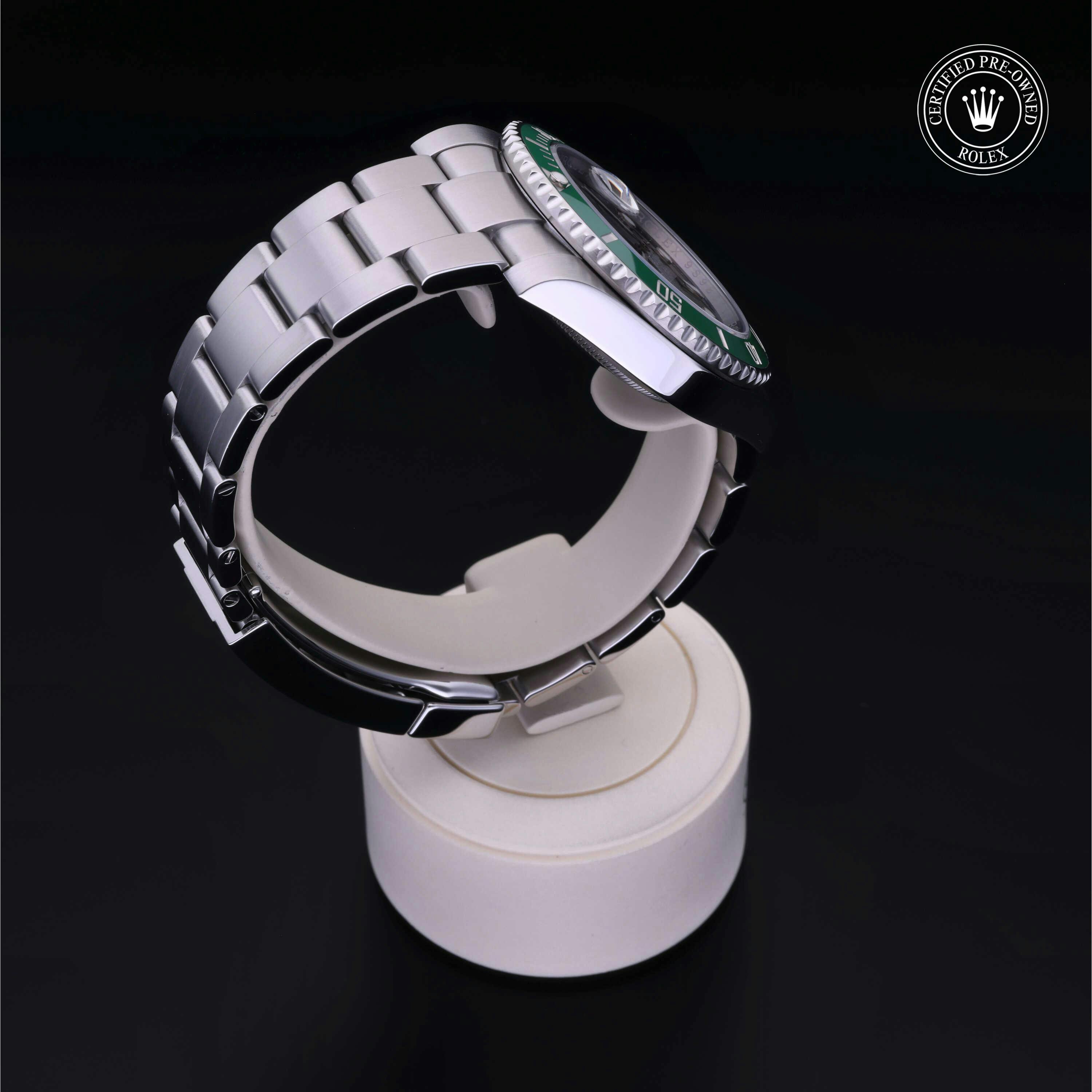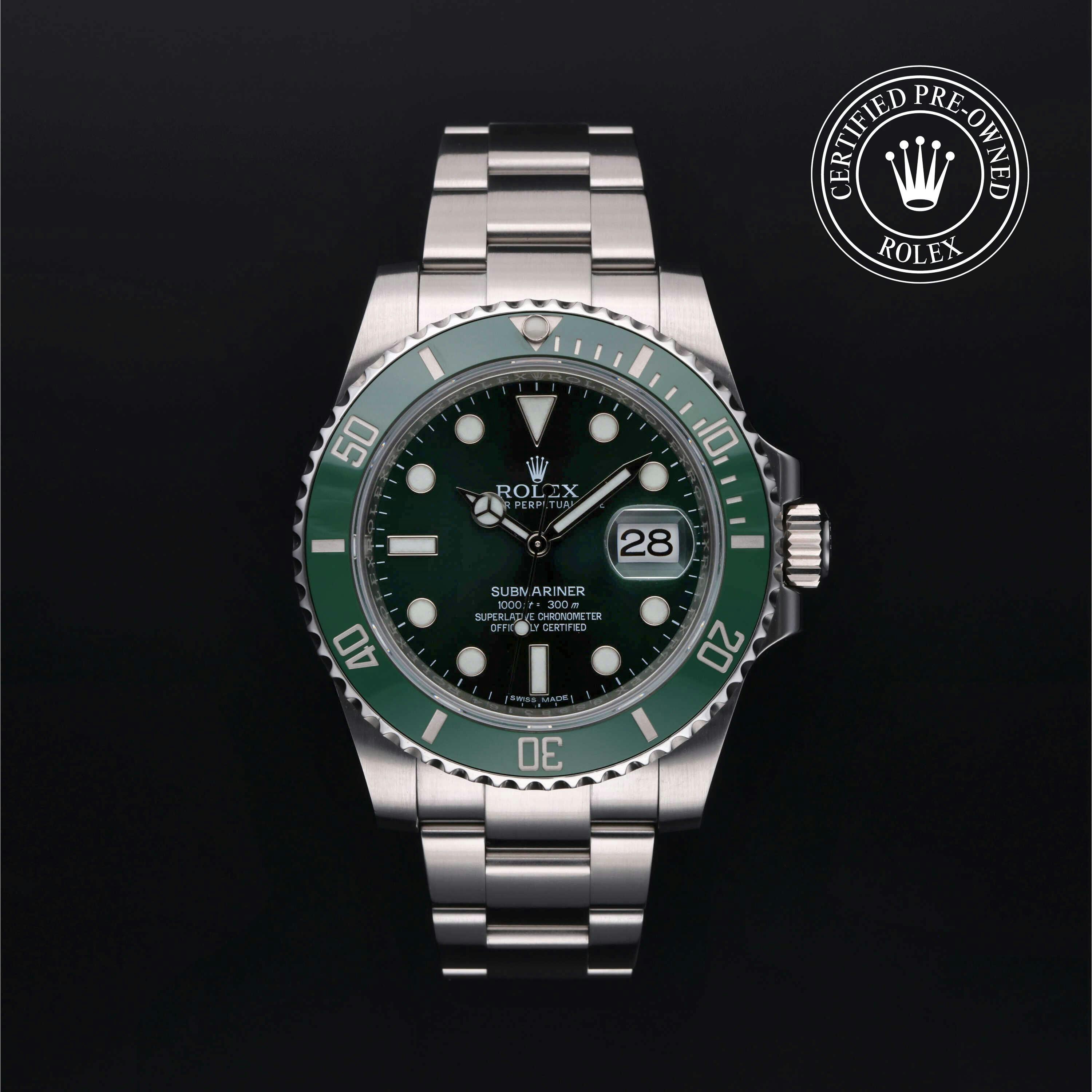 Rolex Certified Pre-Owned Submariner Date (116610LV) self - winding automatic watch, features a 40mm stainless steel case with a green cerachrom bezel insert surrounding a green dial on a stainless steel oyster bracelet. Functions include hours, minutes, seconds and date. This watch has received Rolex-authorized service and certification. It comes with the original papers, and includes a custom Rolex Certified Pre-Owned hang tag, travel pouch and RCPO international warranty card.