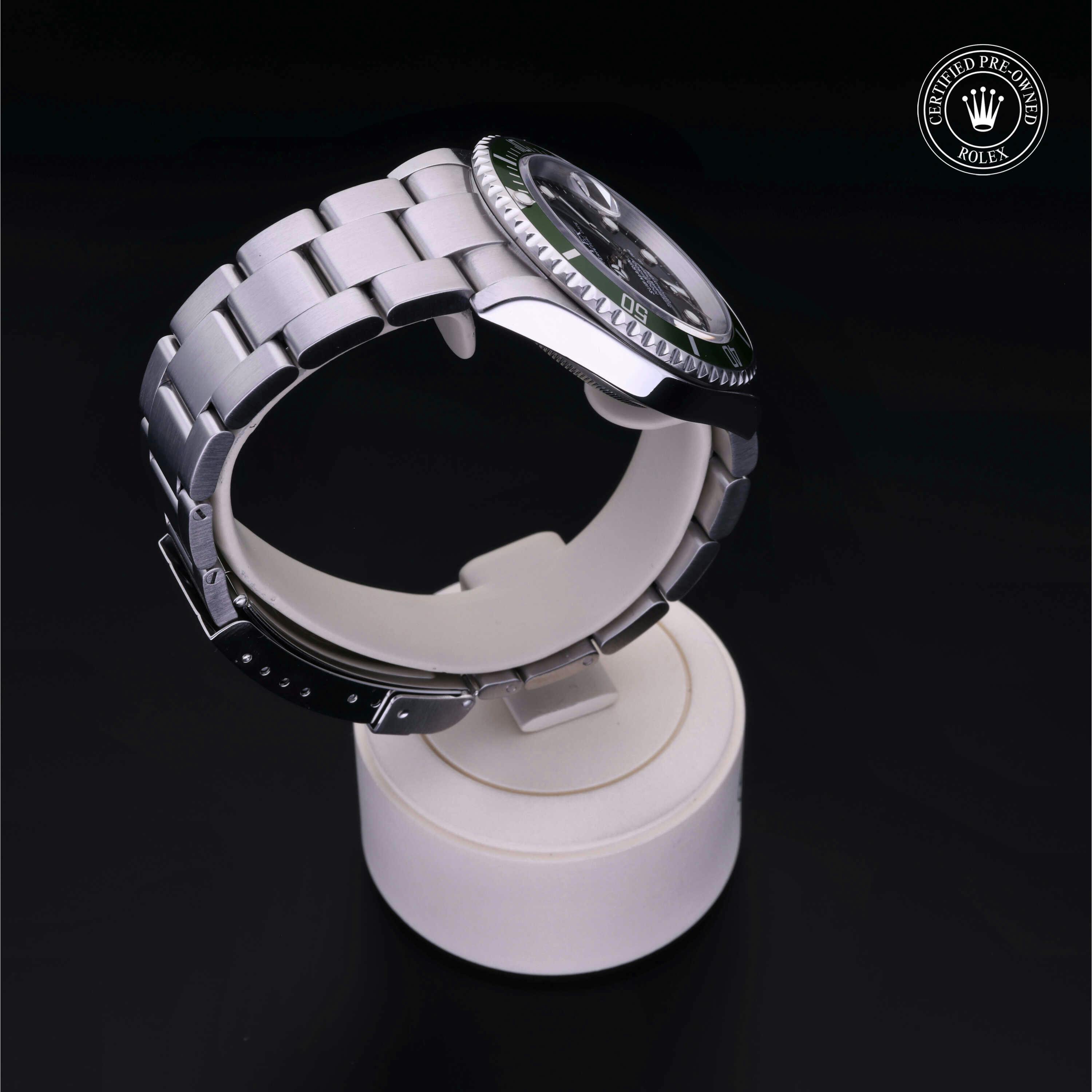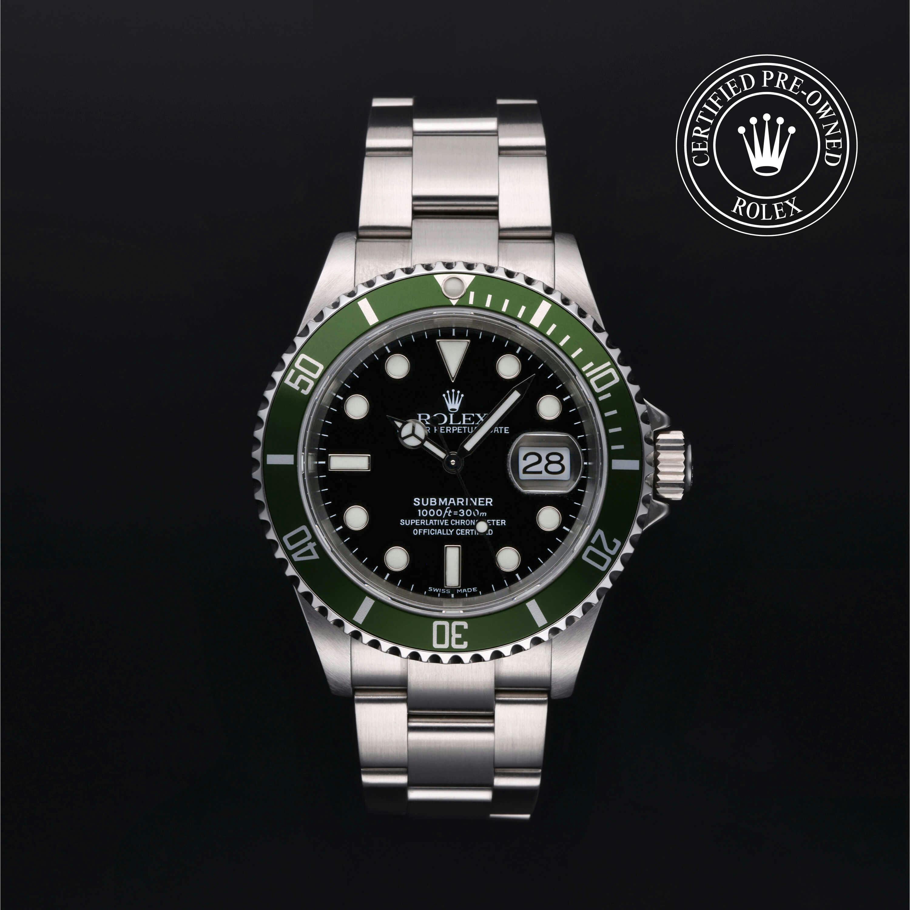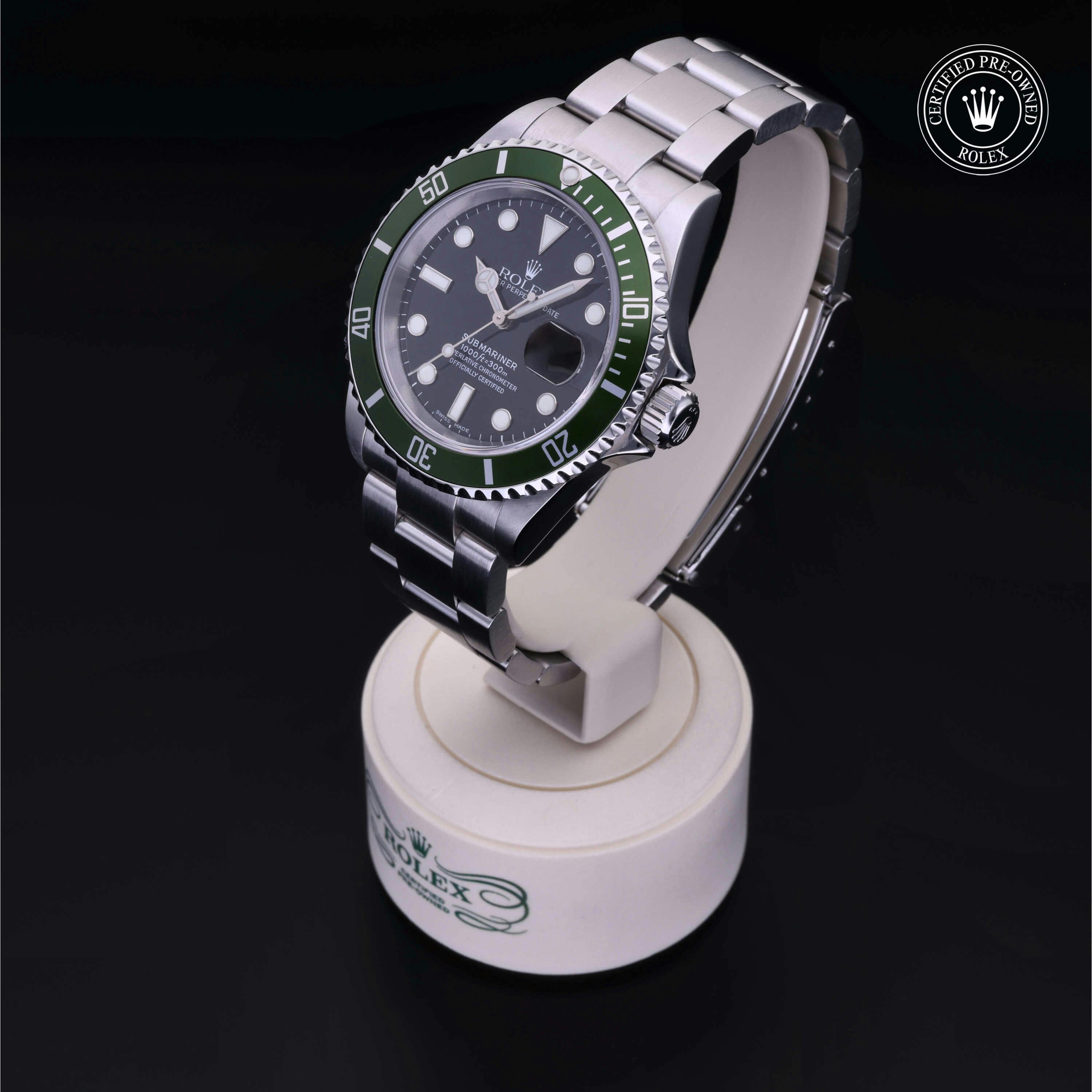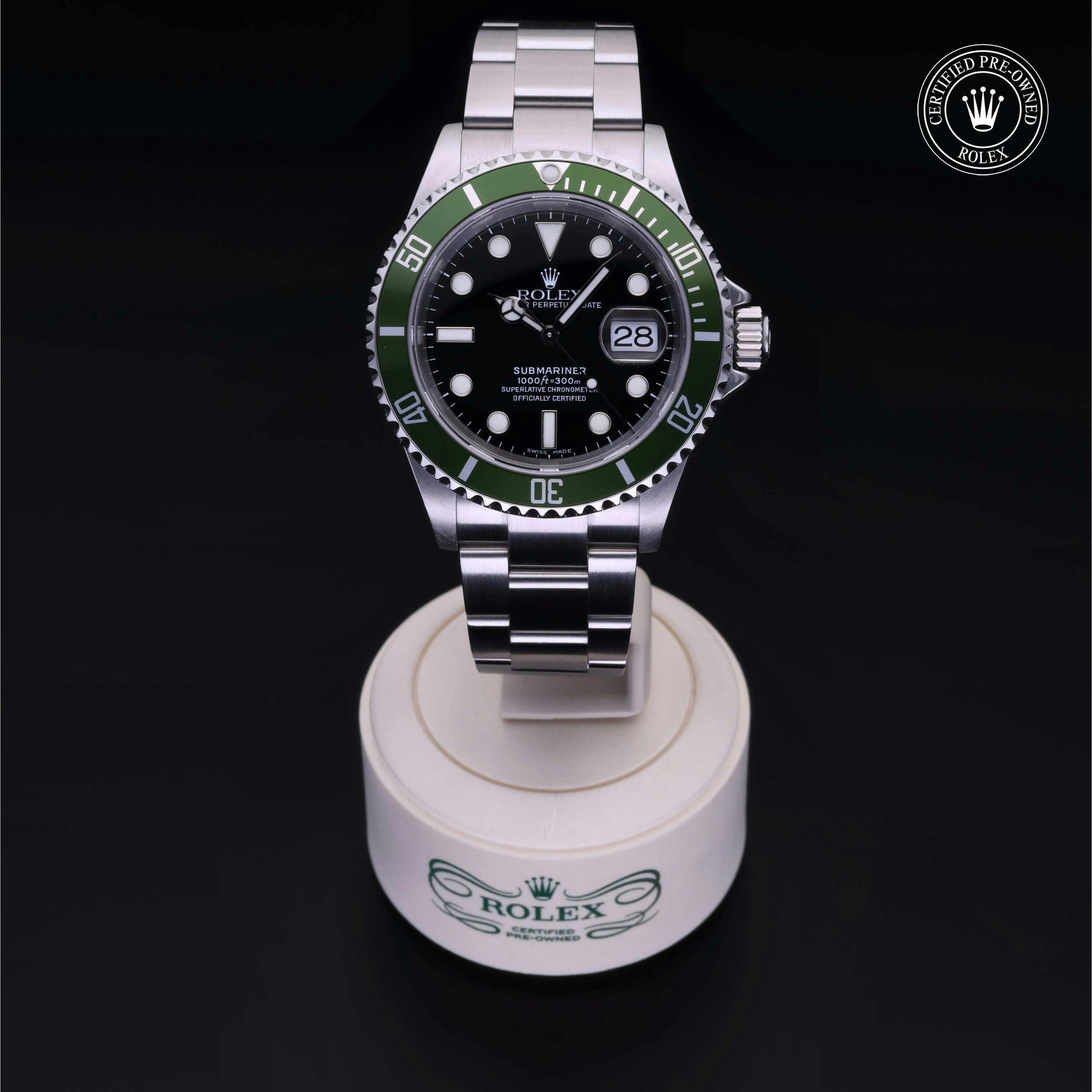 Rolex Certified Pre-Owned Submariner Date (16610LV) self - winding automatic watch, features a 40mm stainless steel case with a green aluminum bezel insert surrounding a black dial on a stainless steel oyster bracelet. Functions include hours, minutes, seconds and date. This watch has received Rolex-authorized service and certification. It comes with the original box and papers, and includes a custom Rolex Certified Pre-Owned hang tag, travel pouch and RCPO international warranty card.