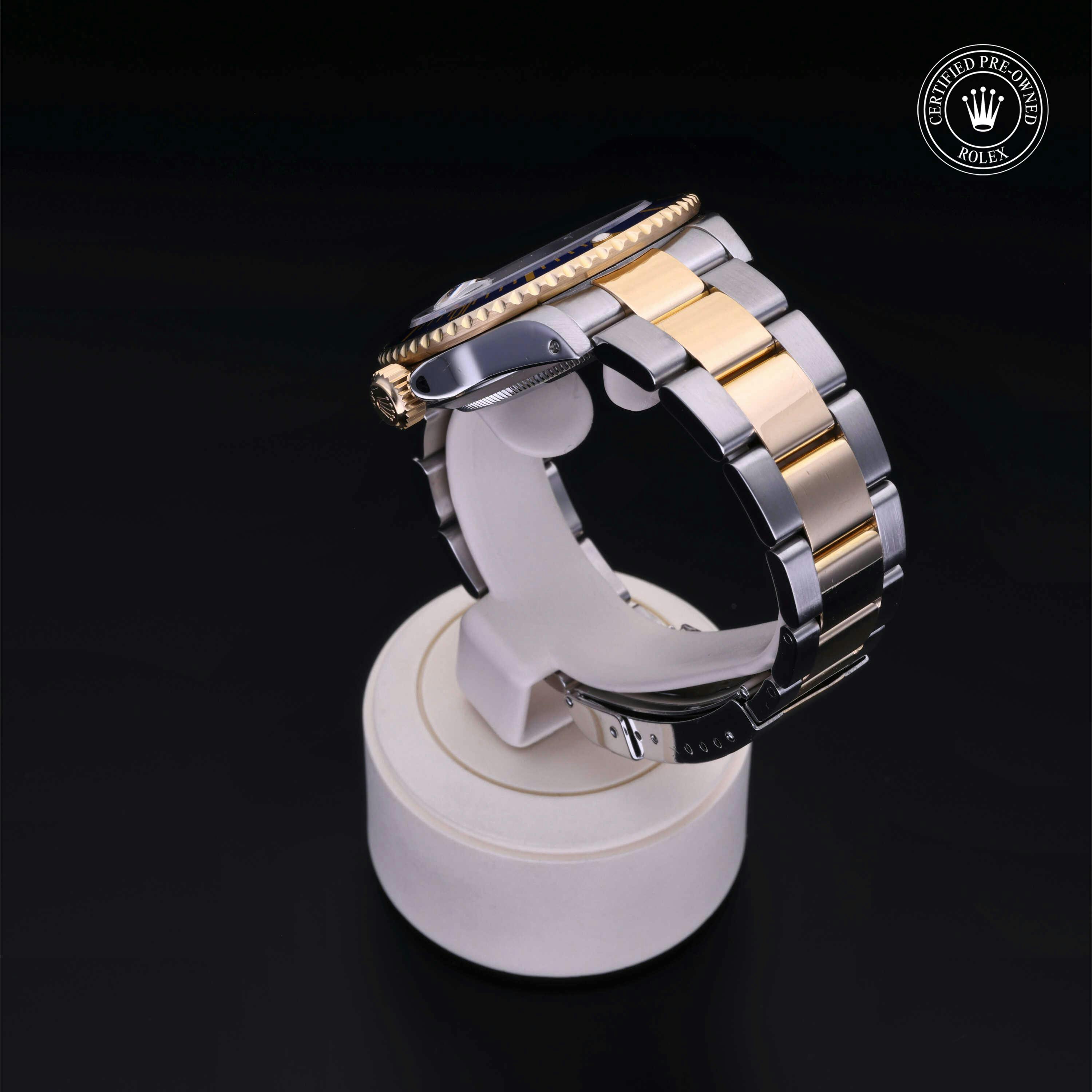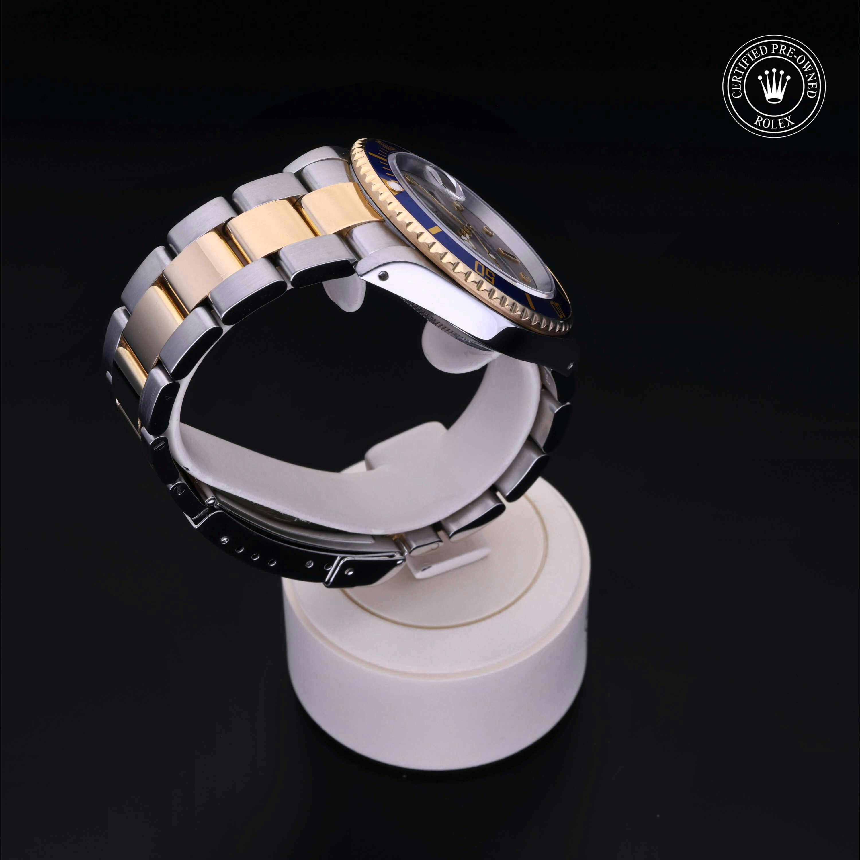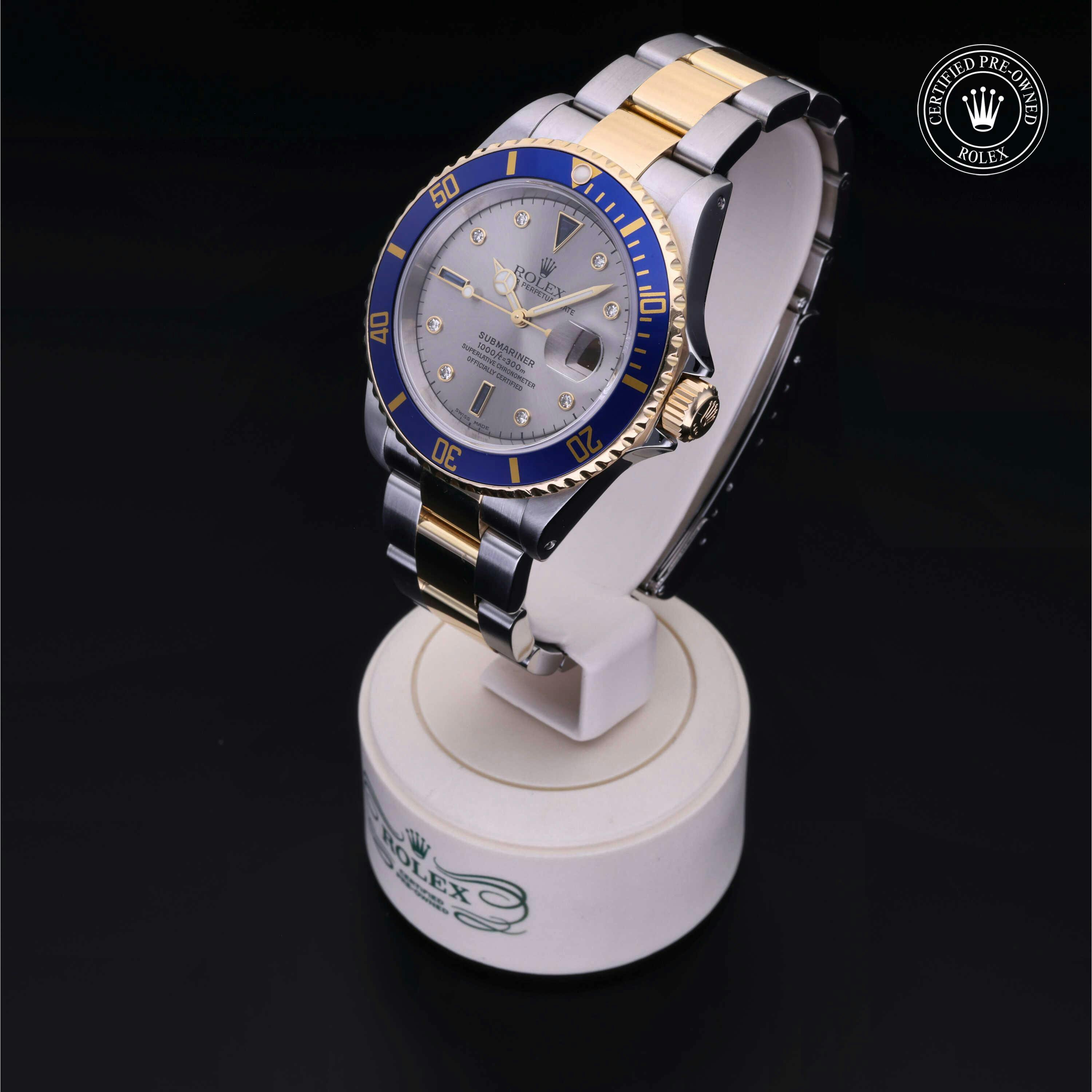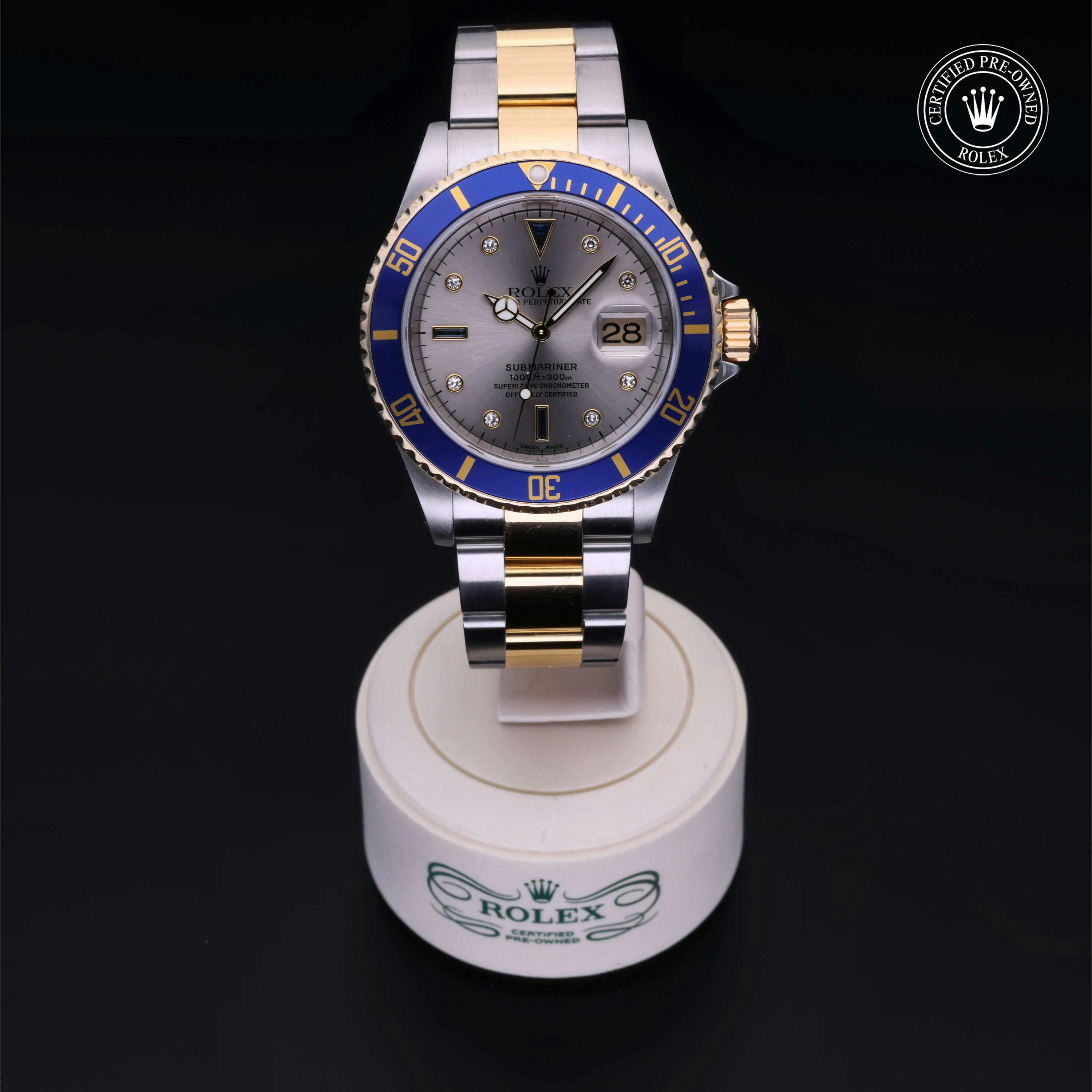 Rolex Certified Pre-Owned Submariner (16613) self - winding automatic watch, features a 40mm stainless case with an 18k yellow gold and blue aluminum bezel surrounding a steel diamond and sapphire set dial on a stainless steel and 18k yellow oyster bracelet. Functions include hours, minutes, seconds and date. This watch has received Rolex-authorized service and certification. It comes with the original box and papers, and includes a custom Rolex Certified Pre-Owned hang tag, travel pouch and RCPO international warranty card.