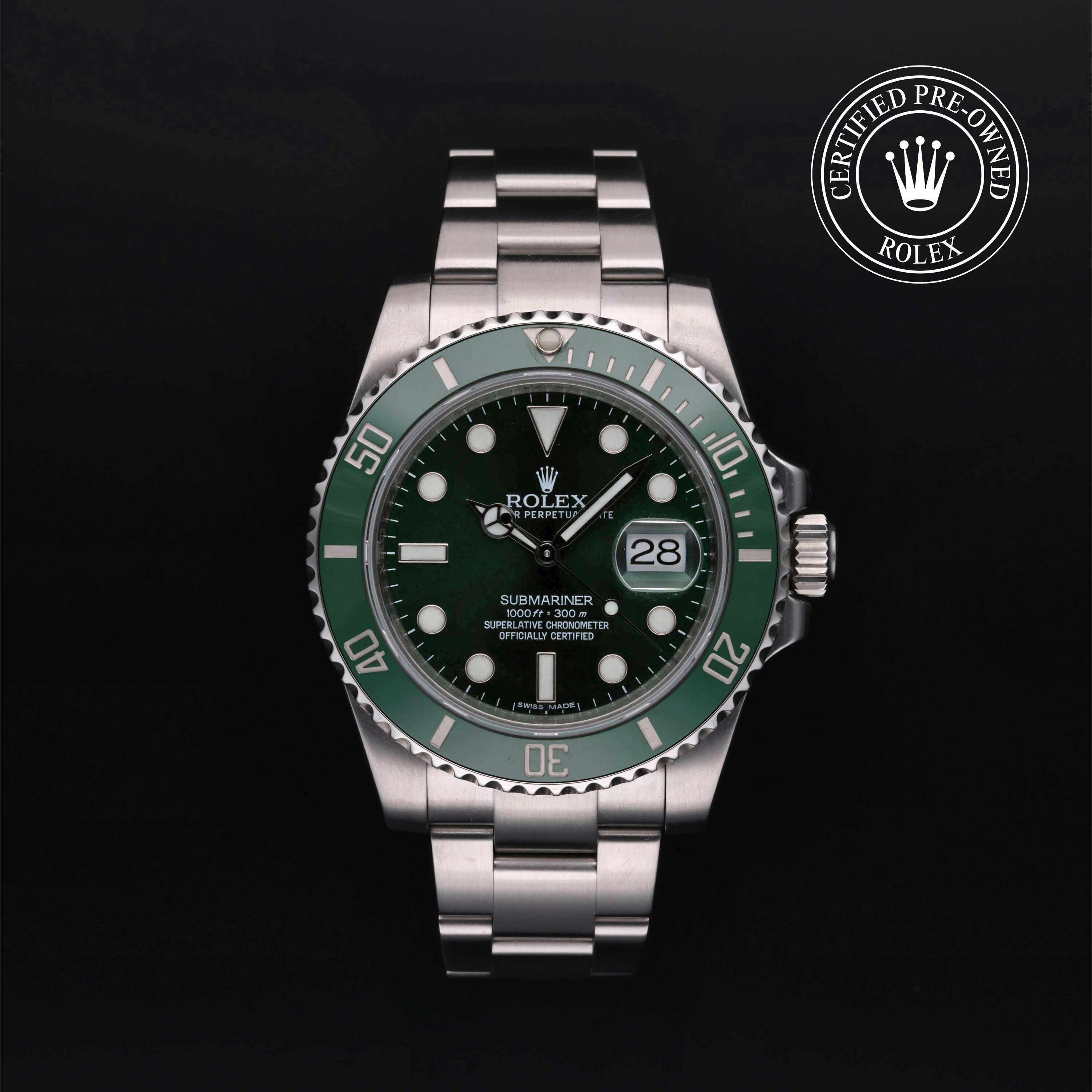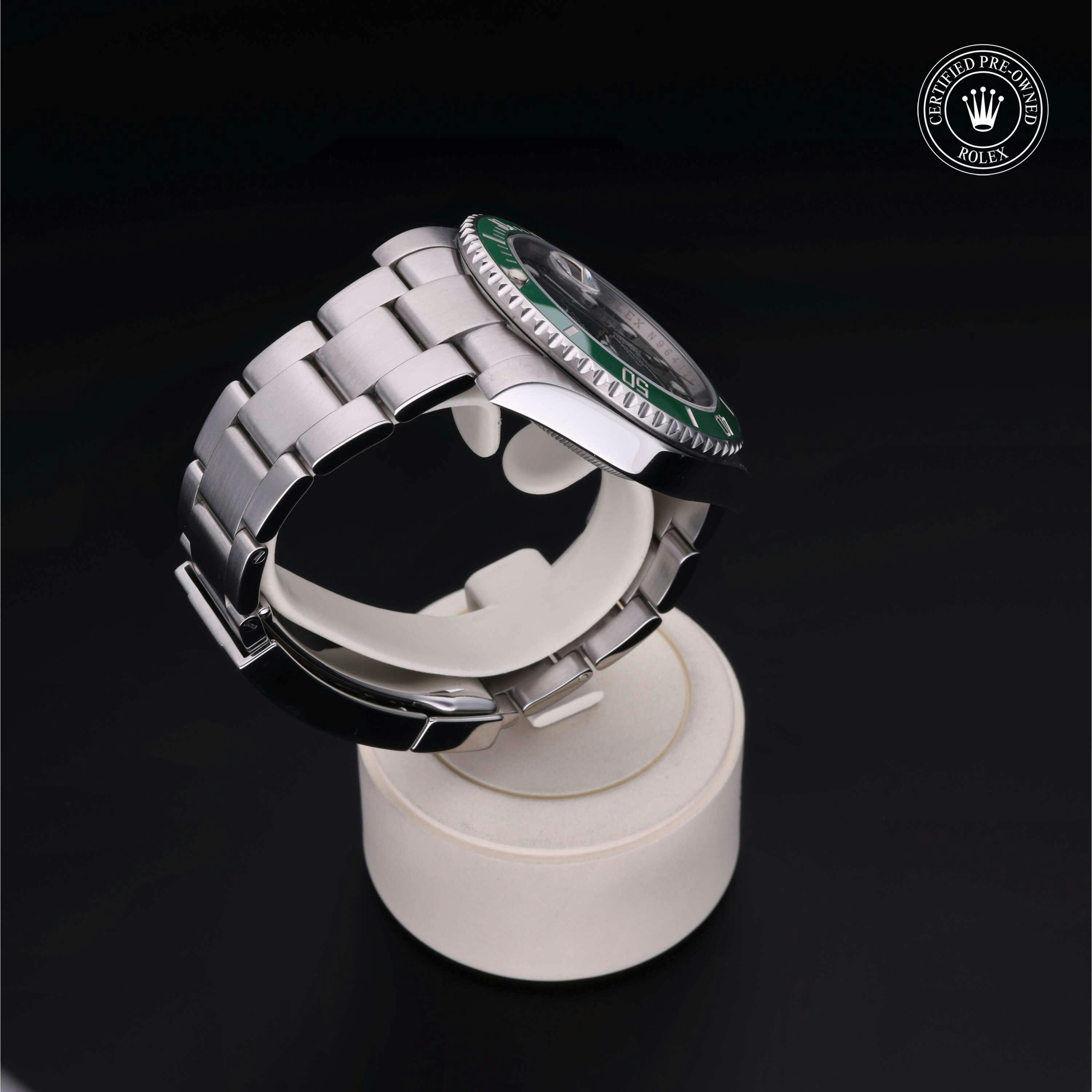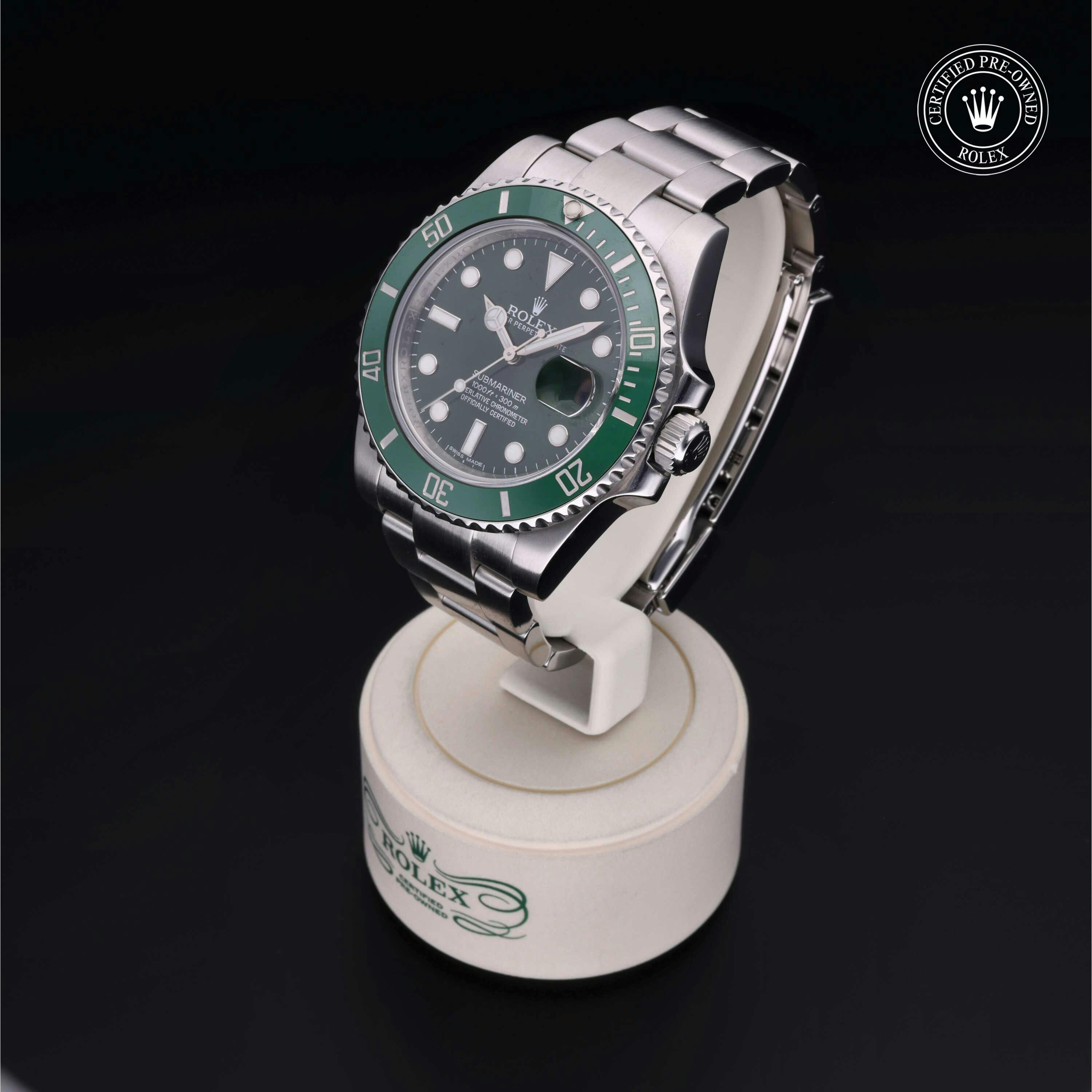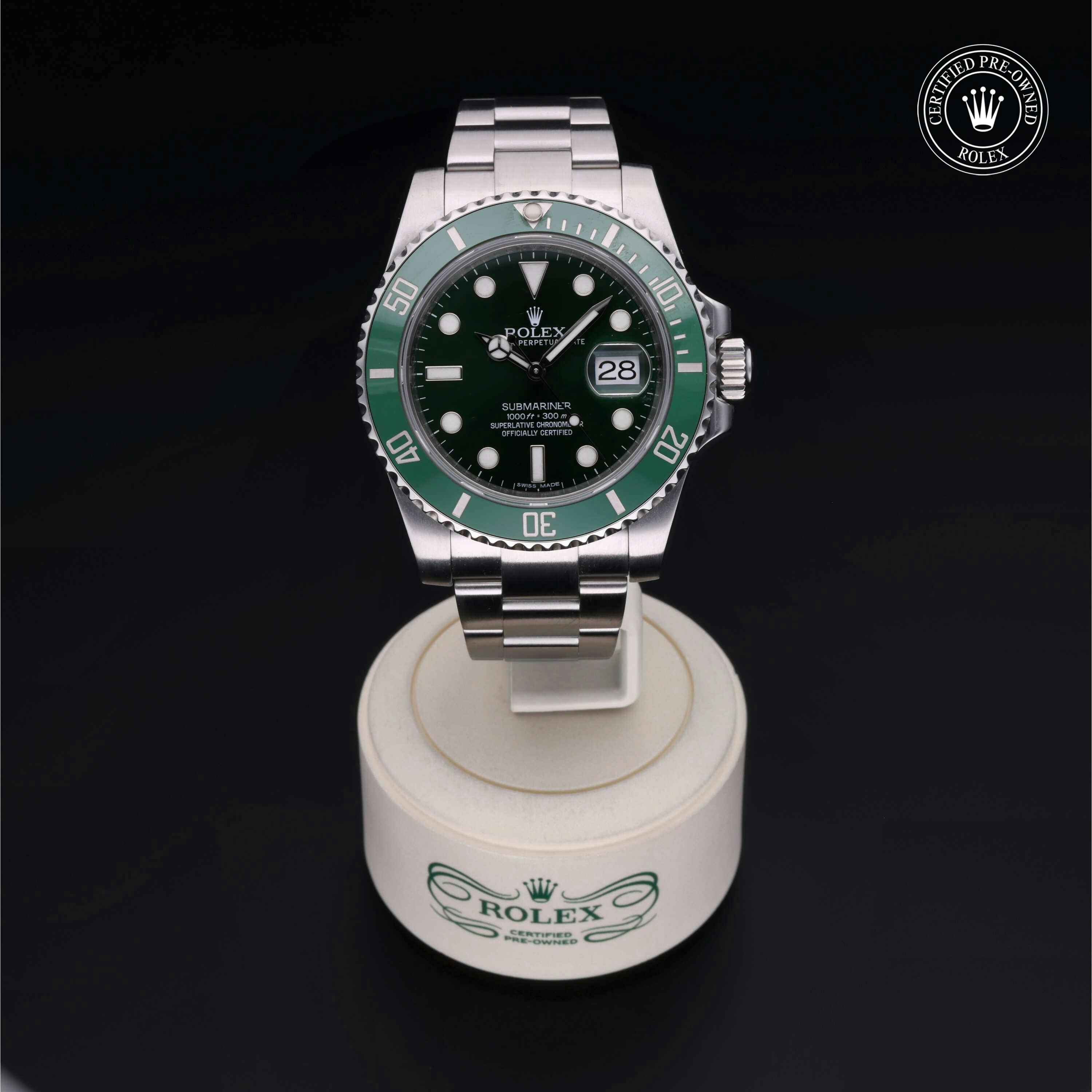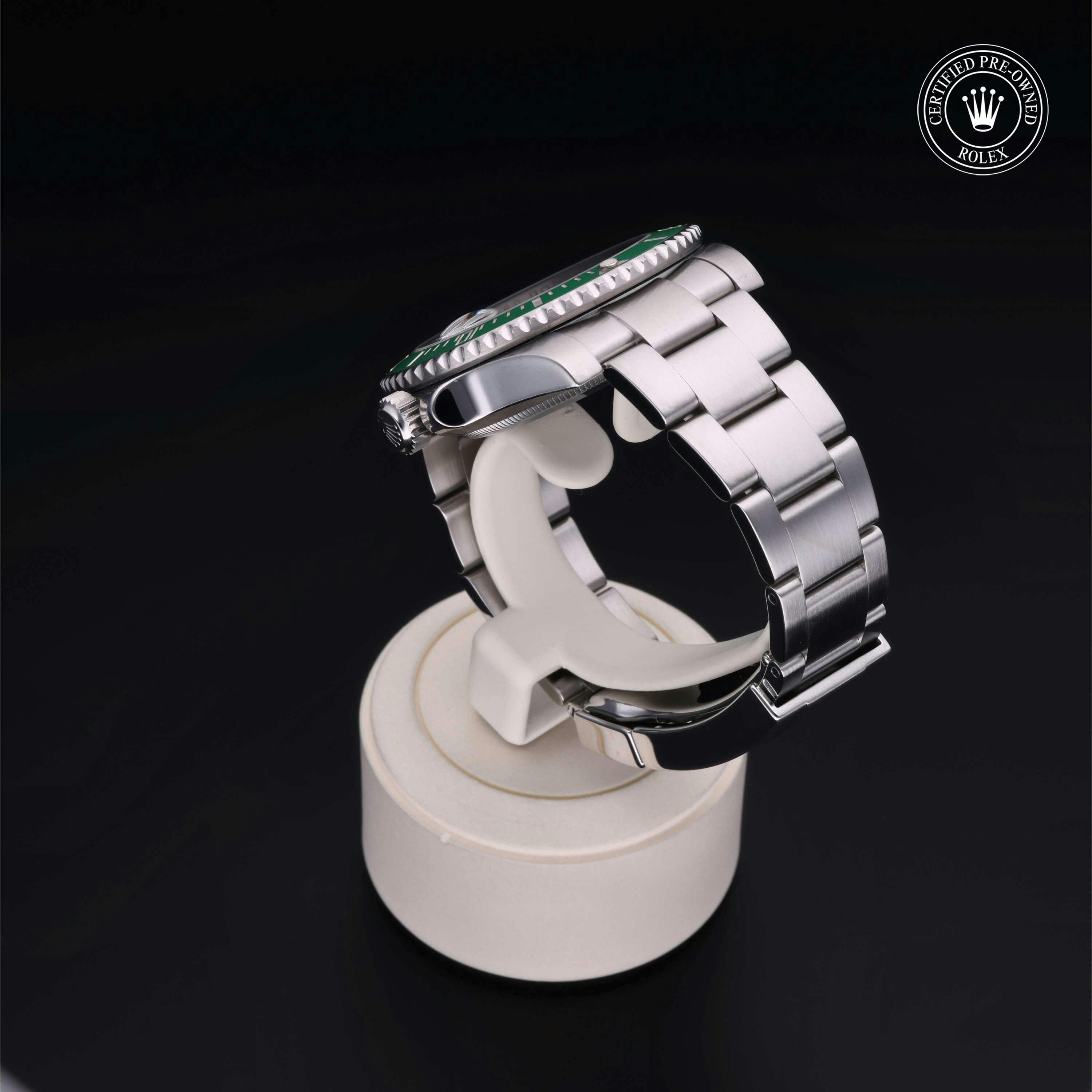 Rolex Certified Pre-Owned Submariner Date (116610LV) self - winding automatic watch, features a 40mm stainless steel case and rotating bezel with a green cerachrom insert surrounding a green dial on a stainless steel oyster bracelet. Functions include hours, minutes, seconds and date. This watch has received Rolex-authorized service and certification. It does not come with the original box or papers, but includes a custom Rolex Certified Pre-Owned hang tag, travel pouch and RCPO international warranty card.