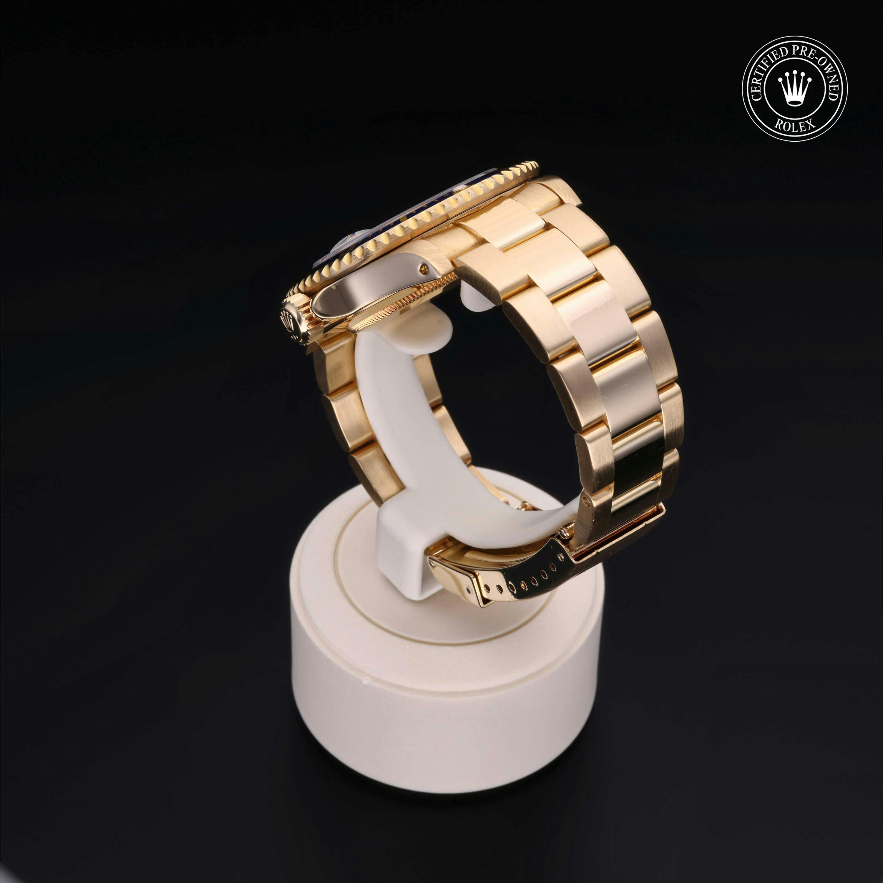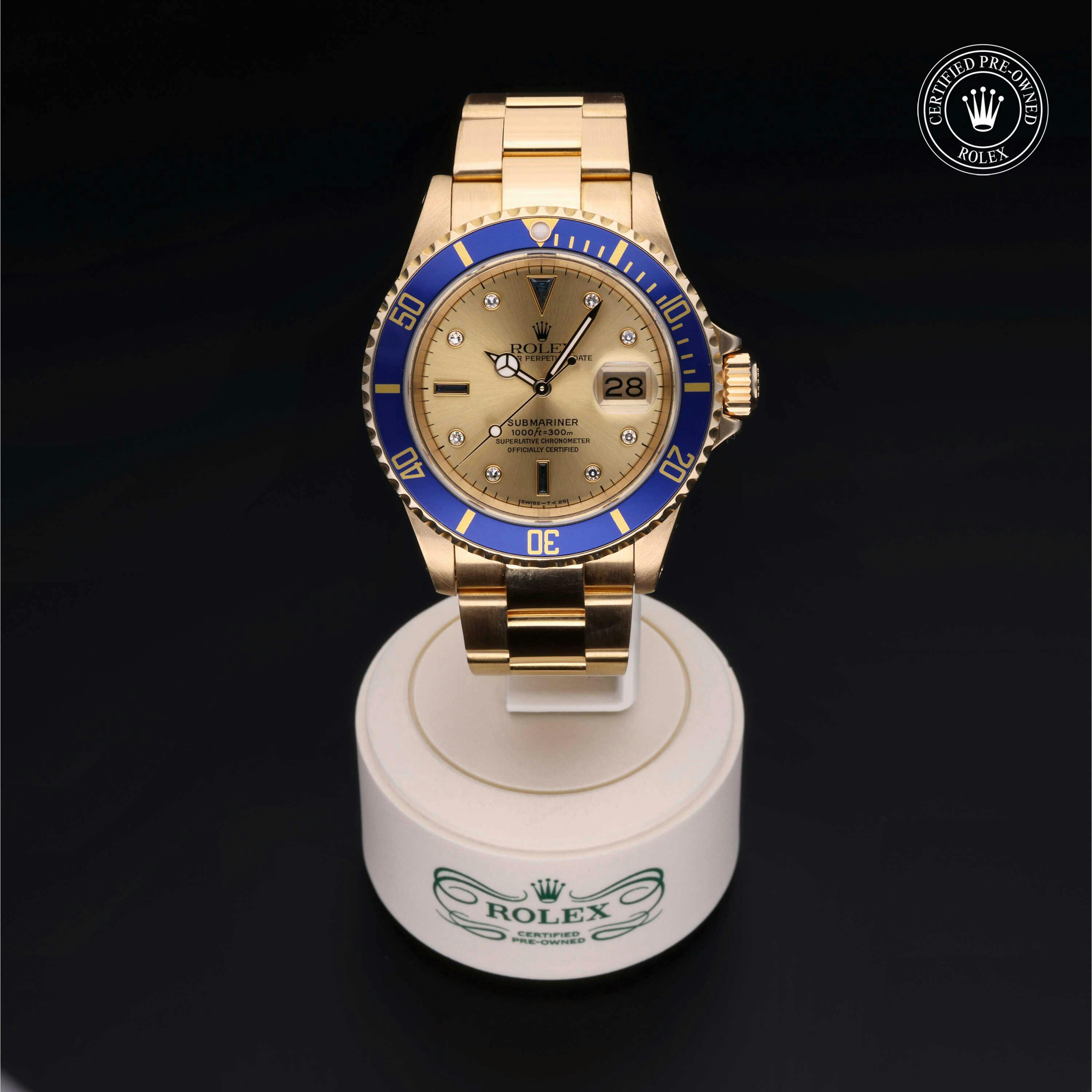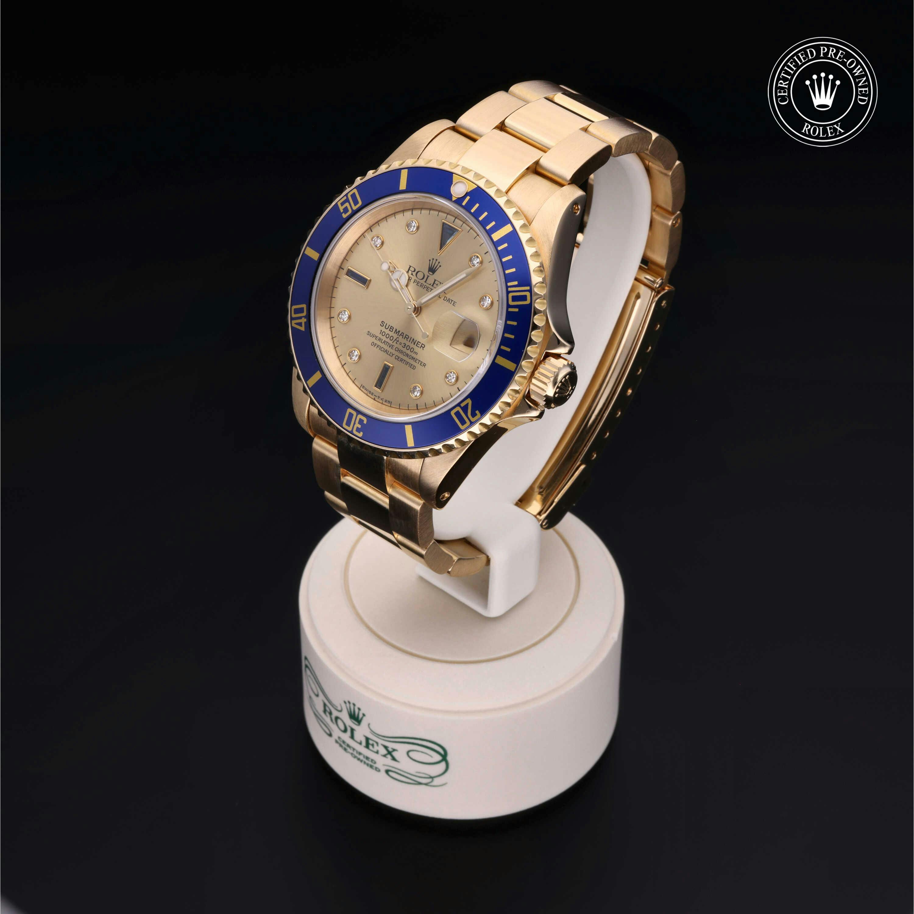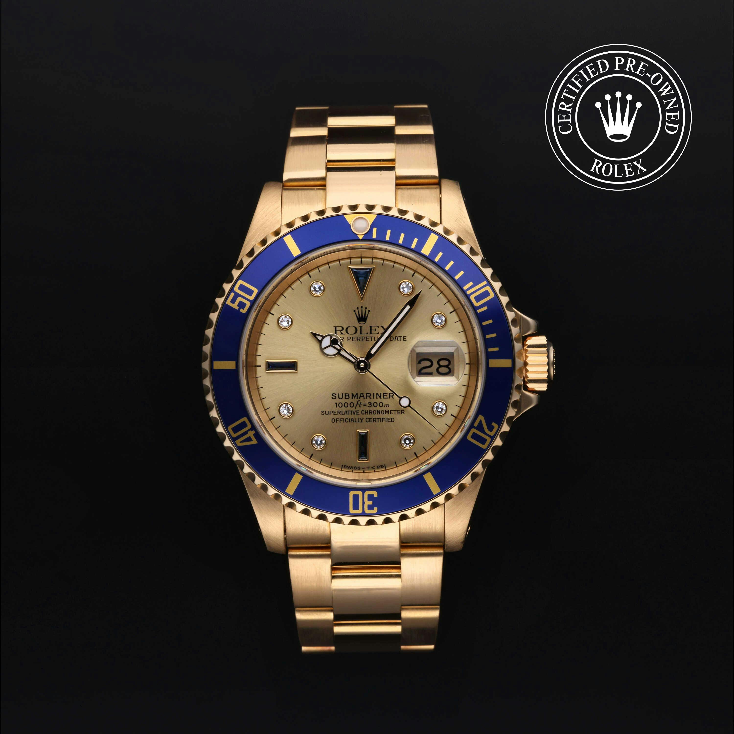 Rolex Certified Pre-Owned Submariner (16618) self - winding automatic watch, features a 40mm 18k yellow gold case with a blue aluminum bezel insert surrounding a champagne diamond set dial on an 18k yellow gold oyster bracelet. Functions include hours, minutes, seconds, date and gmt/world time. This watch has received Rolex-authorized service and certification. It does not come with the original box or papers, but includes a custom Rolex Certified Pre-Owned hang tag, travel pouch and RCPO international warranty card.