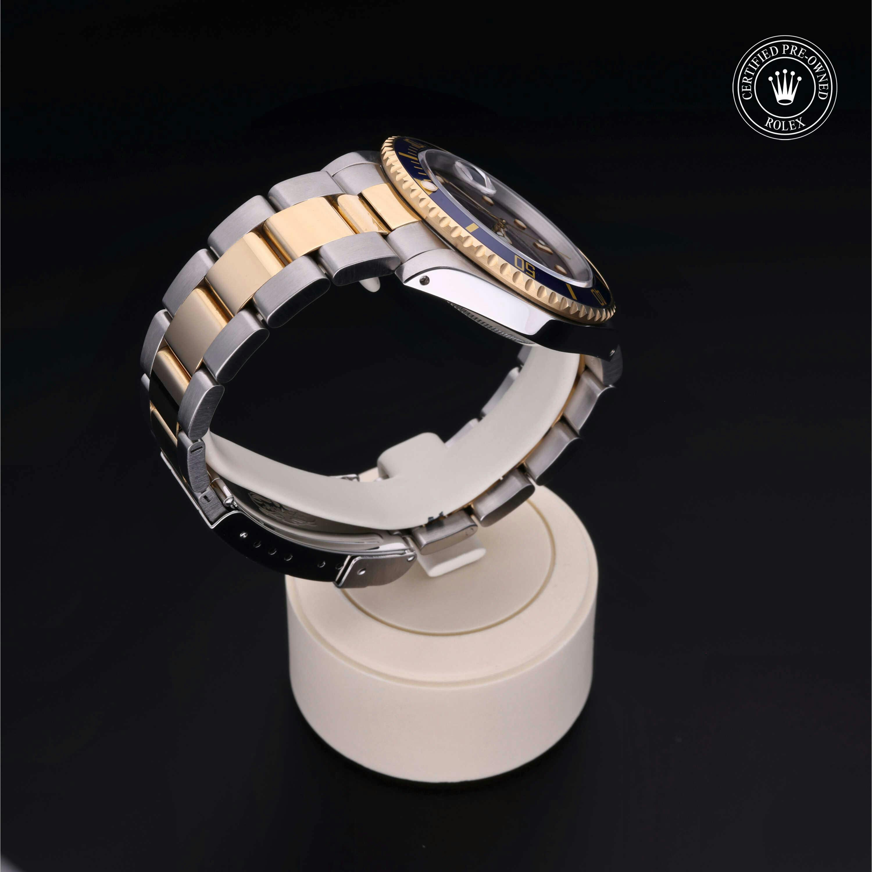 Rolex Certified Pre-Owned Submariner Date (16613) self - winding automatic watch, features a 40mm stainless steel case with an 18k yellow gold unidirectional rotating bezel featuring a blue aluminium 60-minute scale insert, surrounding a blue dial. The watch is secured on a stainless steel and 18k yellow gold Oyster bracelet complete with a folding buckle. Functions include hours, minutes, seconds and date. This watch has been serviced by an authorized service center and certified by Rolex. It does not come with the original box or papers, but includes a custom Rolex Certified Pre-Owned hang tag, travel pouch and international warranty card.