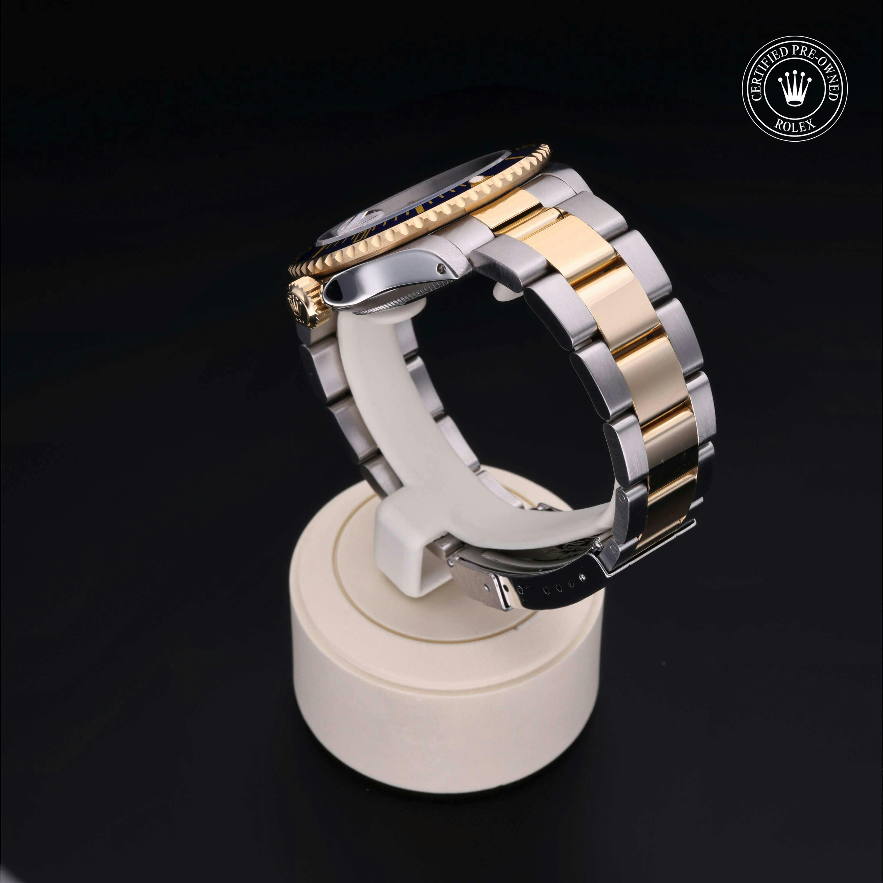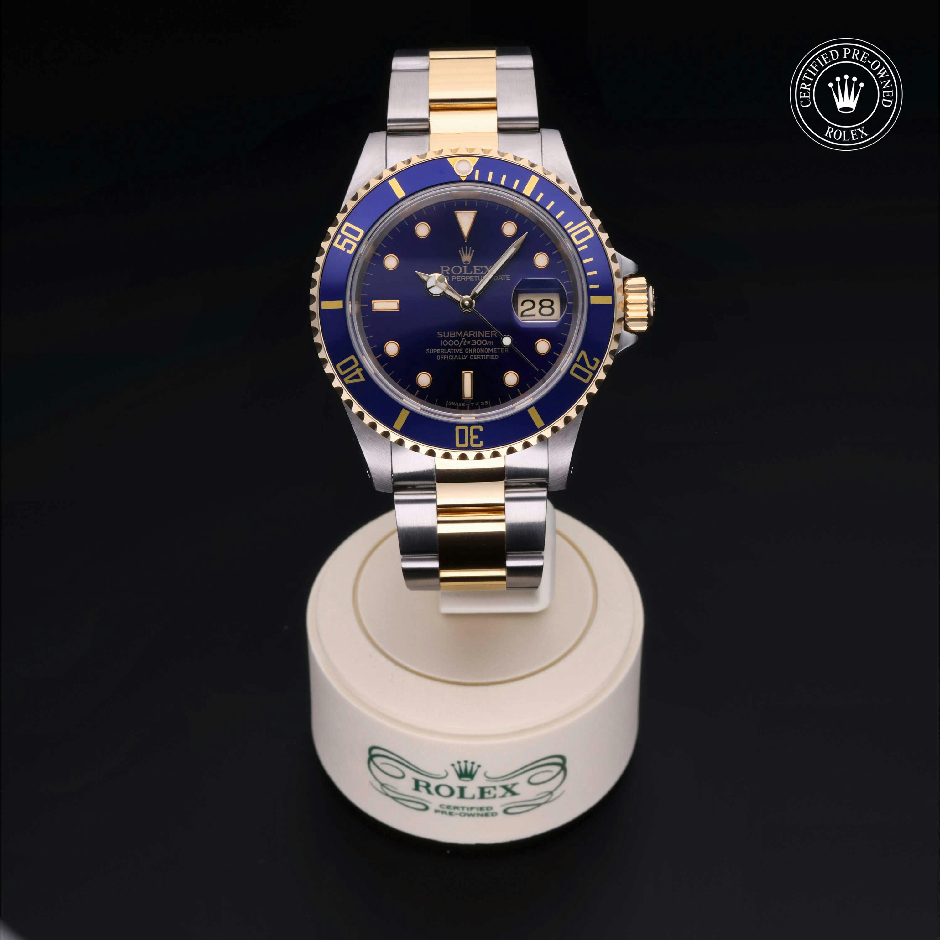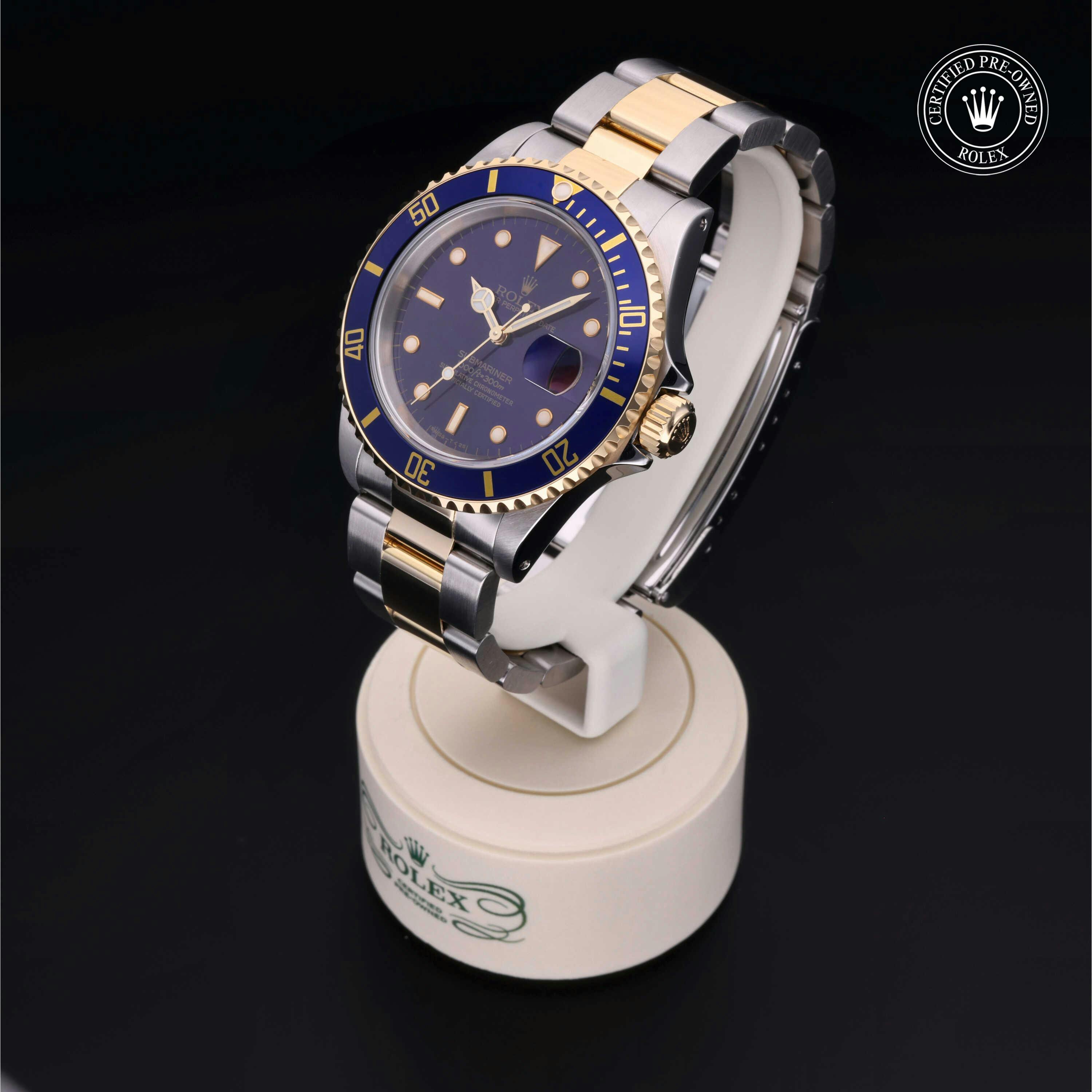 Rolex Certified Pre-Owned Submariner Date (16613) self - winding automatic watch, features a 40mm stainless steel case with an 18k yellow gold unidirectional rotating bezel featuring a blue aluminium 60-minute scale insert, surrounding a blue dial. The watch is secured on a stainless steel and 18k yellow gold Oyster bracelet complete with a folding buckle. Functions include hours, minutes, seconds and date. This watch has been serviced by an authorized service center and certified by Rolex. It does not come with the original box or papers, but includes a custom Rolex Certified Pre-Owned hang tag, travel pouch and international warranty card.