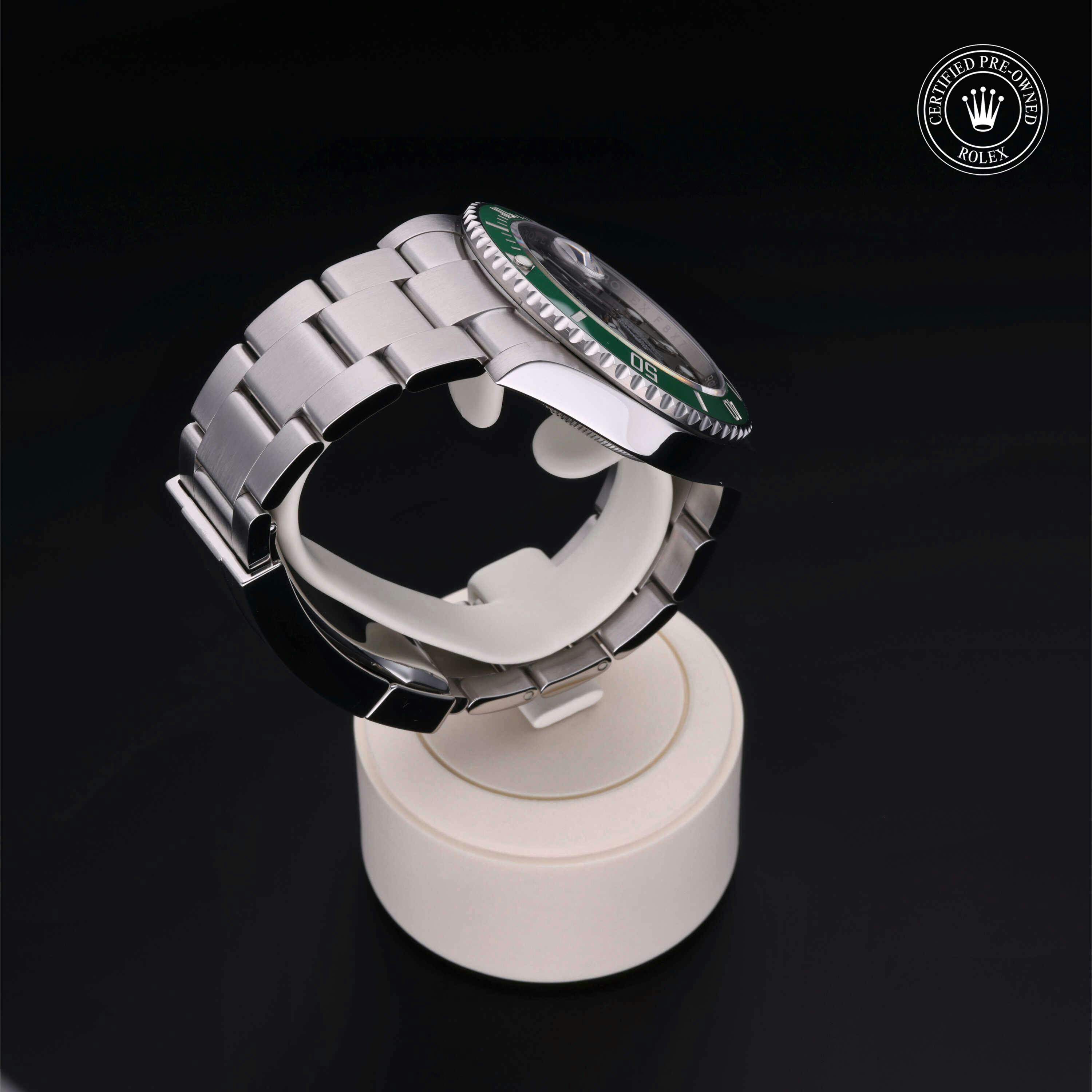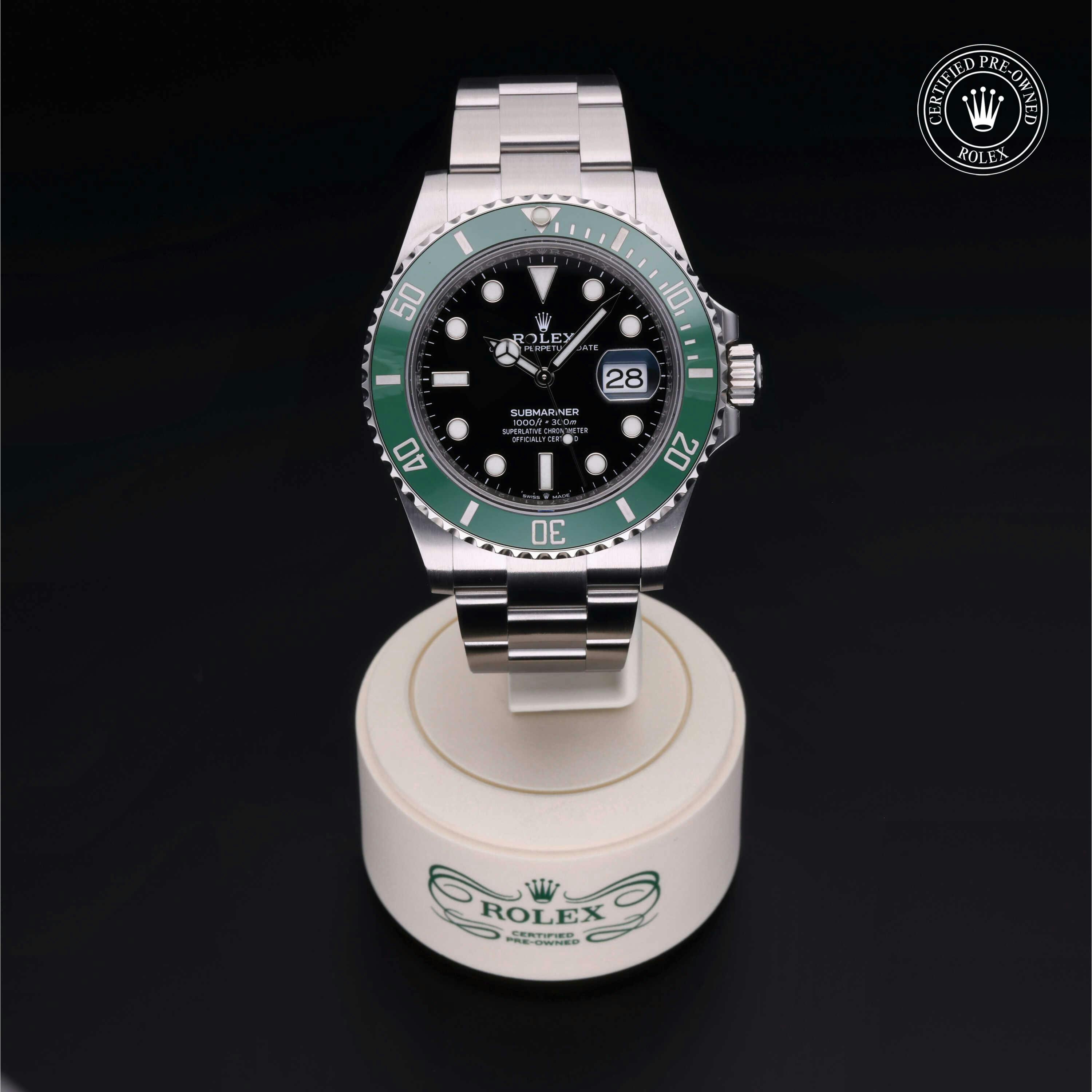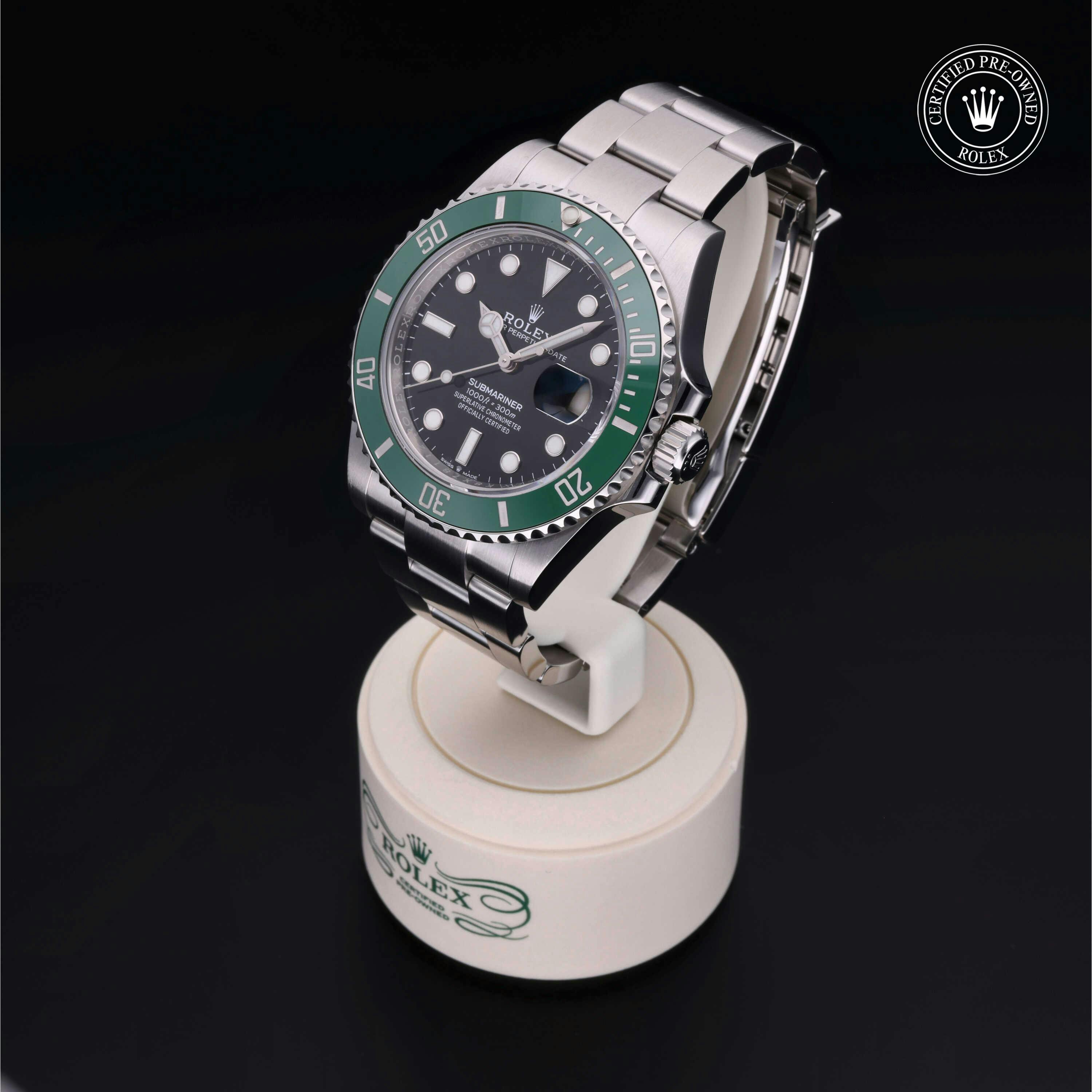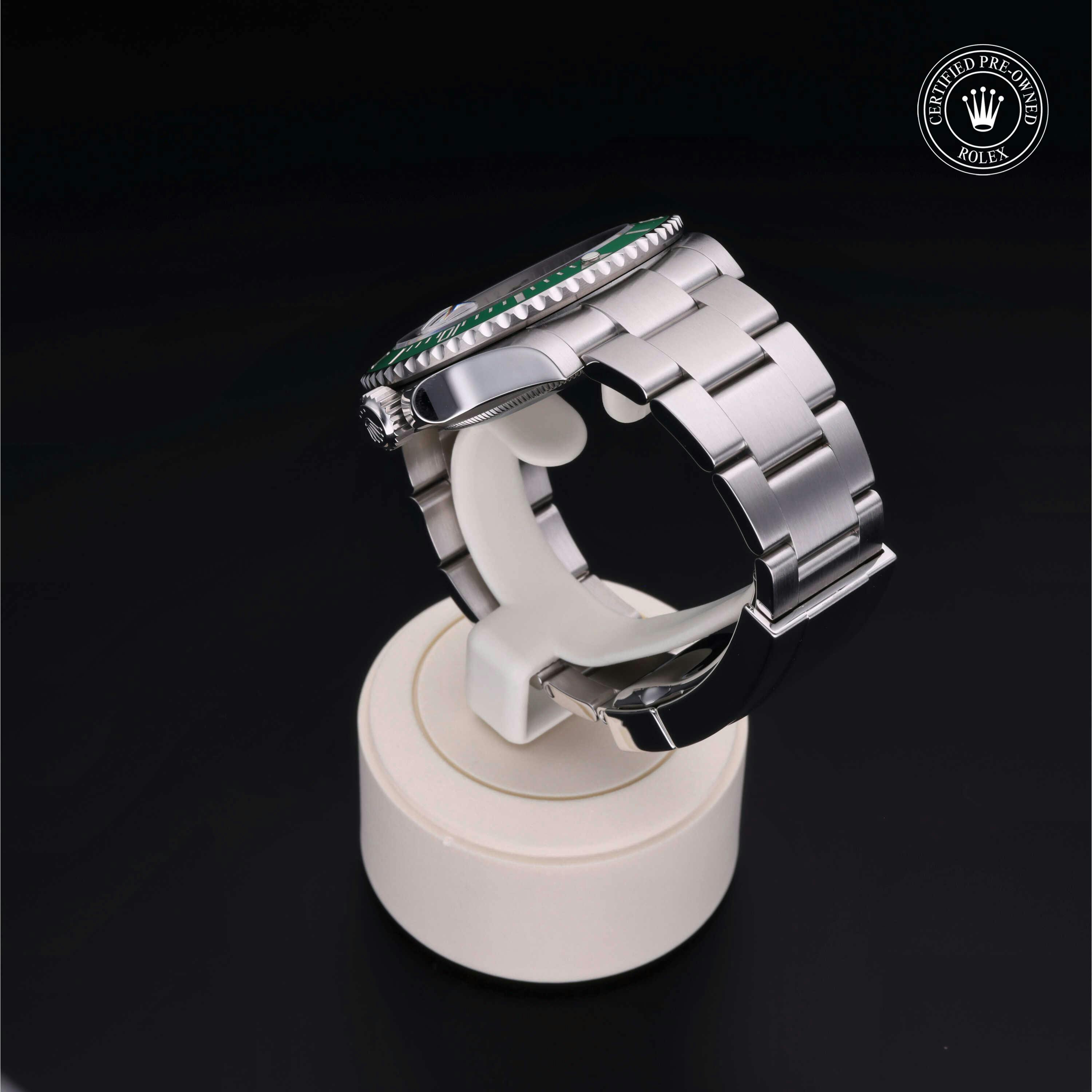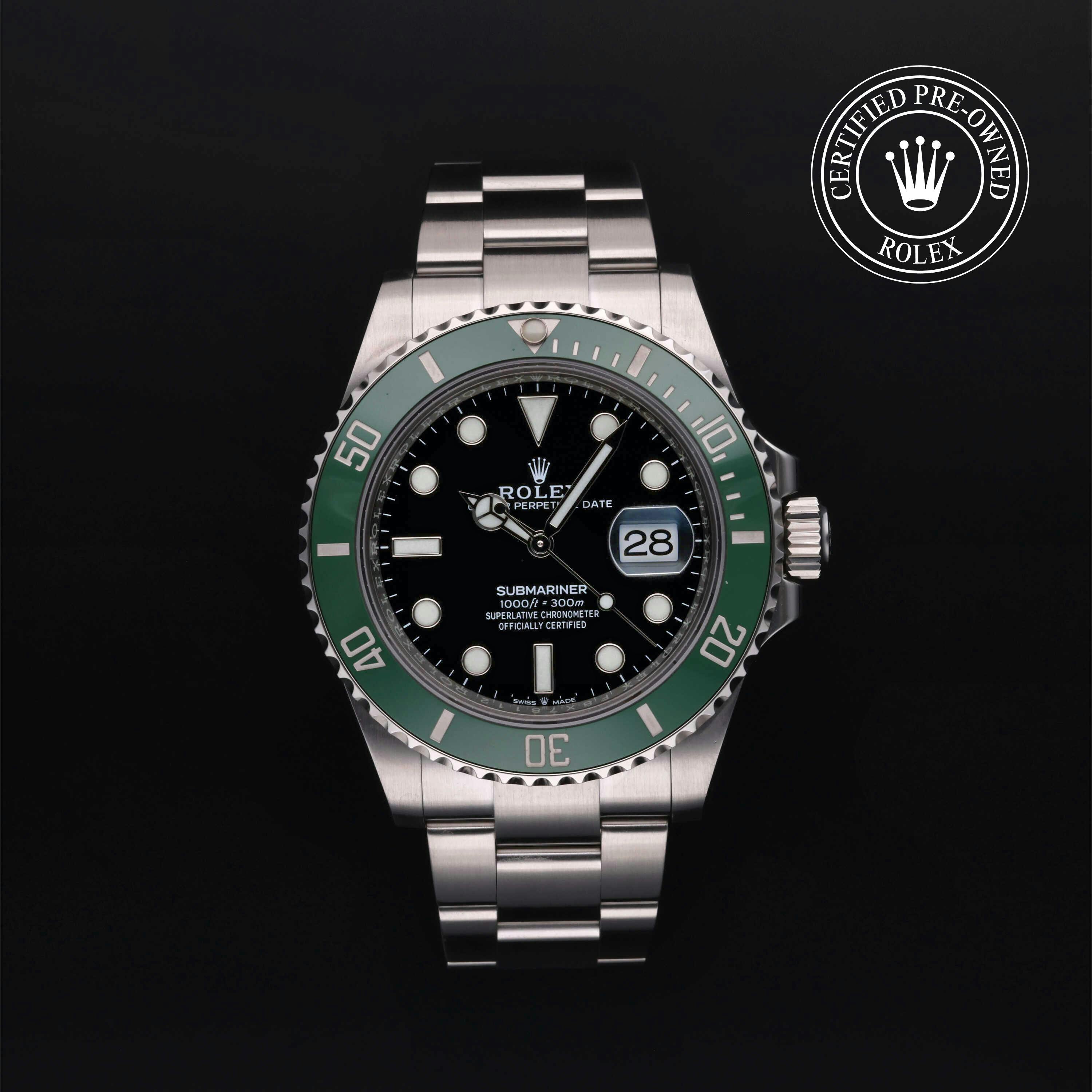 Rolex Certified Pre-Owned Submariner (126610LV) self - winding automatic watch, features a 41mm stainless steel case with a green cerachrom bezel insert surrounding a black dial on a stainless steel oyster bracelet. Functions include hours, minutes, seconds and date. This watch has received Rolex-authorized service and certification. It comes with the original papers, and includes a custom Rolex Certified Pre-Owned hang tag, travel pouch and RCPO international warranty card.
