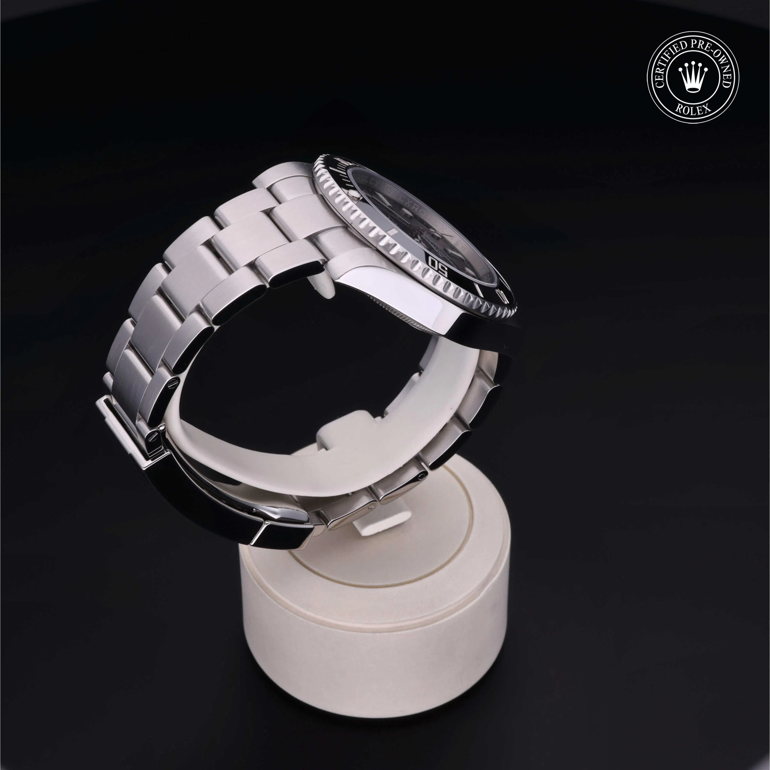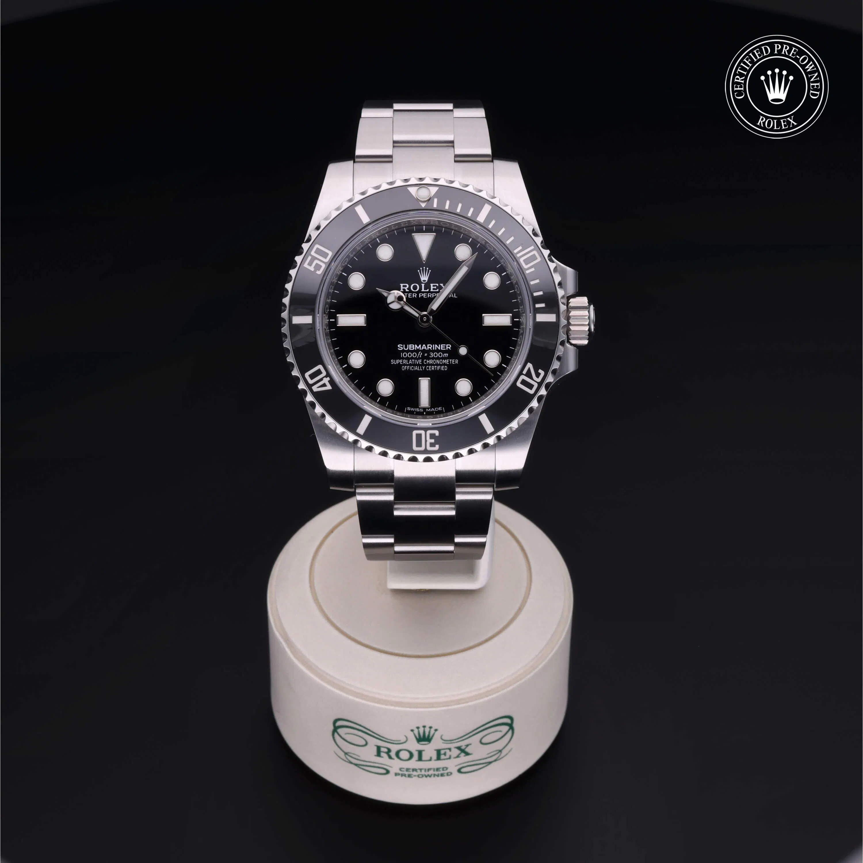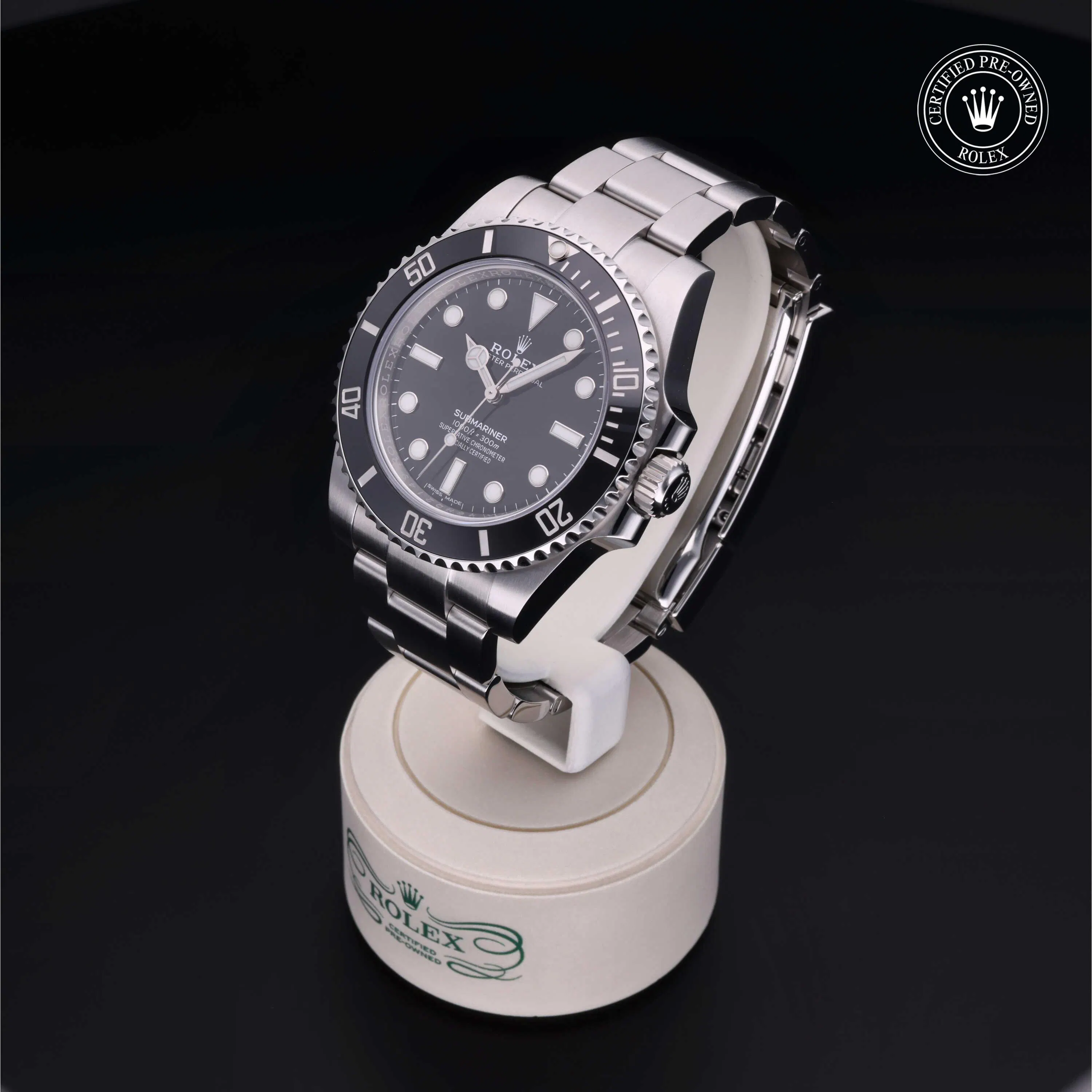 Rolex Certified Pre-Owned Submariner No Date (114060) self - winding automatic watch, features a 40mm stainless steel case and unidirectional rotating bezel with a black cerachrom insert surrounding a black dial on a stainless steel oyster bracelet. Functions include hours, minutes and seconds. This watch has received Rolex-authorized service and certification. It comes with the original box and papers, and includes a custom Rolex Certified Pre-Owned hang tag, travel pouch and RCPO international warranty card.