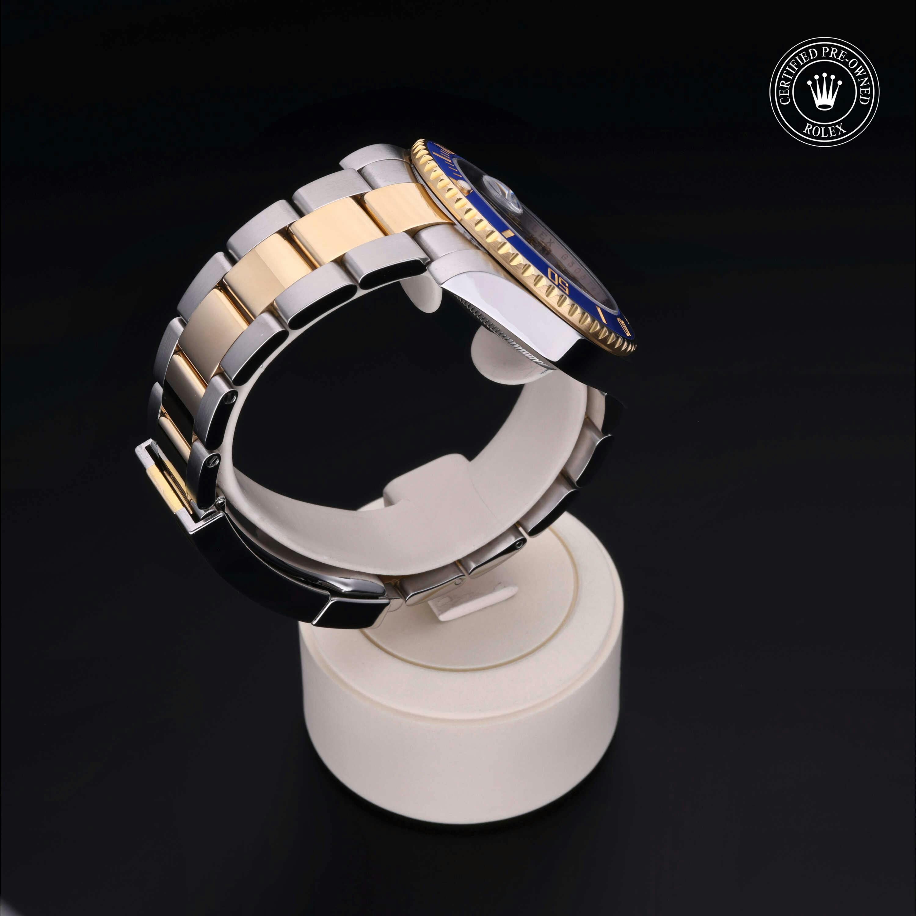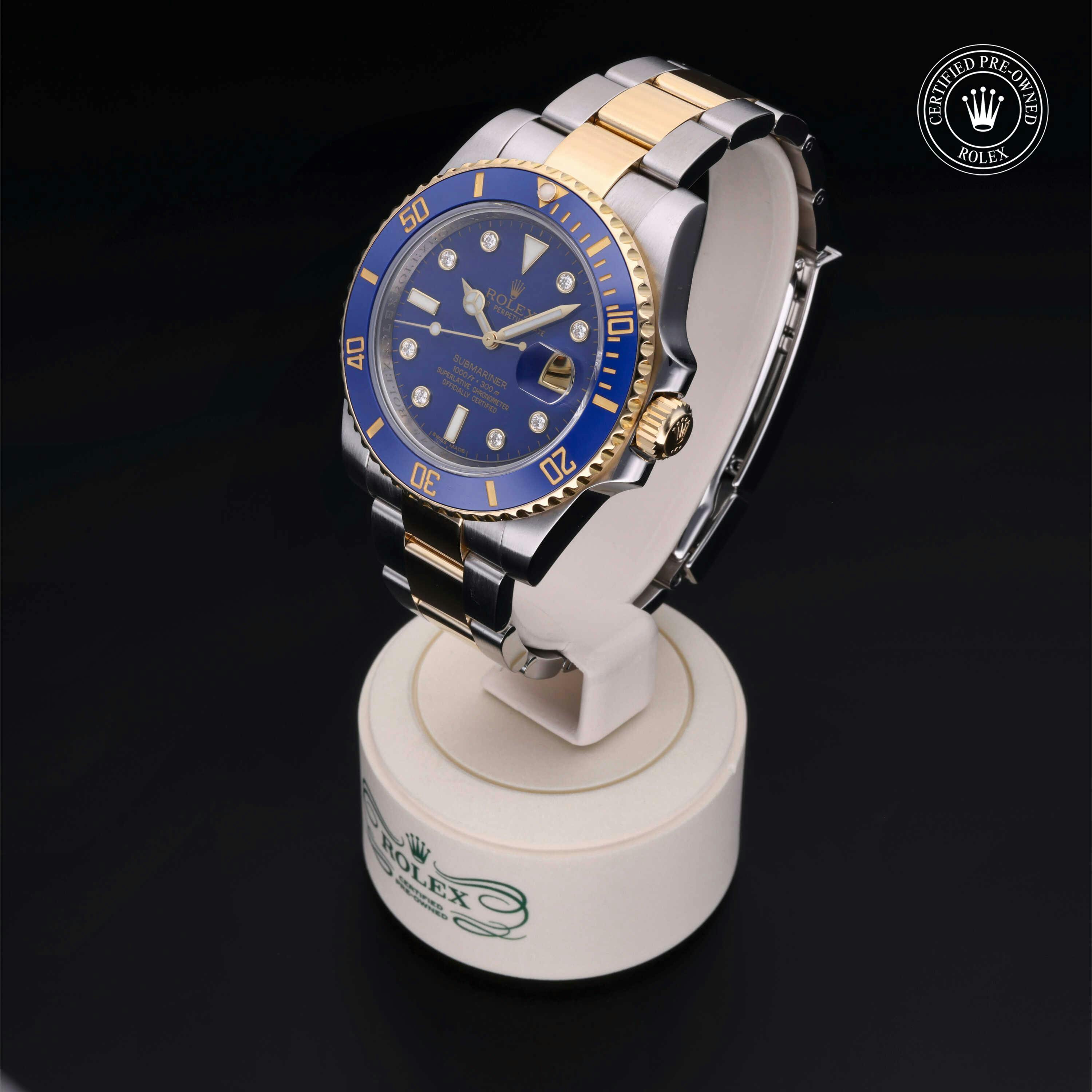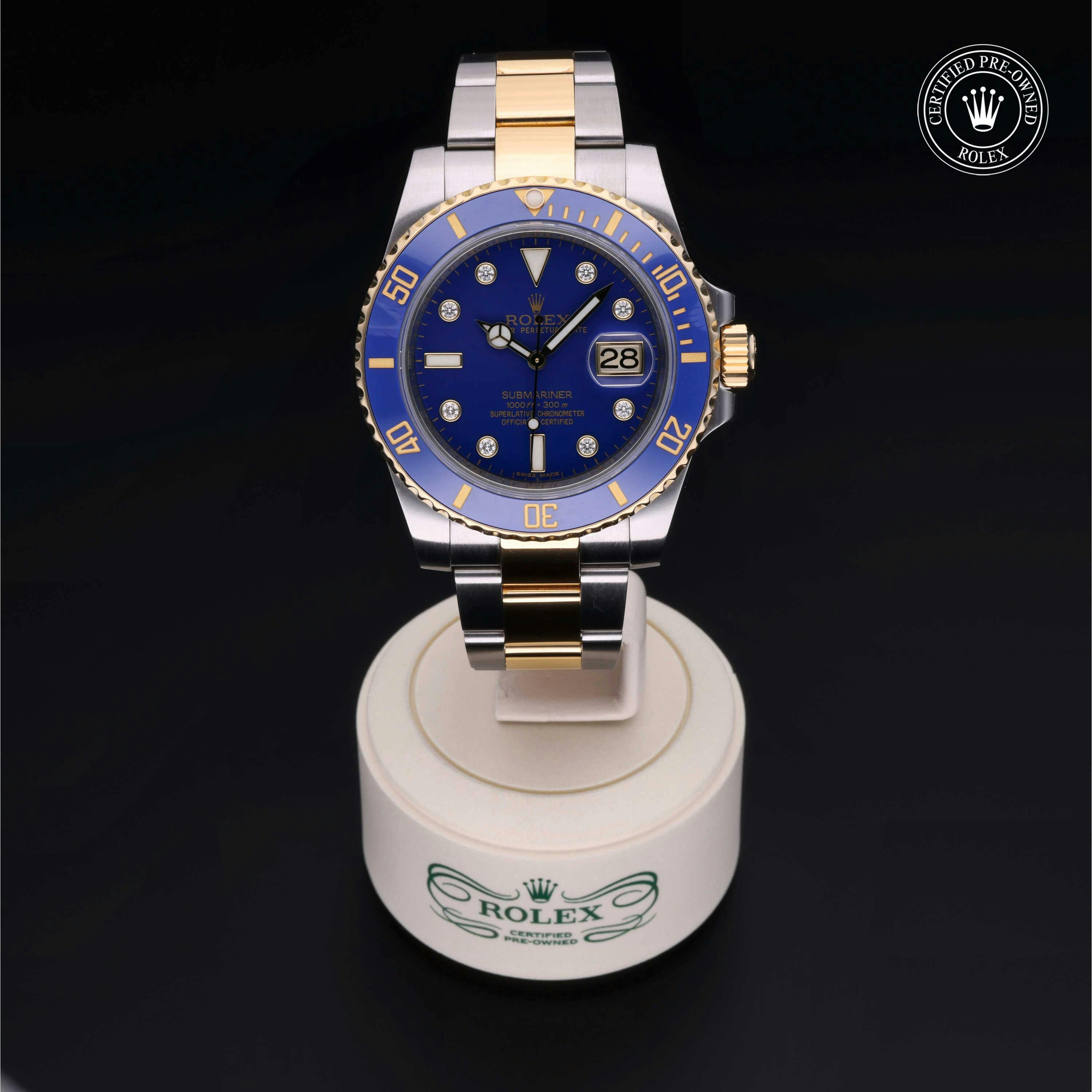 Rolex Certified Pre-Owned Submariner Date (116613LB) self - winding automatic watch, features a 40mm stainless steel case with an 18k yellow gold and blue cerachrom bezel surrounding a blue diamond set dial on a stainless steel and 18k yellow gold oyster bracelet. Functions include hours, minutes, seconds and date. This watch has received Rolex-authorized service and certification. It comes with the original box and papers, and includes a custom Rolex Certified Pre-Owned hang tag, travel pouch and RCPO international warranty card.