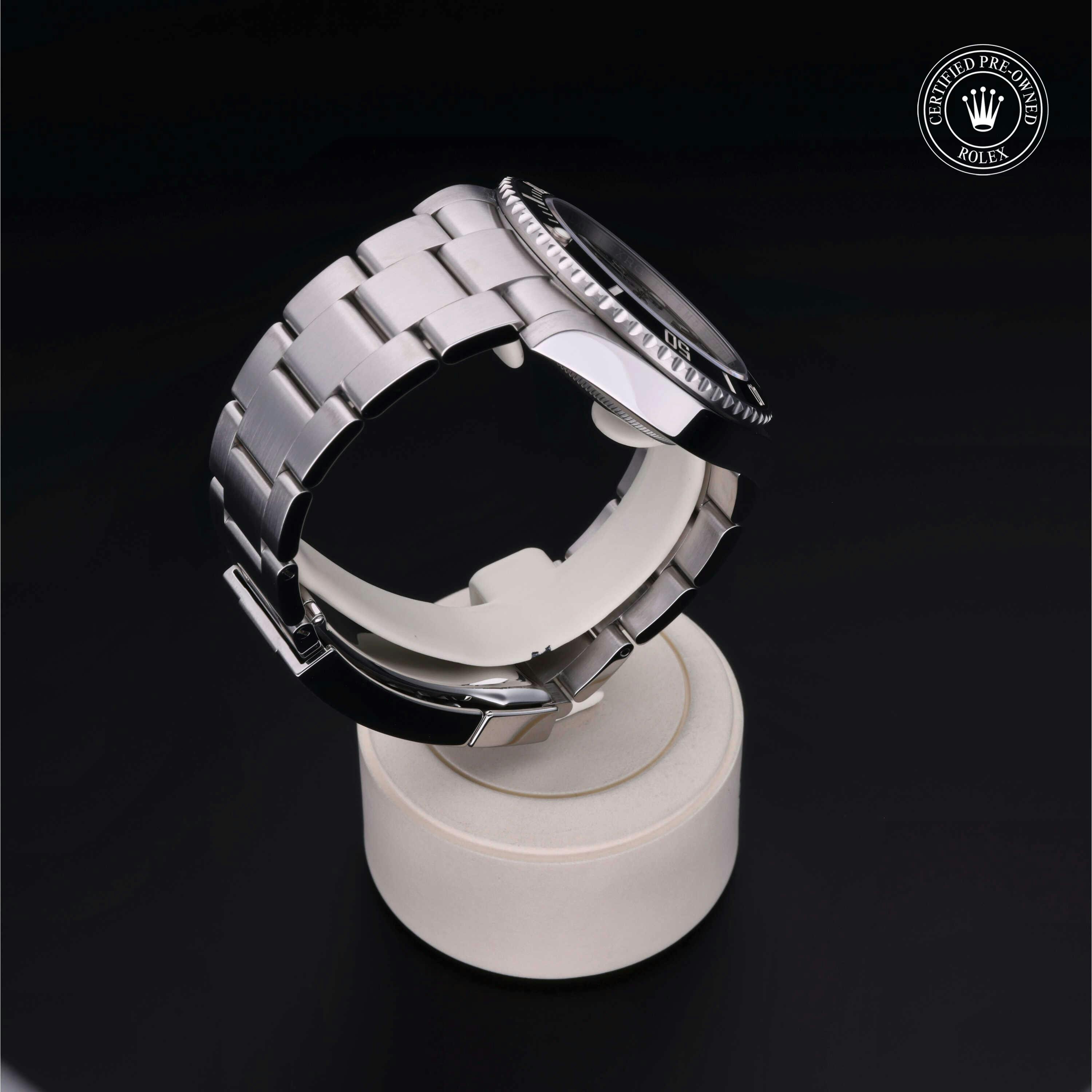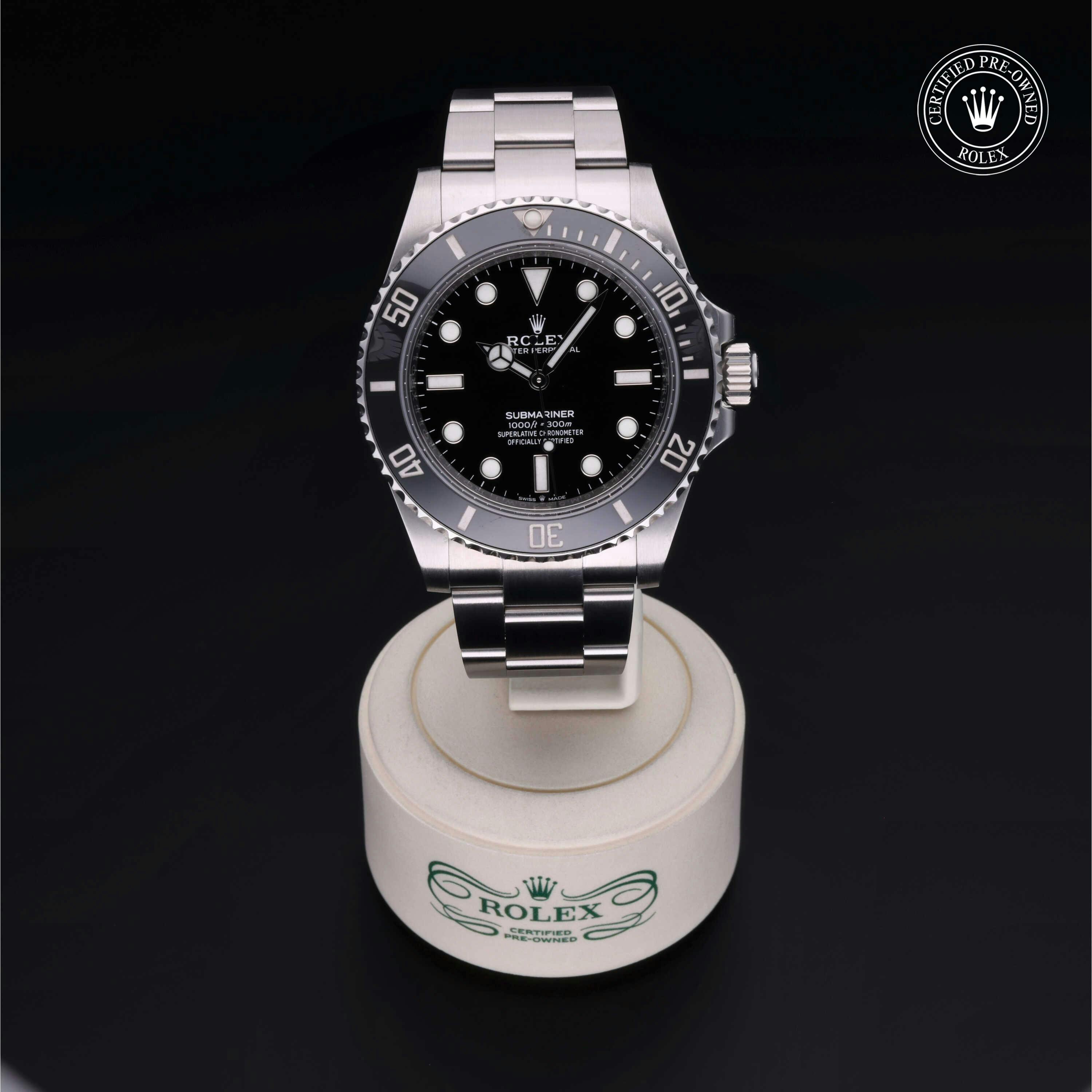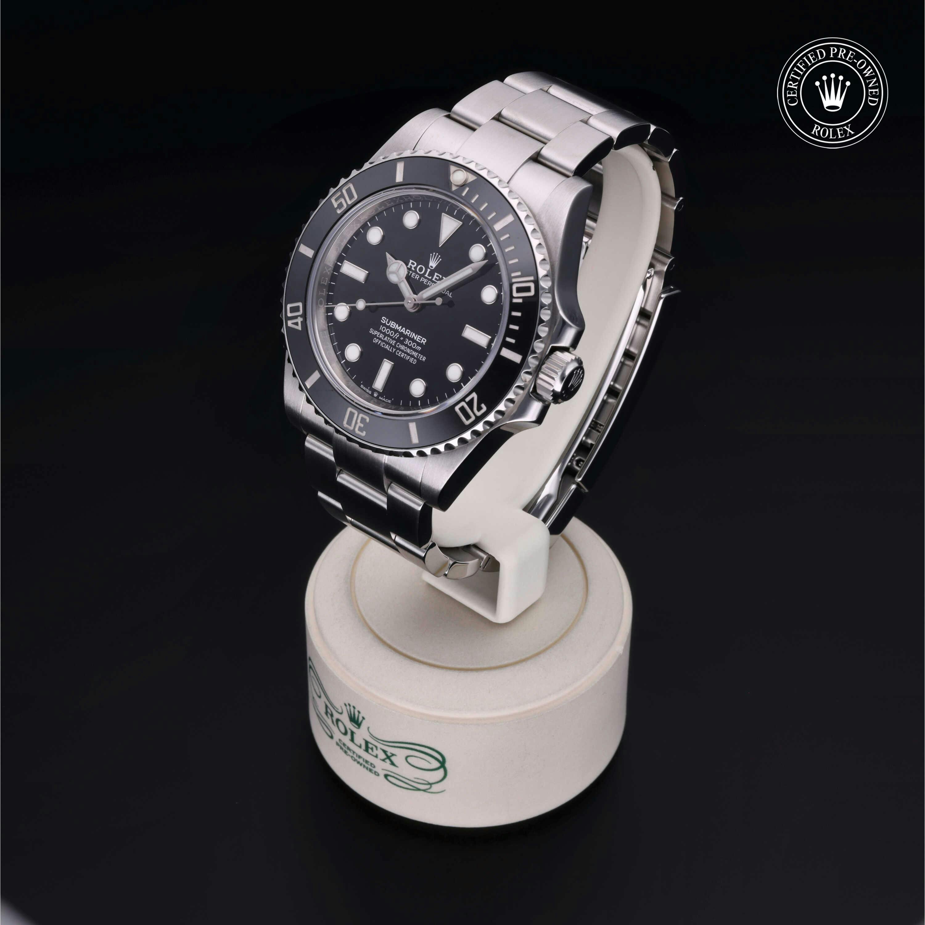 Rolex Certified Pre-Owned Submariner No Date (124060) self - winding automatic watch, features a 41mm stainless steel case and rotating bezel with a black cerachrom insert surrounding a black dial on a stainless steel oyster bracelet. Functions include hours, minutes and seconds. This watch has received Rolex-authorized service and certification. It comes with the original box and includes a custom Rolex Certified Pre-Owned hang tag, travel pouch and RCPO international warranty card.