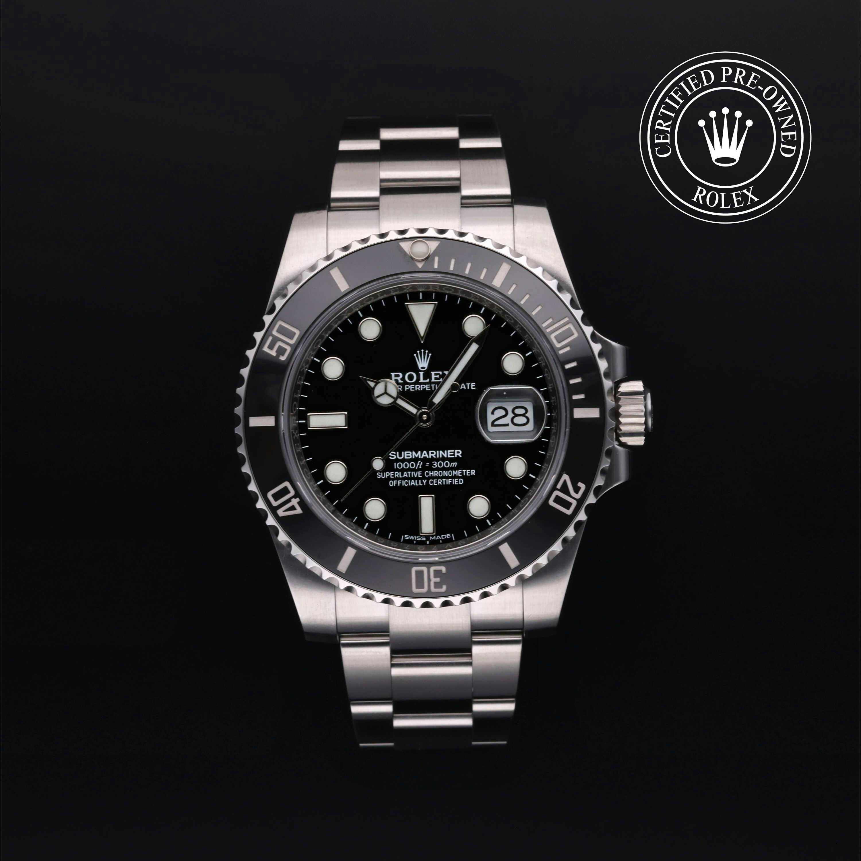 Rolex Certified Pre-Owned Submariner Date (116610LN) self - winding automatic watch, features a 40mm stainless steel case with a black cerachrom bezel surrounding a black dial on a stainless steel oyster bracelet. Functions include hours, minutes, seconds and date. This watch has received Rolex-authorized service and certification. It comes with the original box and papers, and includes a custom Rolex Certified Pre-Owned hang tag, travel pouch and RCPO international warranty card.